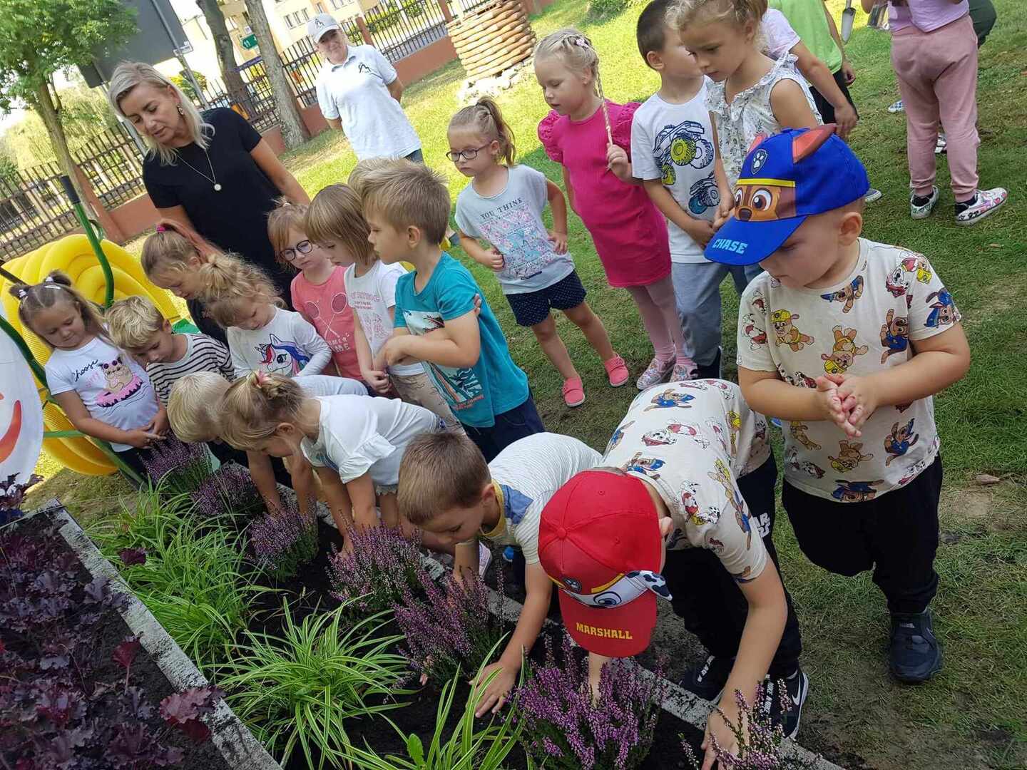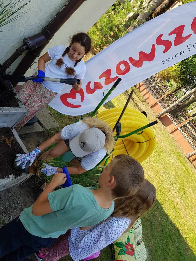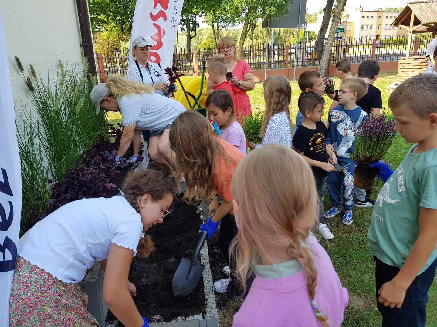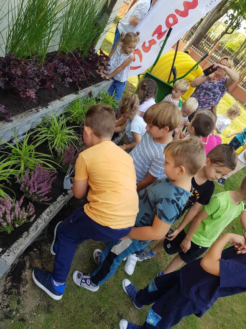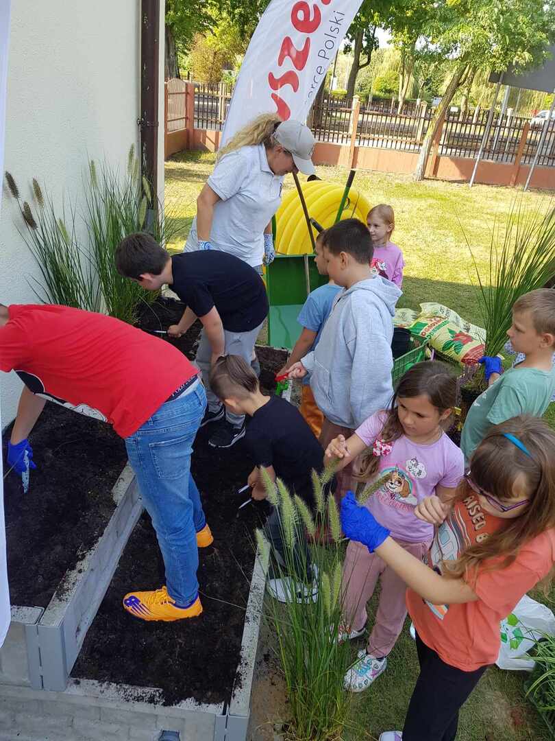 Uczniowie wraz z wolontariuszami Fundacji "Bez Granic" i nauczycielami sadzili piękne rośliny na rabatach podlewanych dzięki systemowi odprowadzania wody deszczowej.