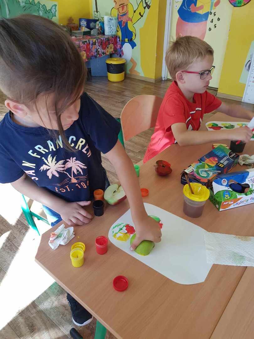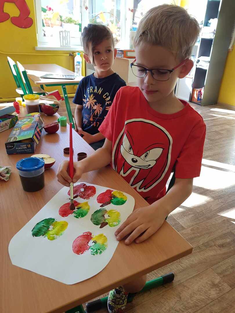 Nie zabrakło komiksów i opowieści. Na koniec wykonaliśmy prace plastyczne - słoik z jabłkami przy pomocy naturalnych stempelków.