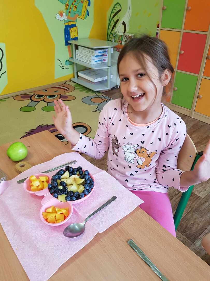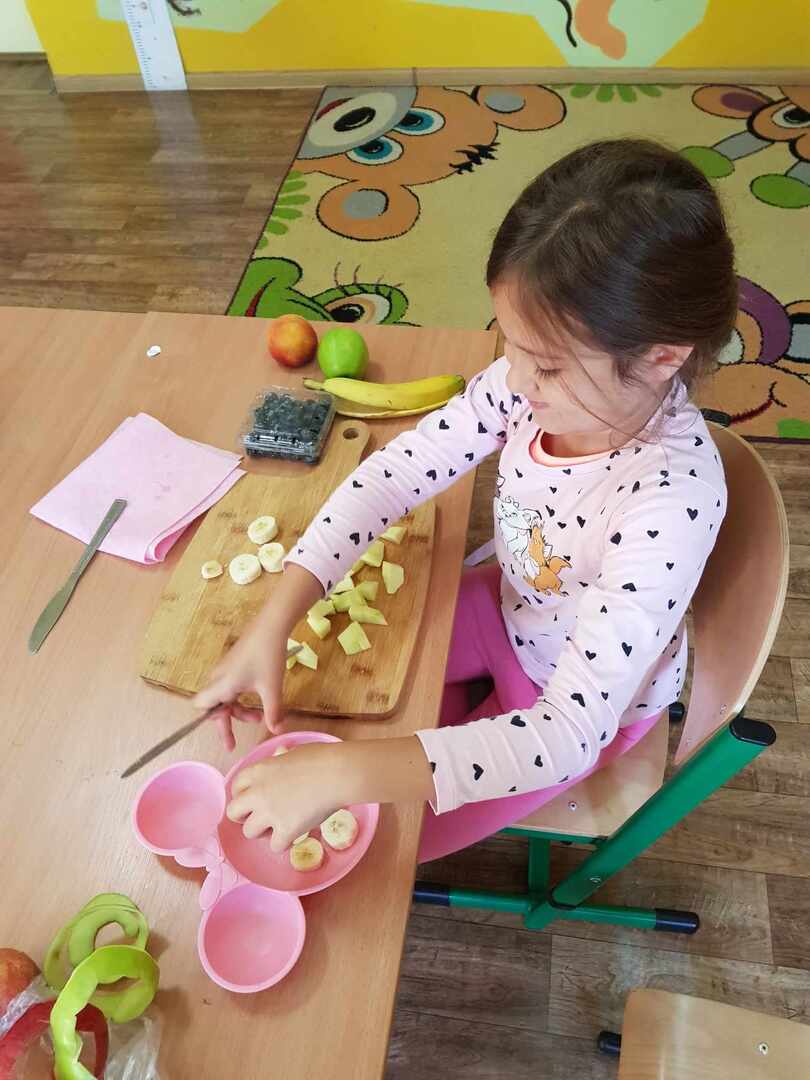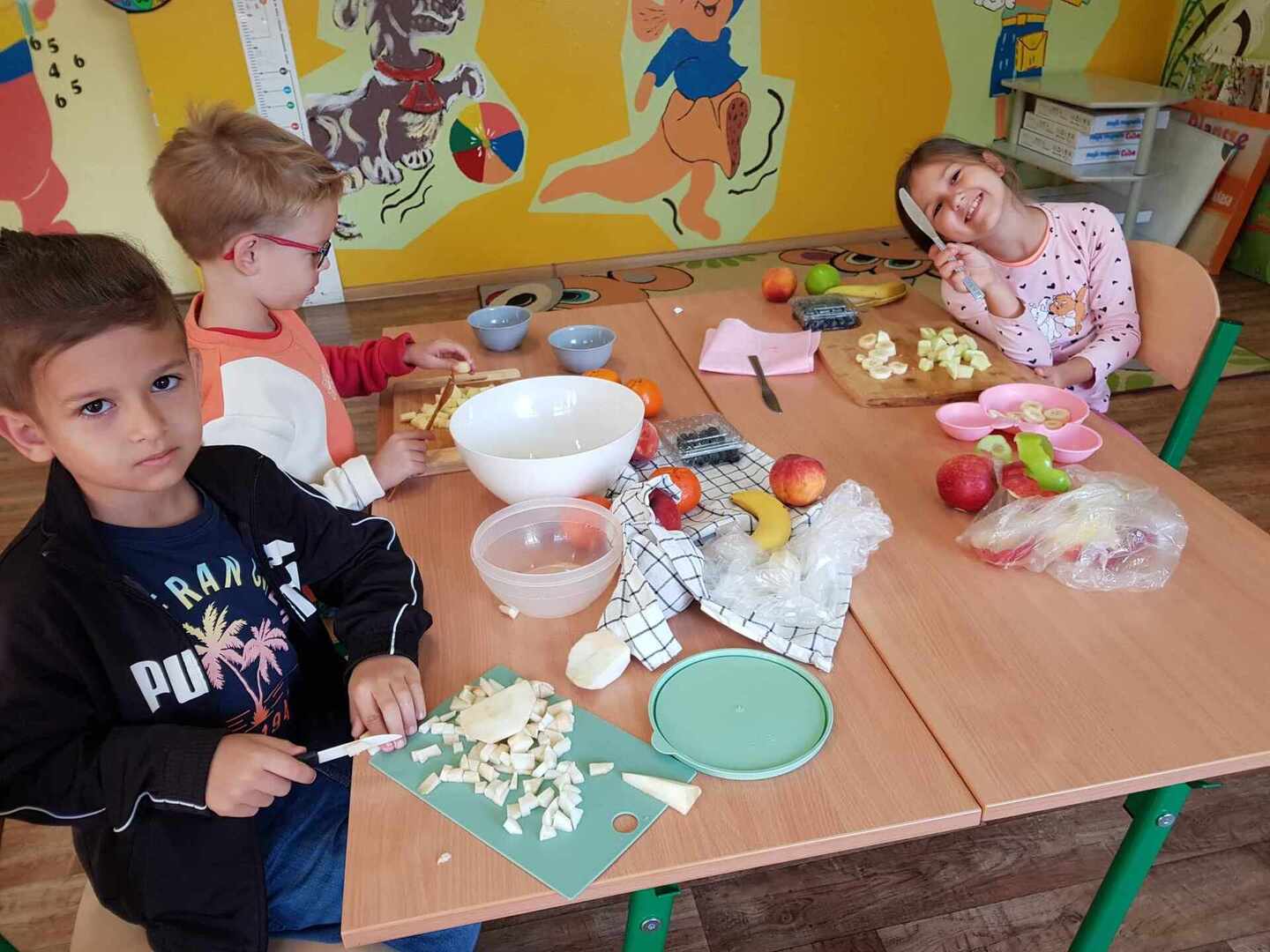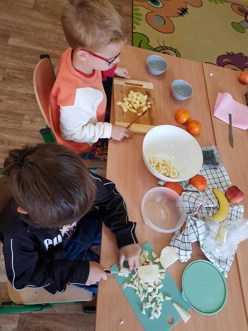 Pierwszaki od samego rana zabrały się za zajęcia kulinarne - wykonywaliśmy sałatkę owocową z jabłkiem w roli głównej.