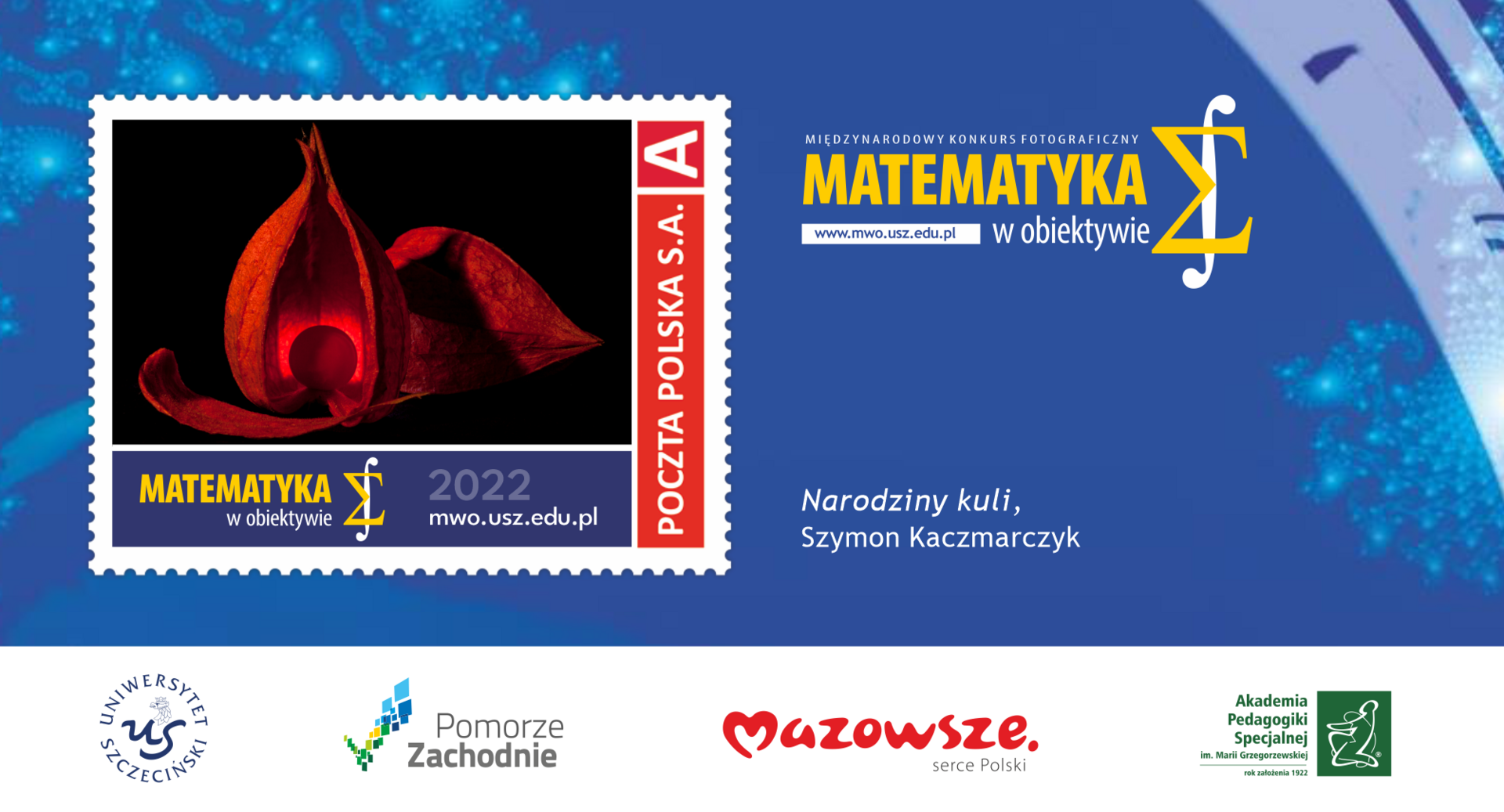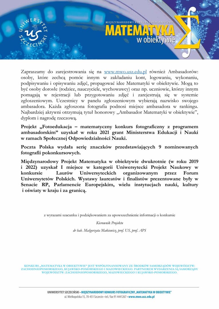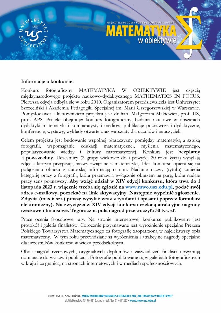 Konkurs fotograficzny MATEMATYKA W OBIEKTYWIE jest częścią międzynarodowego projektu naukowo-dydaktycznego MATHEMATICS IN FOCUS. Pierwsza edycja odbyła się w roku 2010. Organizatorem przedsięwzięcia jest Uniwersytet Szczeciński i Akademia Pedagogiki Specjalnej im. Marii Grzegorzewskiej w Warszawie. Pomysłodawcą i kierownikiem projektu jest dr hab. Małgorzata Makiewicz, prof. US, prof. APS. Projekt obejmuje: konkurs fotograficzny, badania naukowe w obszarach dydaktyki matematyki i komparatystyki mediów, publikacje poznawcze i dydaktyczne, konferencje, wystawy, wykłady otwarte oraz warsztaty dla uczniów i nauczycieli. Celem projektu jest budowanie wspólnej płaszczyzny pomiędzy matematyką a sztuką fotografii, wspomaganie edukacji matematycznej, myślenia matematycznego, popularyzowanie wiedzy i kultury matematycznej. Konkurs jest bezpłatny i powszechny. Uczestnicy (2 grupy wiekowe: do i powyżej 20 roku życia) wysyłają zdjęcia którym przypisują nazwy związane z matematyką. Idea konkursu opiera się na połączeniu obrazu z autorską informacją o nim. Nadanie nazwy (tytułu) zmienia kategorię pracy z fotografii, która przemawia wyłącznie obrazem na parę, która nadaje pracy sens poznawczy. Aby wziąć udział w XIV edycji konkursu, która trwa do 1 listopada 2023 r. włącznie trzeba się zgłosić na www.mwo.usz.edu.pl, podać swój adres e-mailowy, poczekać na link aktywacyjny. Następnie wypełnić zgłoszenie. Zdjęcia (max 6 szt.) proszę wysyłać wraz z tytułami i opisami poprzez formularz elektroniczny). Na zwycięzców XIV edycji konkursu czekają atrakcyjne nagrody rzeczowe i finansowe. Tegoroczna pula nagród przekroczyła 30 tys. zł. Prace ocenia 8-osobowe jury. Na stronie internetowej konkursu publikowany jest protokół i galeria finalistów. Corocznie przyznawane jest wyróżnienie specjalne Prezesa Polskiego Towarzystwa Matematycznego za fotografię zaopatrzoną w najciekawszy opis matematyczny. W tym roku przewidziane są wyróżnienia i atrakcyjne nagrody specjalne dla uczestników konkursu w wieku przedszkolnym. Obok nagród rzeczowych, oryginalnych dyplomów i zaświadczeń finaliści otrzymują nominacje do wystaw i publikacji. Fotografie publikowane są w galeriach fotograficznych w kraju i za granicą, na stronach internetowych i w mediach społecznościowych.