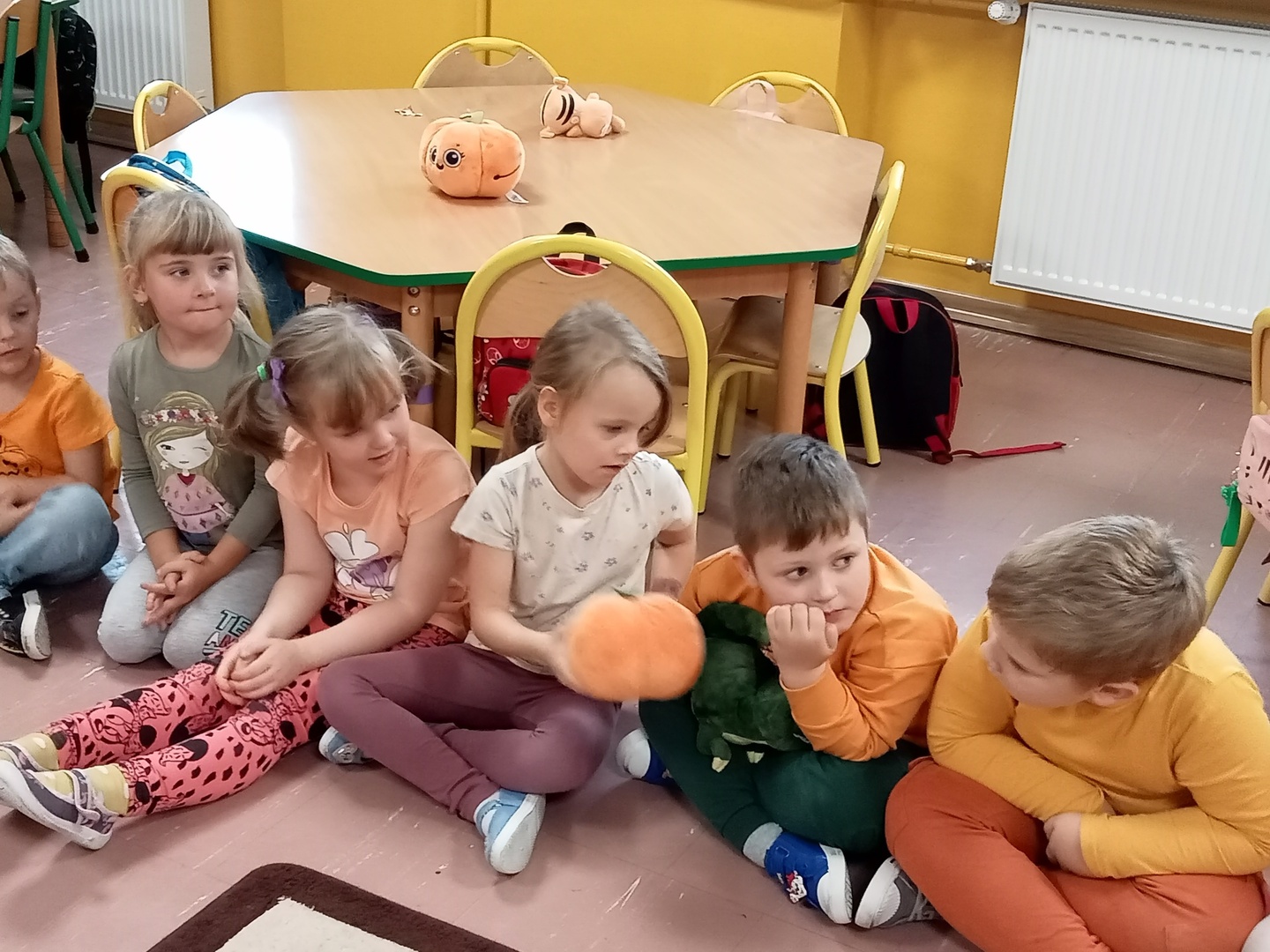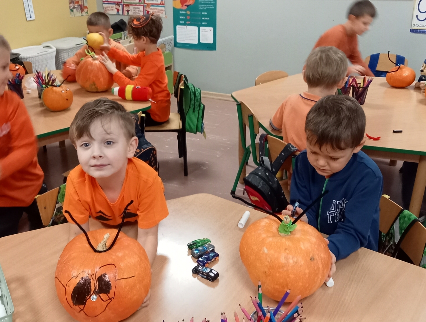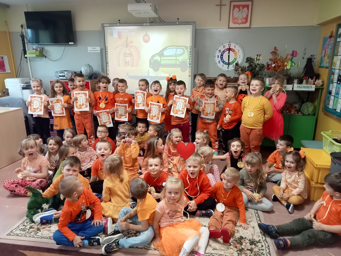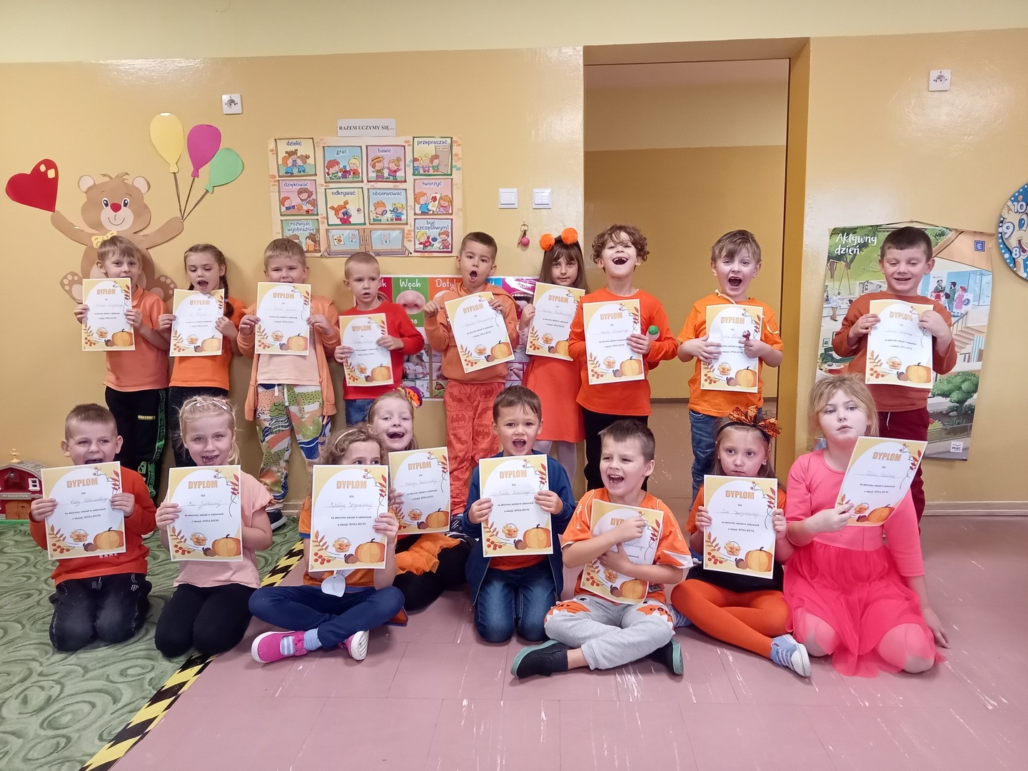 Wspólnie uczestniczyliśmy w zajęciach, podczas których poznaliśmy bardzo zdrowe i urodziwe warzywo jakim jest dynia. Tego dnia przynieśliśmy do przedszkola dynie i ubraliśmy się na kolor pomarańczowy. Spędziliśmy czas na wielu zabawach. Uczyliśmy się rymowanki o dyni, słuchaliśmy wiersza, układaliśmy dyniowe puzzle, bawiliśmy się w zręczne rączki, które ozdabiały dynię, poznawaliśmy potrawy, które można zrobić z dyni.