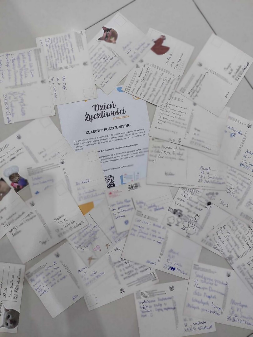 Postcrossing to międzynarodowy projekt, który umożliwia użytkownikom wysyłanie i otrzymywanie pocztówek od innych użytkowników na całym świecie. Projekt ten został założony w 2005 roku przez studenta z Portugalii, Paulo Magalhães. Przez lata, Postcrossing zgromadził społeczność miłośników pocztówek z całego świata, dzieląc się zarówno chwilami codziennego życia, jak i unikalnymi widokami z różnych zakątków globu. Uczniowie klasy 6B wysłali za pomocą "szkolnego kuriera" (dziękujemy Judytka 🥰) pocztówki z krótkimi pozdrowieniami dla ich rówieśników ze szkoły w Smólniku.