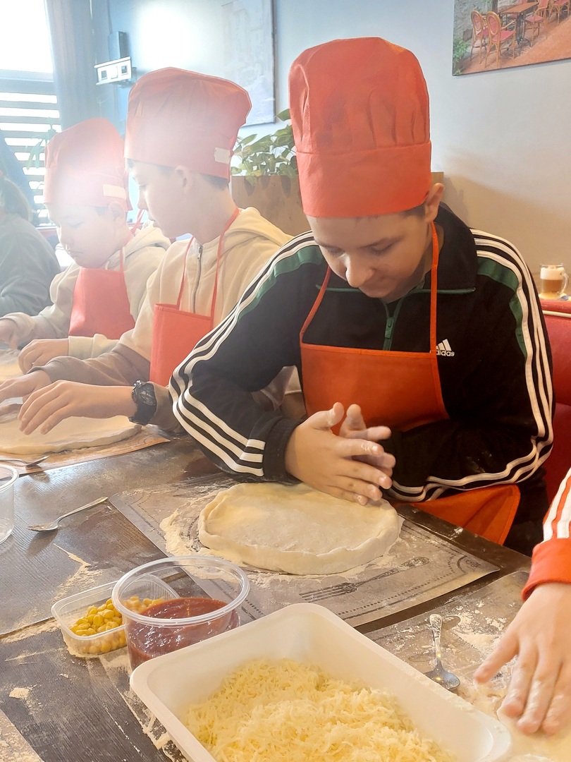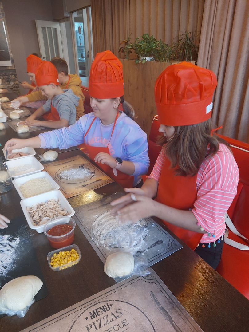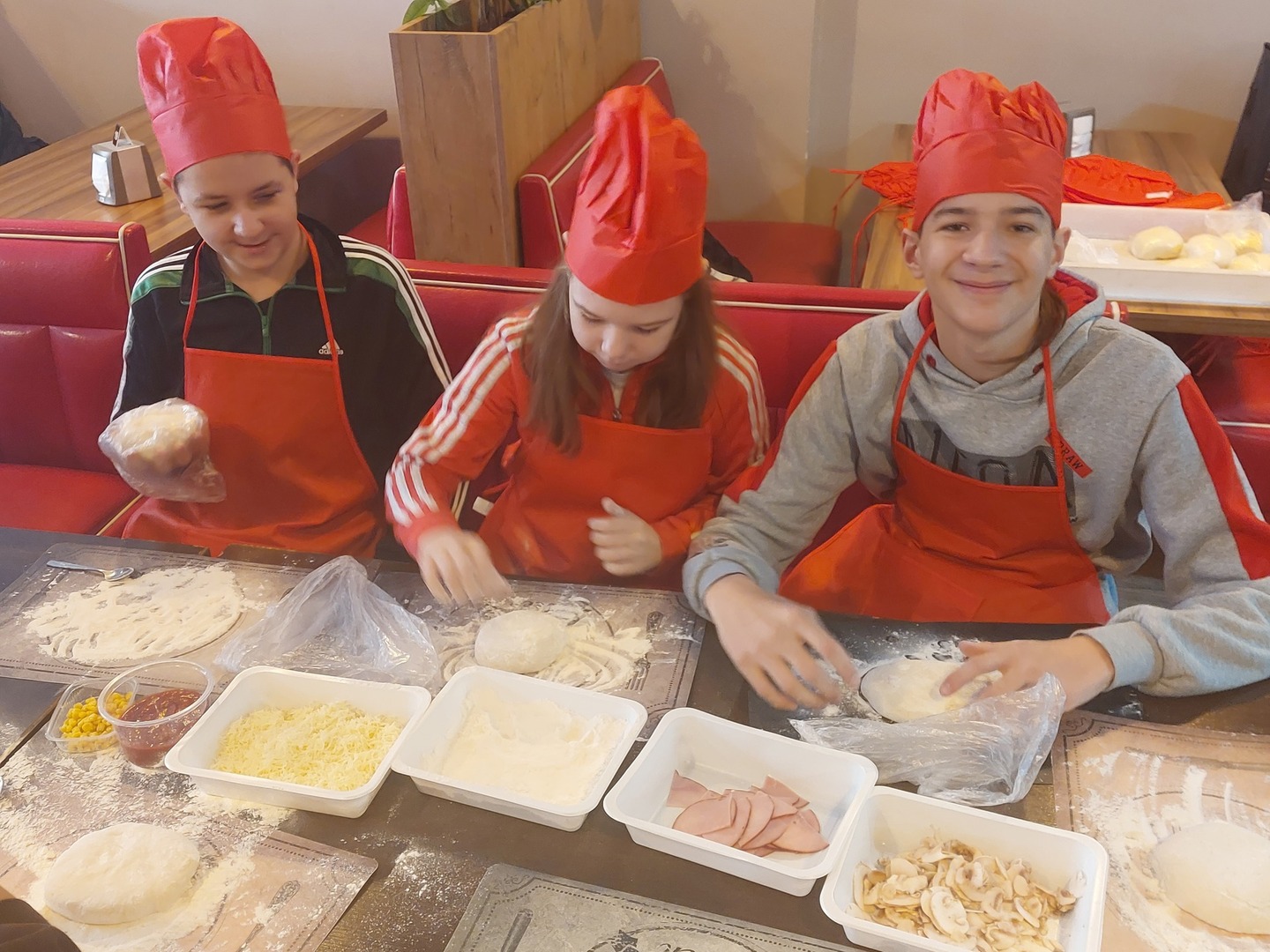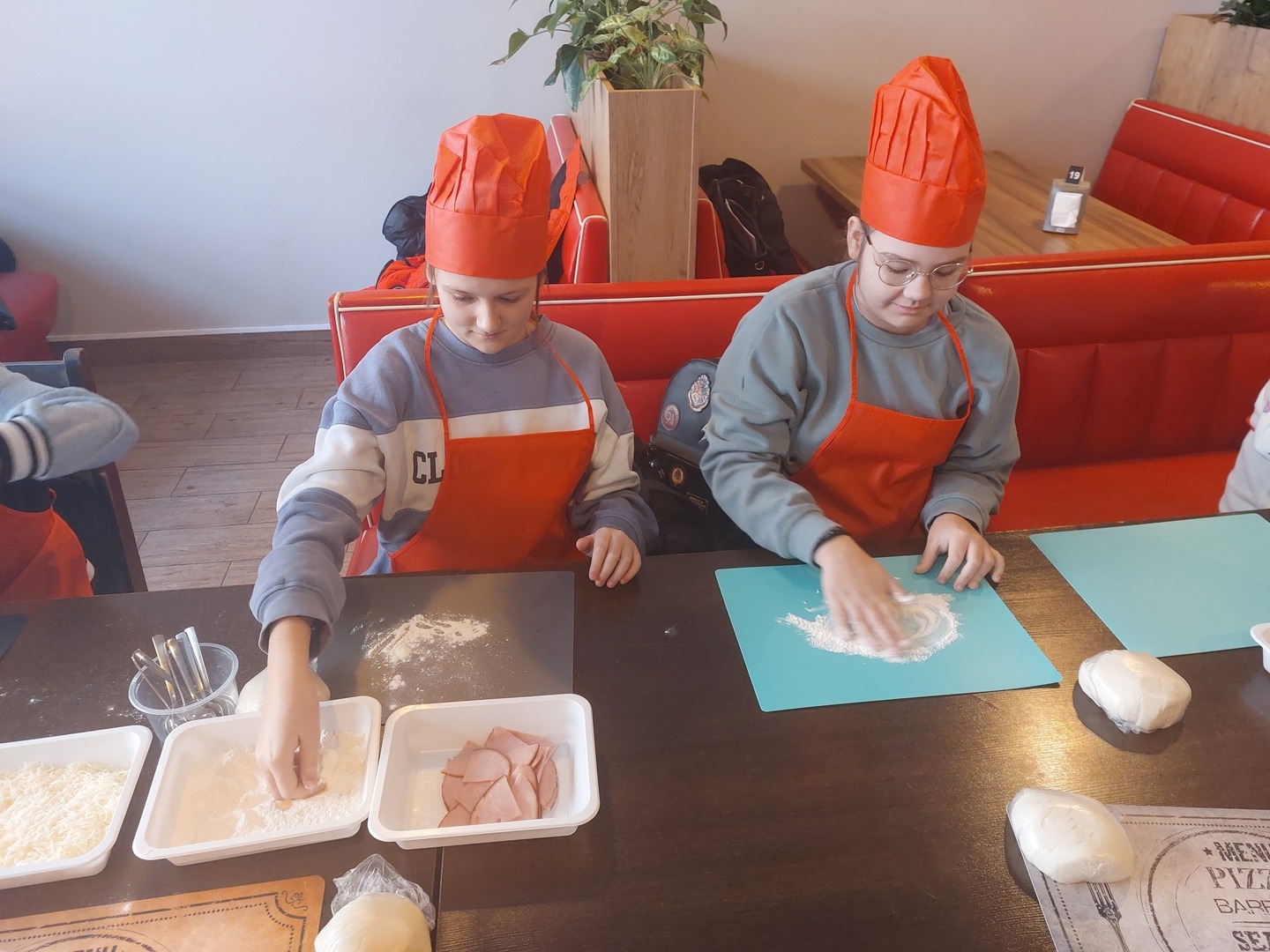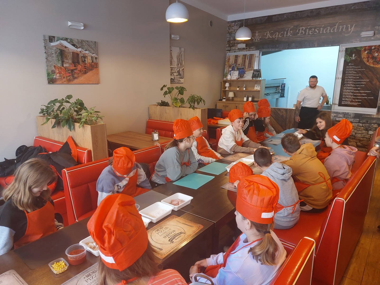 Z tej okazji wybrali się na warsztaty kulinarne do restauracji "Kącik Biesiadny" we Włocławku. Celem wycieczki było zapoznanie się z pracą w pizzerii i sposobem przygotowania pizzy, a także uwrażliwienie uczniów na kulturalne zachowanie się w pizzerii.