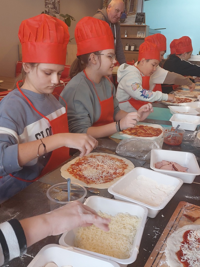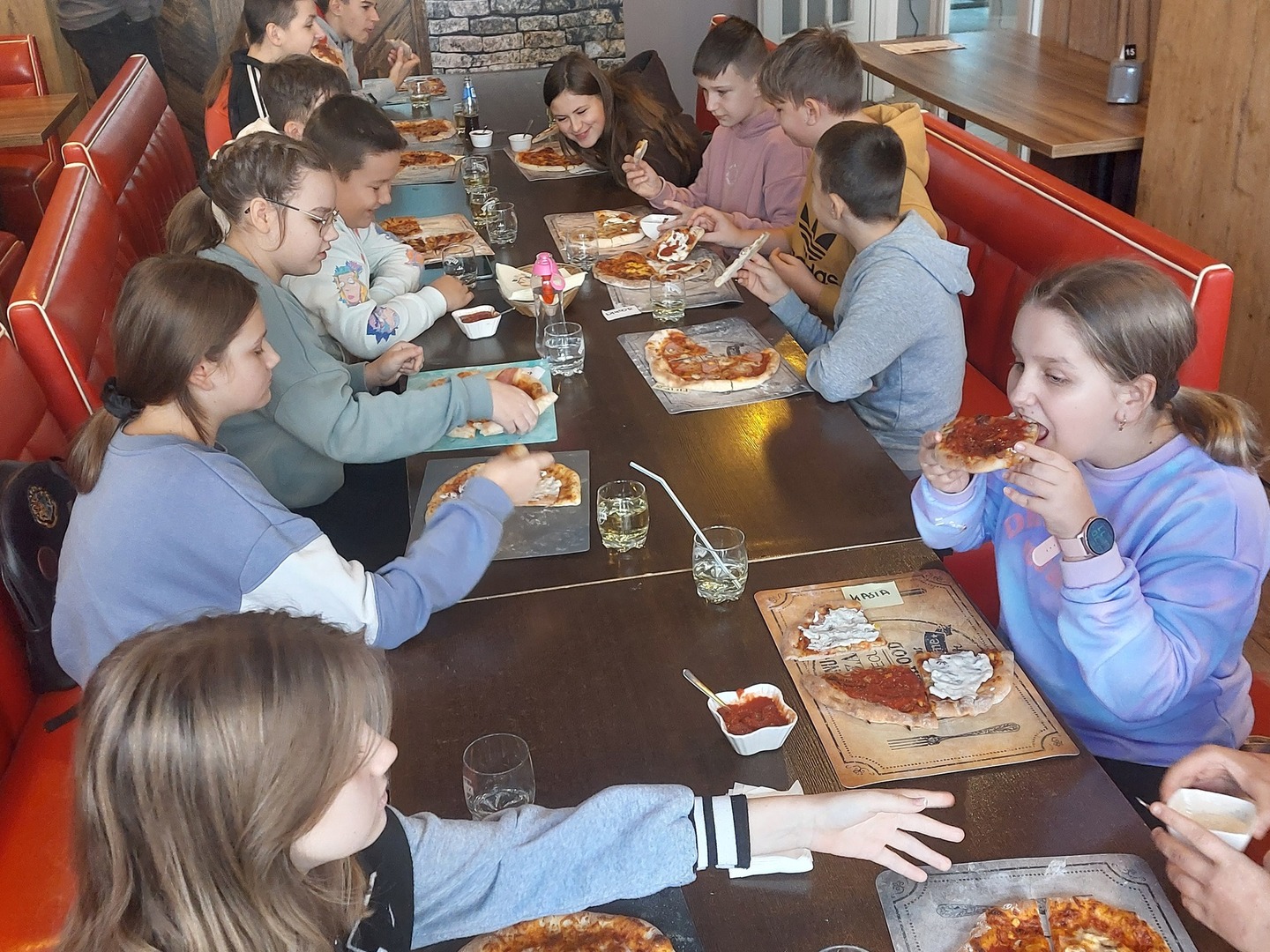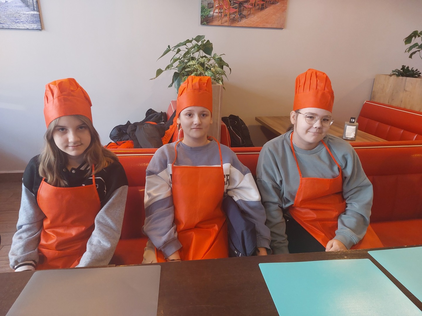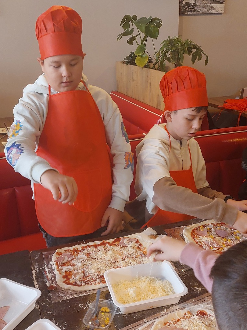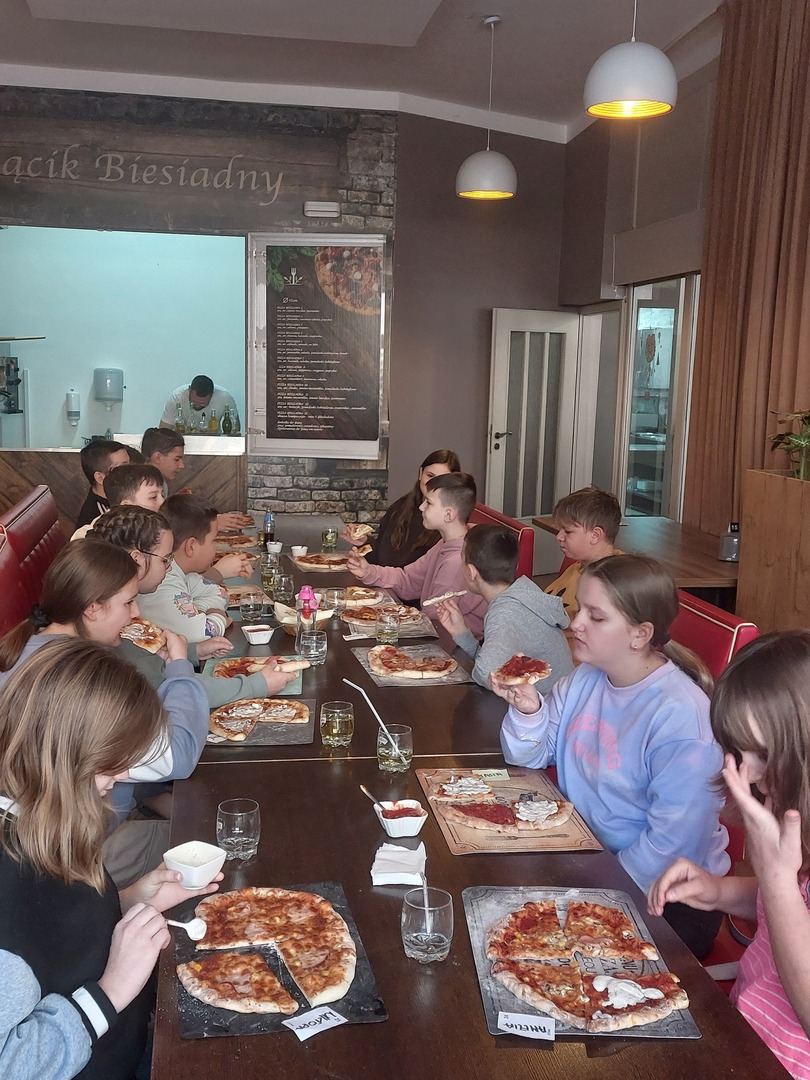 Z tej okazji wybrali się na warsztaty kulinarne do restauracji "Kącik Biesiadny" we Włocławku. Celem wycieczki było zapoznanie się z pracą w pizzerii i sposobem przygotowania pizzy, a także uwrażliwienie uczniów na kulturalne zachowanie się w pizzerii.