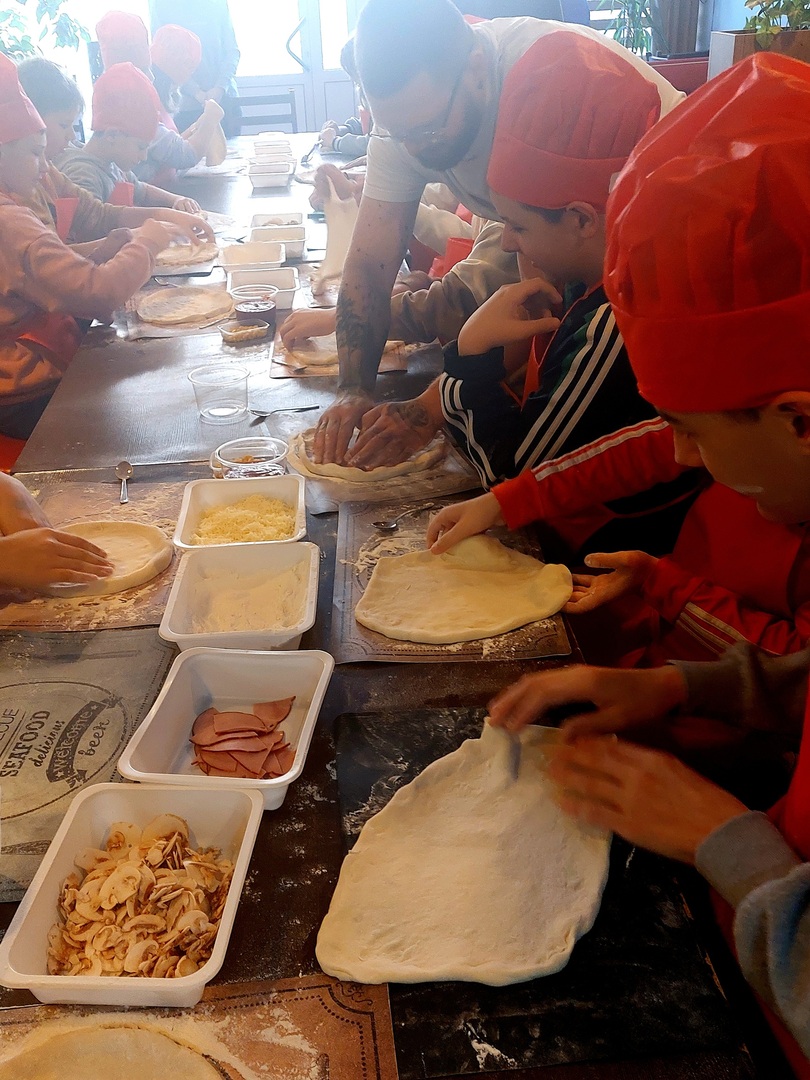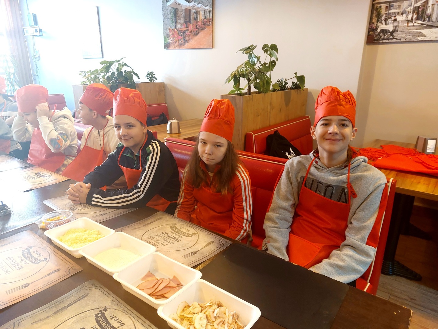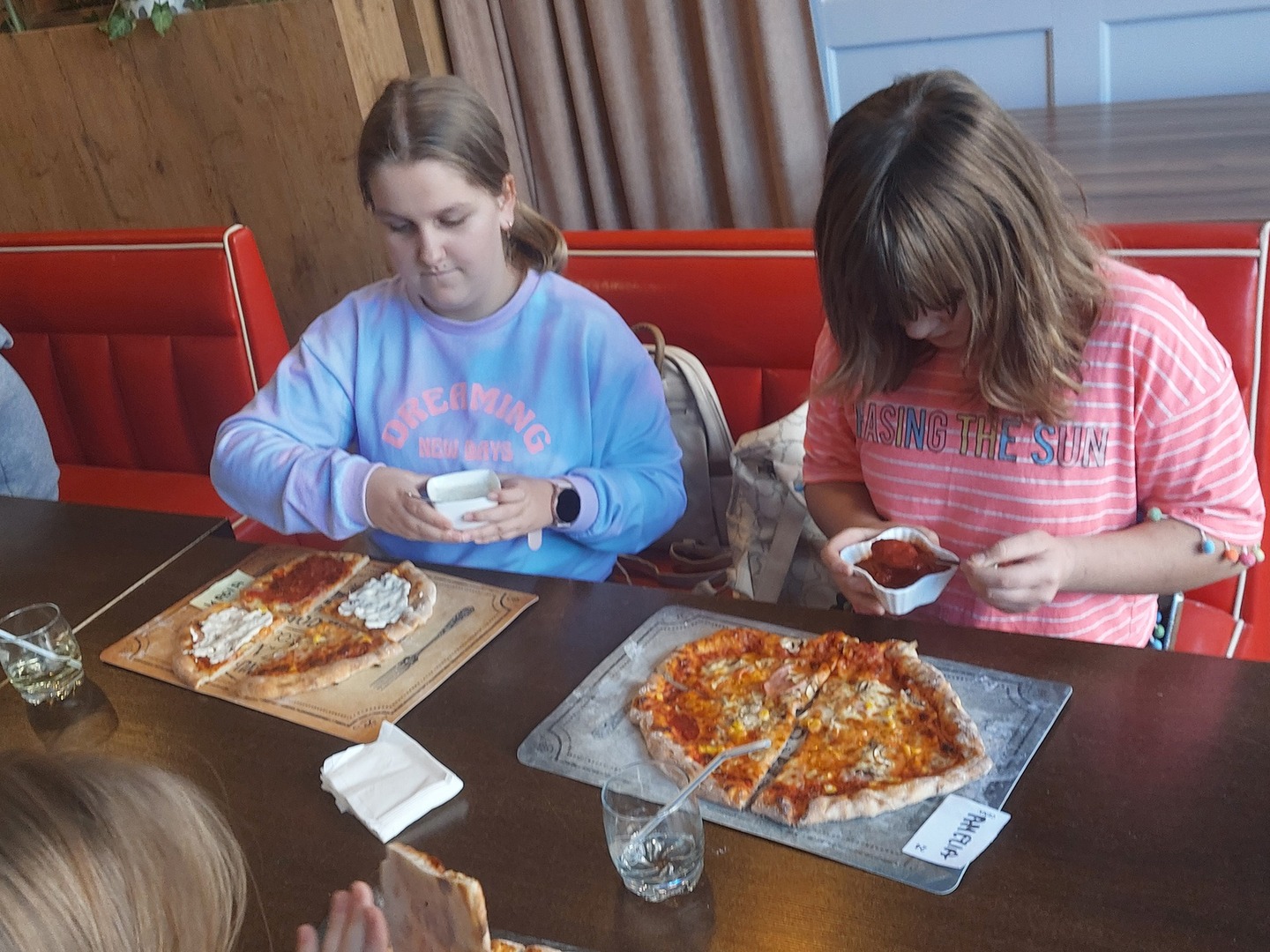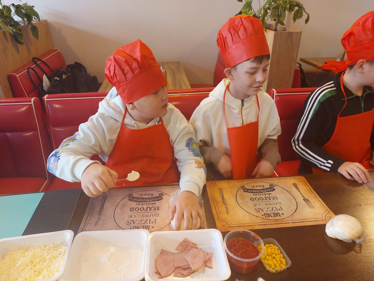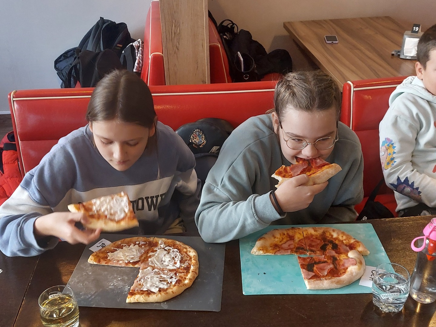 Z tej okazji wybrali się na warsztaty kulinarne do restauracji "Kącik Biesiadny" we Włocławku. Celem wycieczki było zapoznanie się z pracą w pizzerii i sposobem przygotowania pizzy, a także uwrażliwienie uczniów na kulturalne zachowanie się w pizzerii.