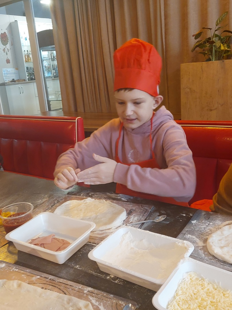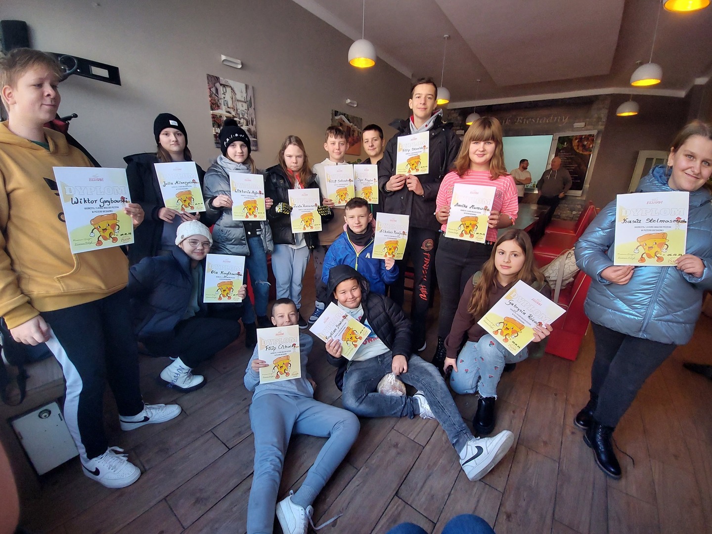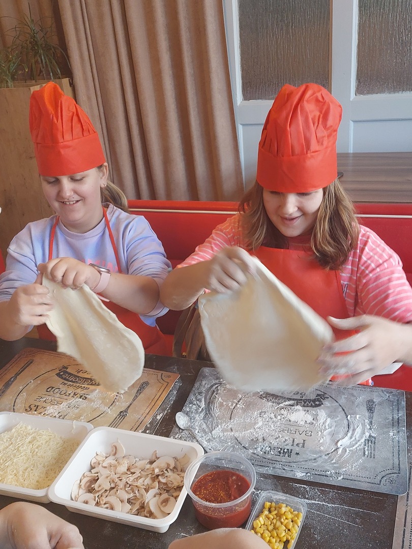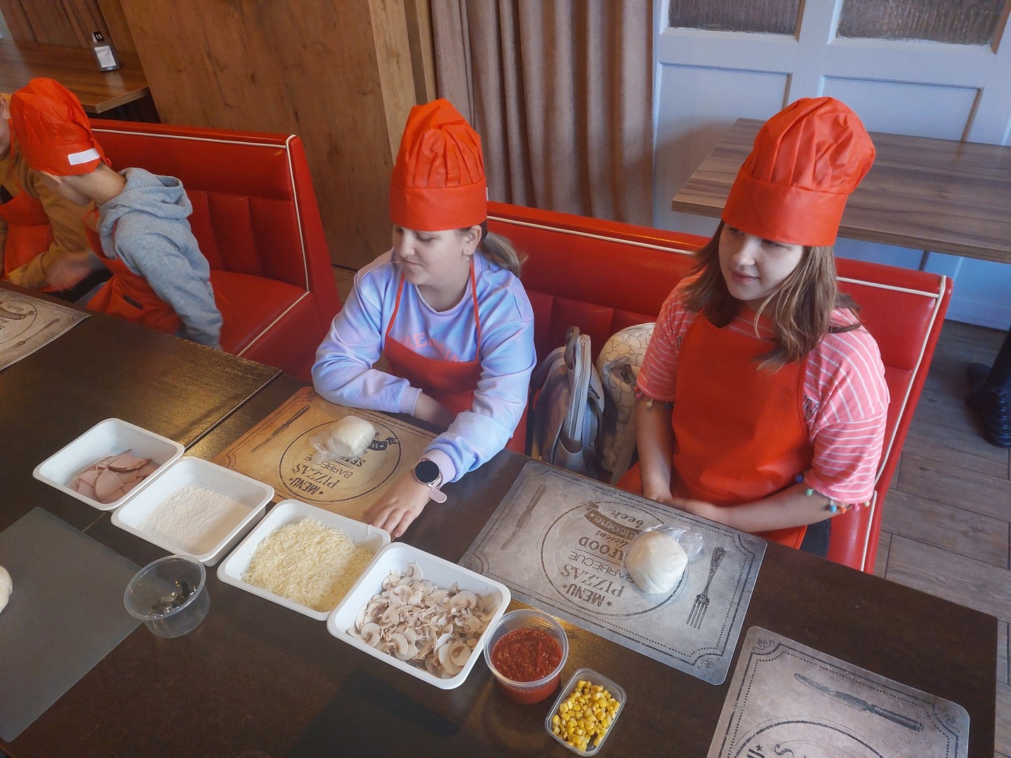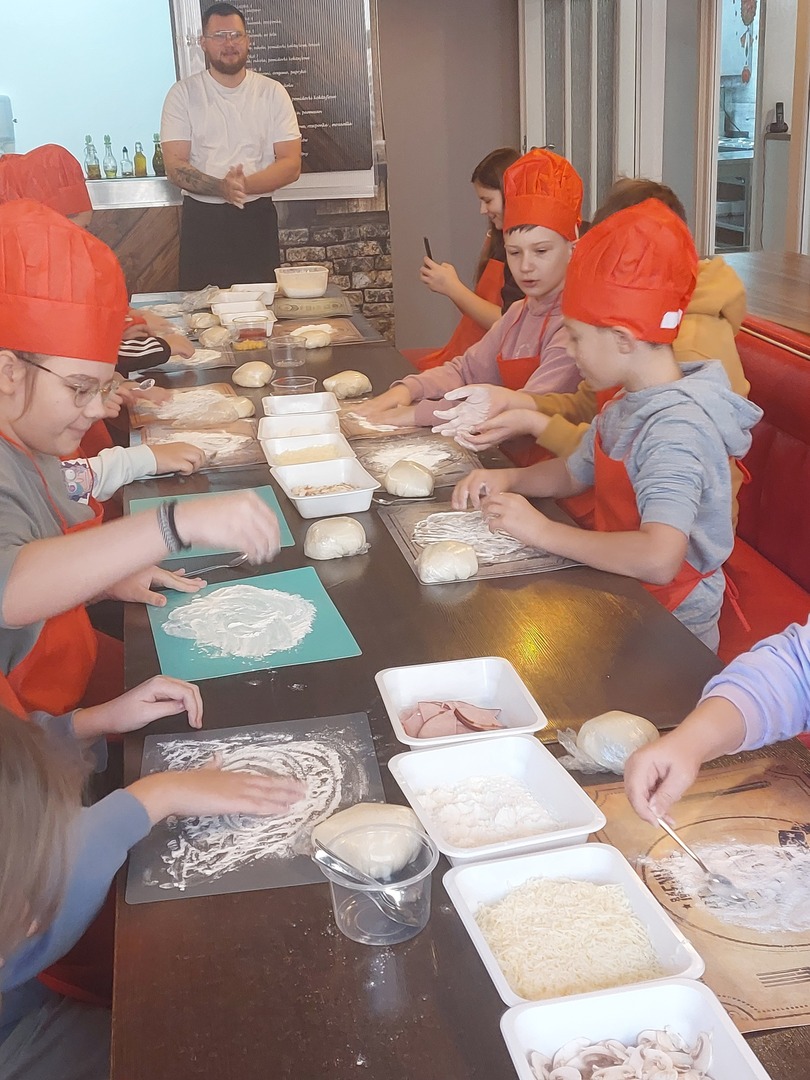 Z tej okazji wybrali się na warsztaty kulinarne do restauracji "Kącik Biesiadny" we Włocławku. Celem wycieczki było zapoznanie się z pracą w pizzerii i sposobem przygotowania pizzy, a także uwrażliwienie uczniów na kulturalne zachowanie się w pizzerii.