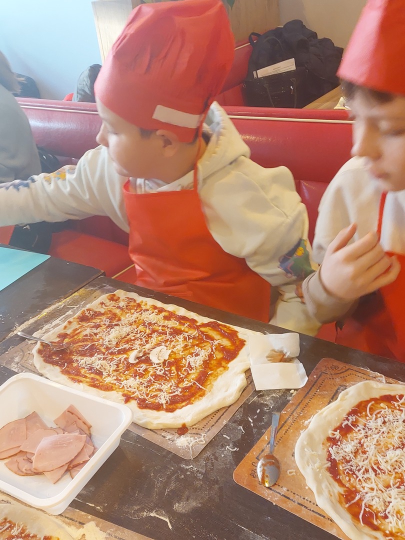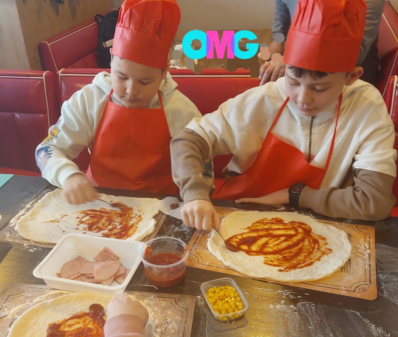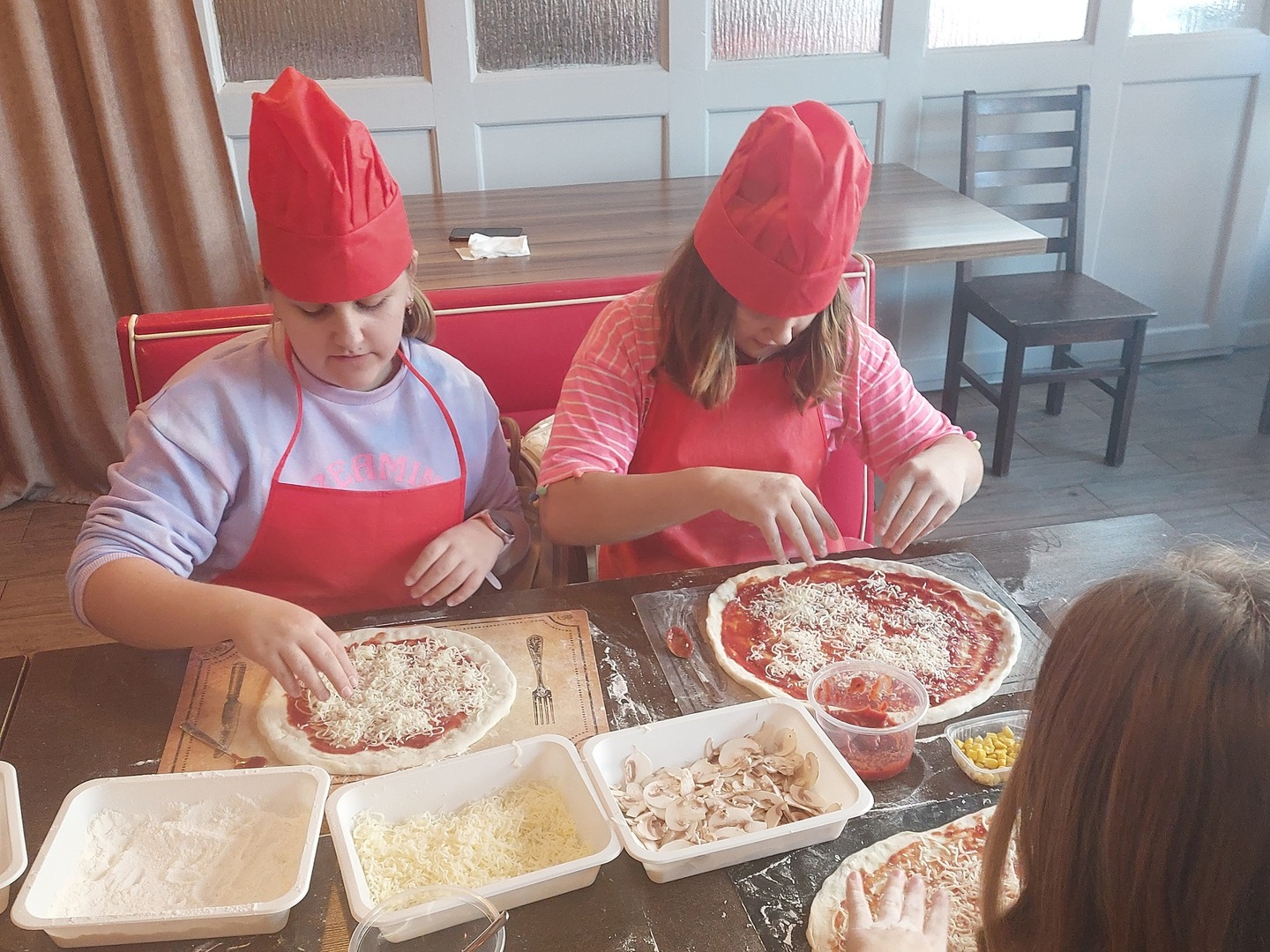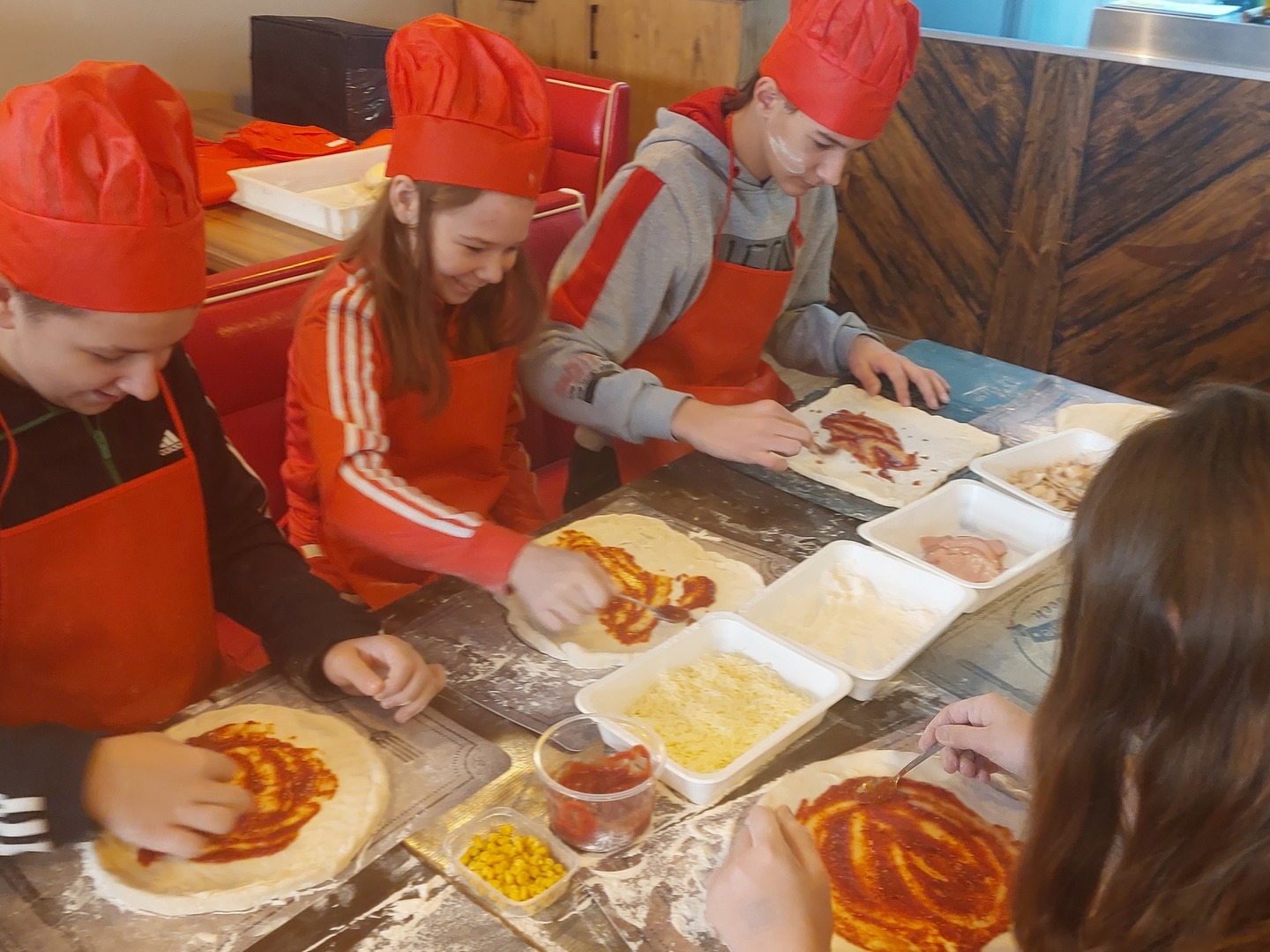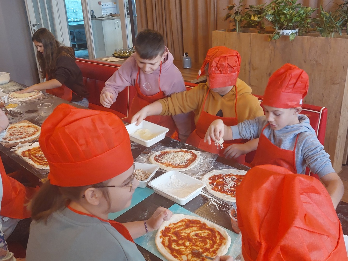 Pracownicy restauracji pokazali nam, jak przygotowywana jest pizza. Po krótkim instruktażu uczniowie zabrali się do robienia swoich własnych wyrobów. Pod bacznym okiem eksperta wałkowali ciasto, smarowali sosem, posypywali serem, a następnie komponowali dodatki według własnego smaku. Uczniowie bardzo poważnie potraktowali zadanie i w wielkim skupieniu zajęli się pracą. Kiedy pizze piekły się w gorącym piecu, dzieci miały czas na przypomnienie zasad właściwego zachowania w pizzerii i kulturalnego sposobu spożywania posiłków. Po upieczeniu przystąpili do degustacji. Wszystkie wypieki wyszły doskonale. Uczniowie jedli z wielkim apetytem przygotowane przez siebie pizze, a na koniec otrzymali pamiątkowe dyplomy.