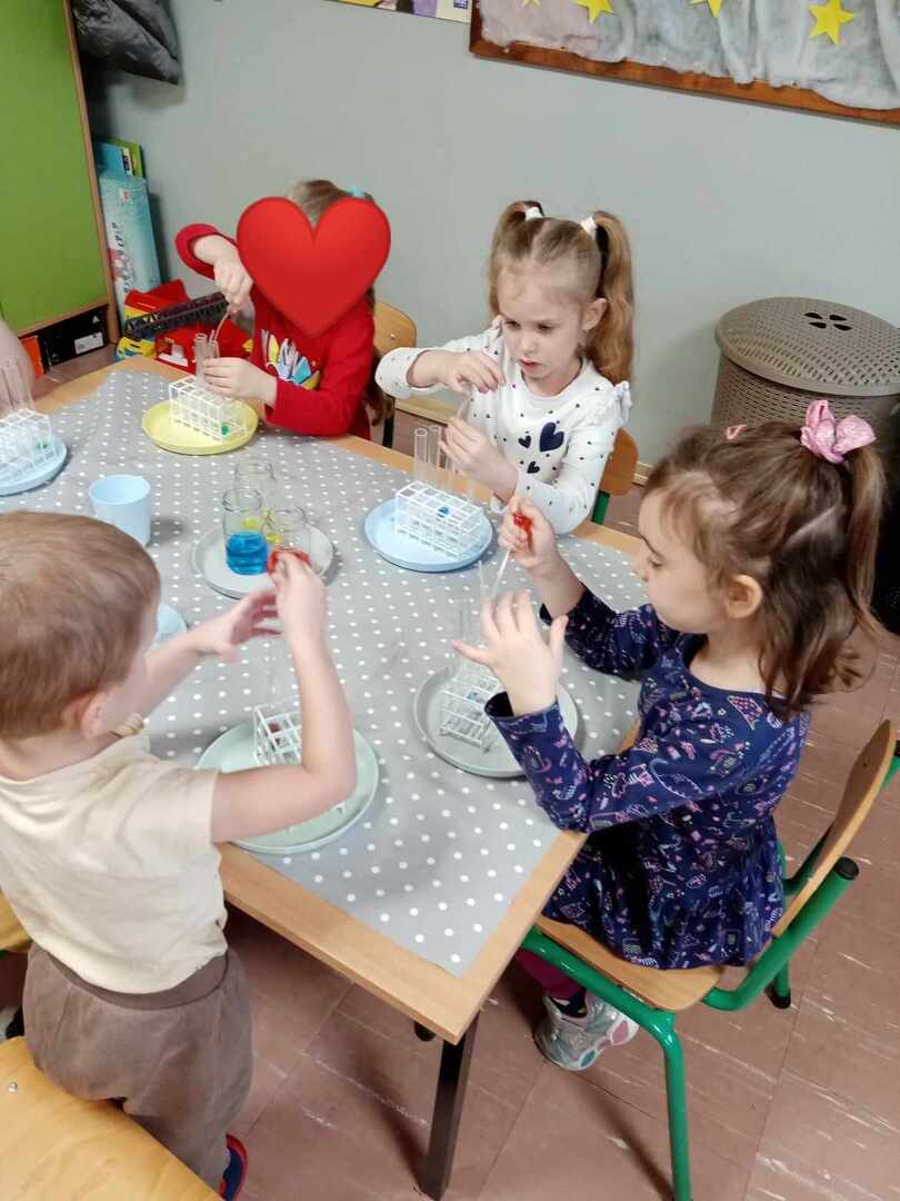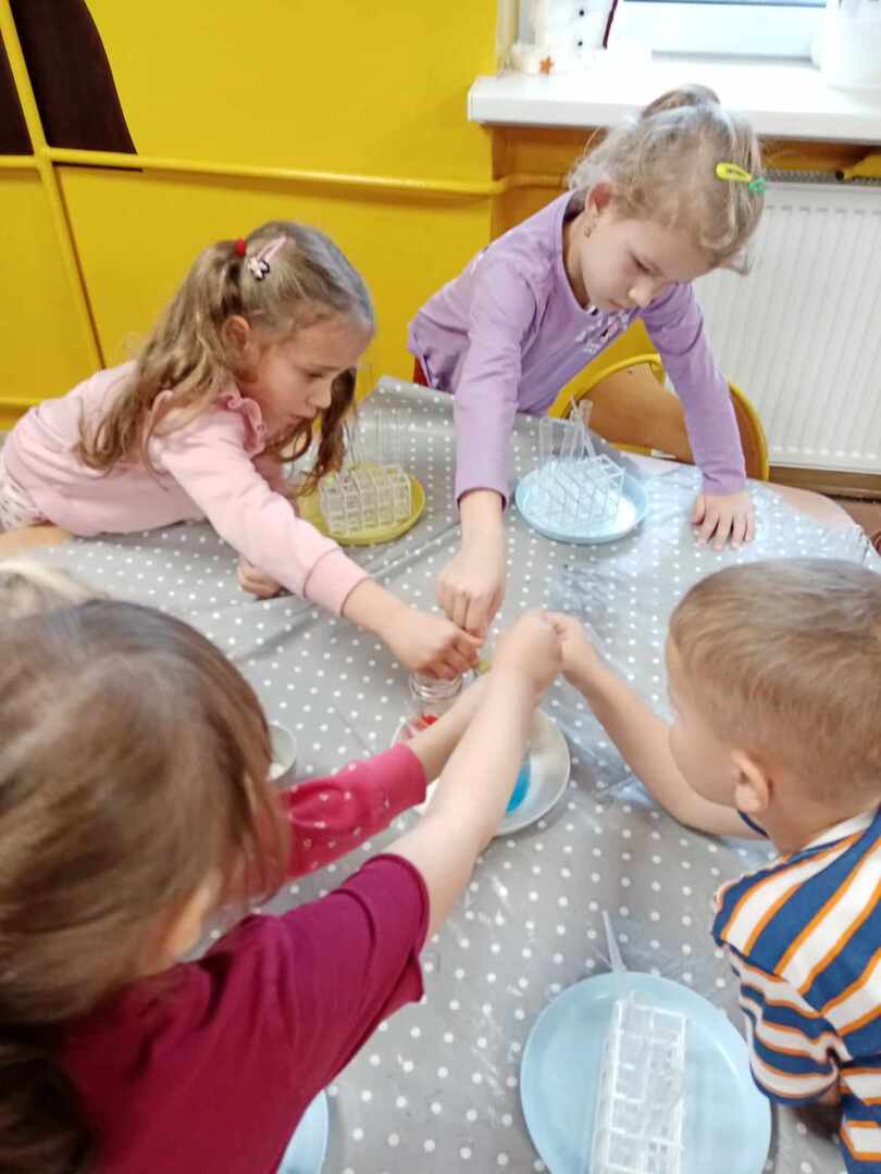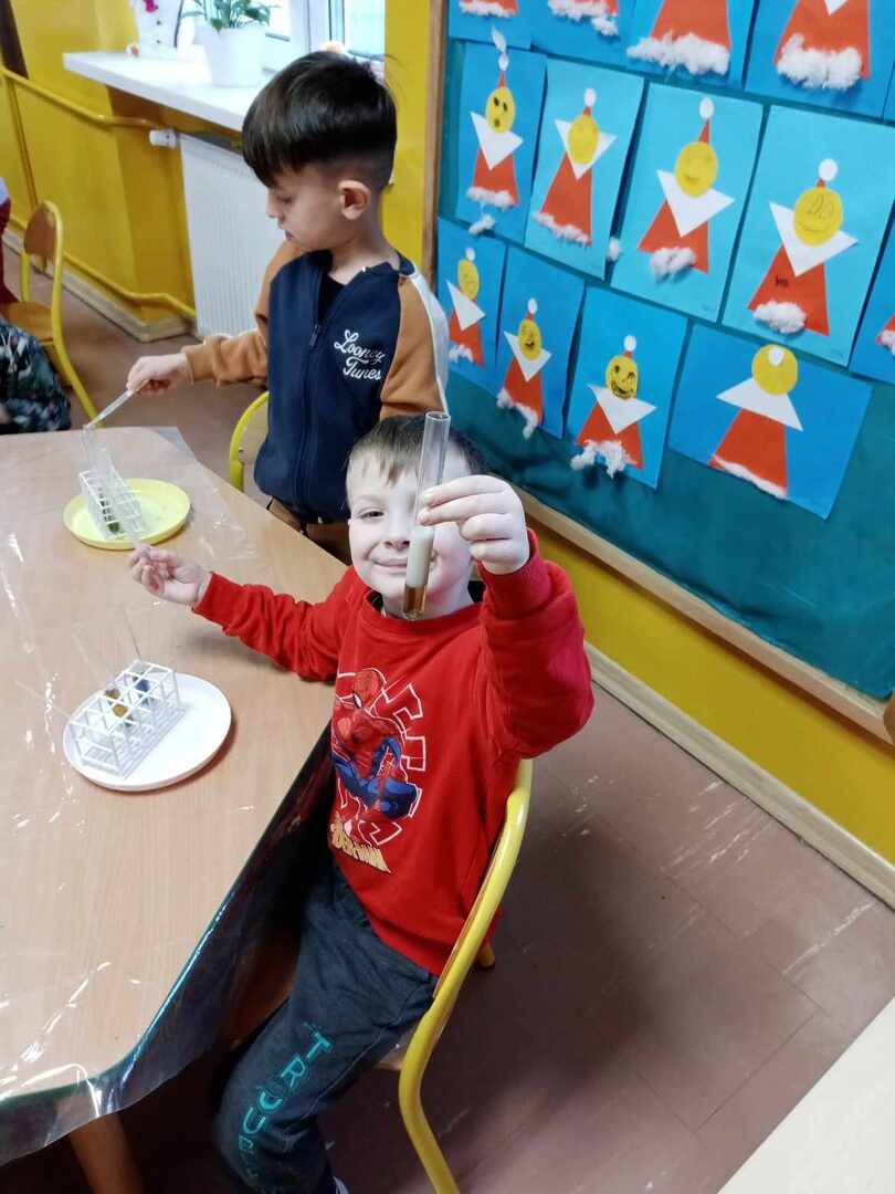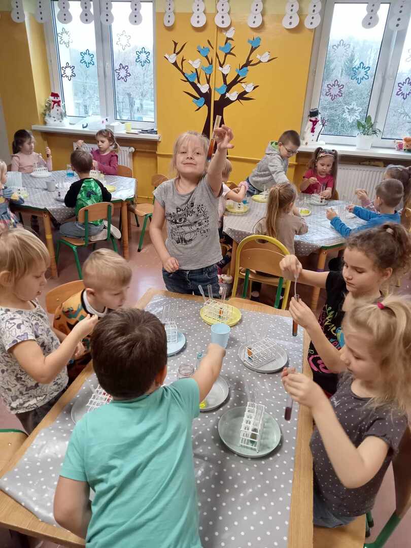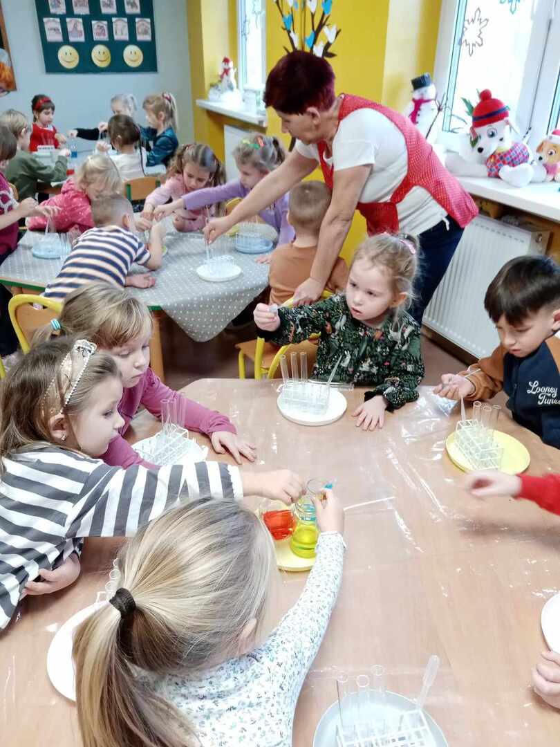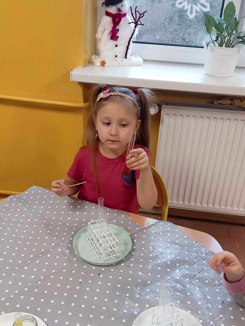 Aktywności, zaproponowane podczas zajęć, nawiązywały tematycznie do zimy. Nasze przedszkolaki mogły również poeksperymentować. Zabawy z kolorami, łączenie kolorów, próby przewidywania jaki kolor powstanie, nazywanie kolorów – to sprawy, którymi zajęliśmy się dziś w naszym przedszkolnym mini laboratorium.