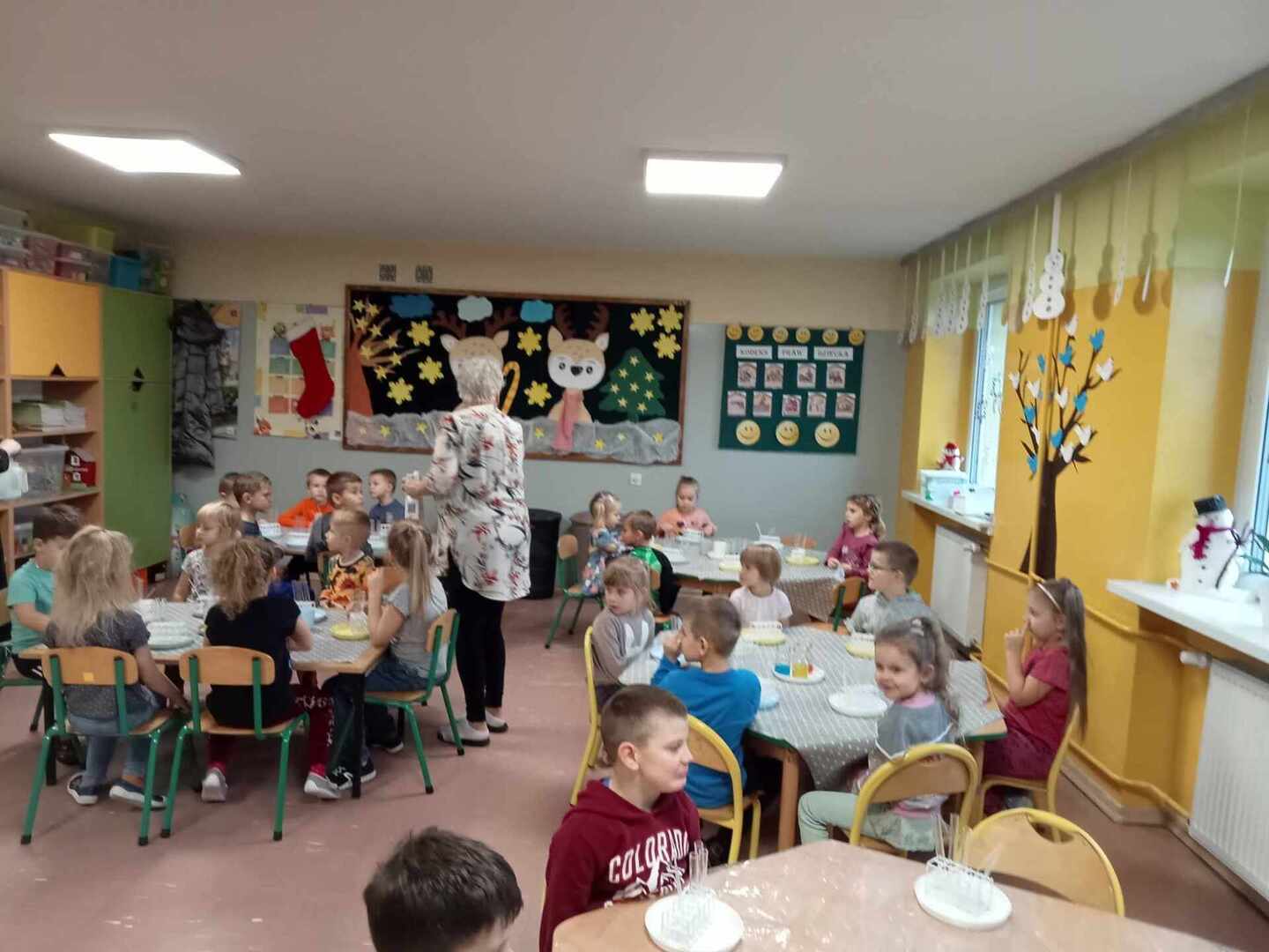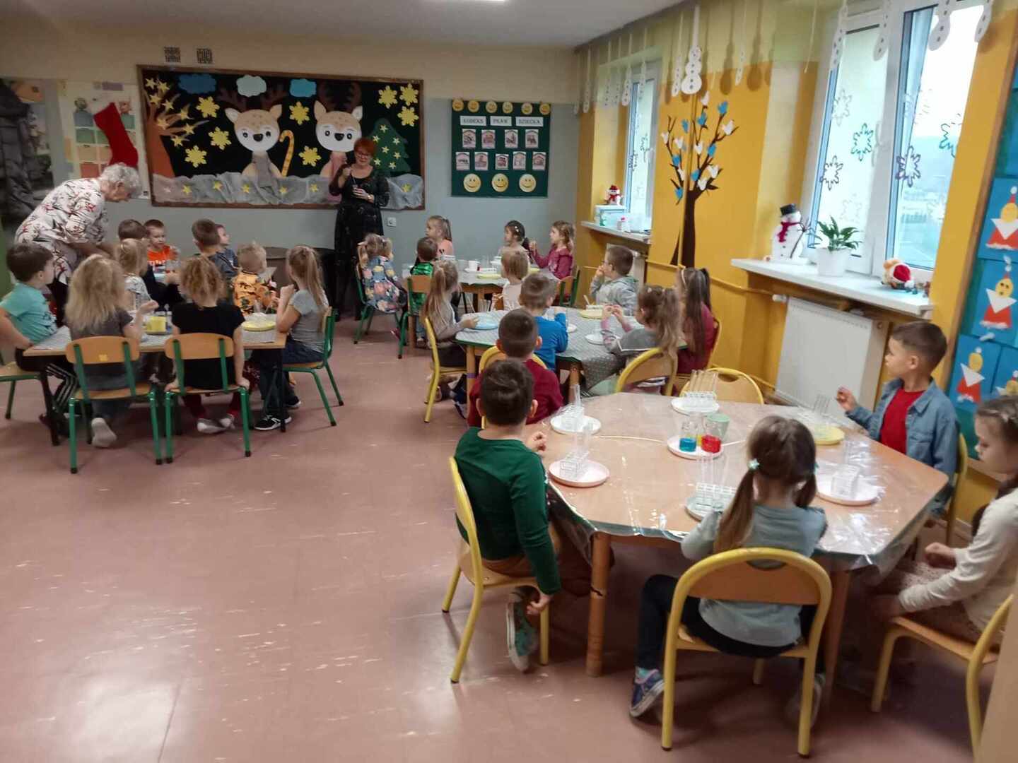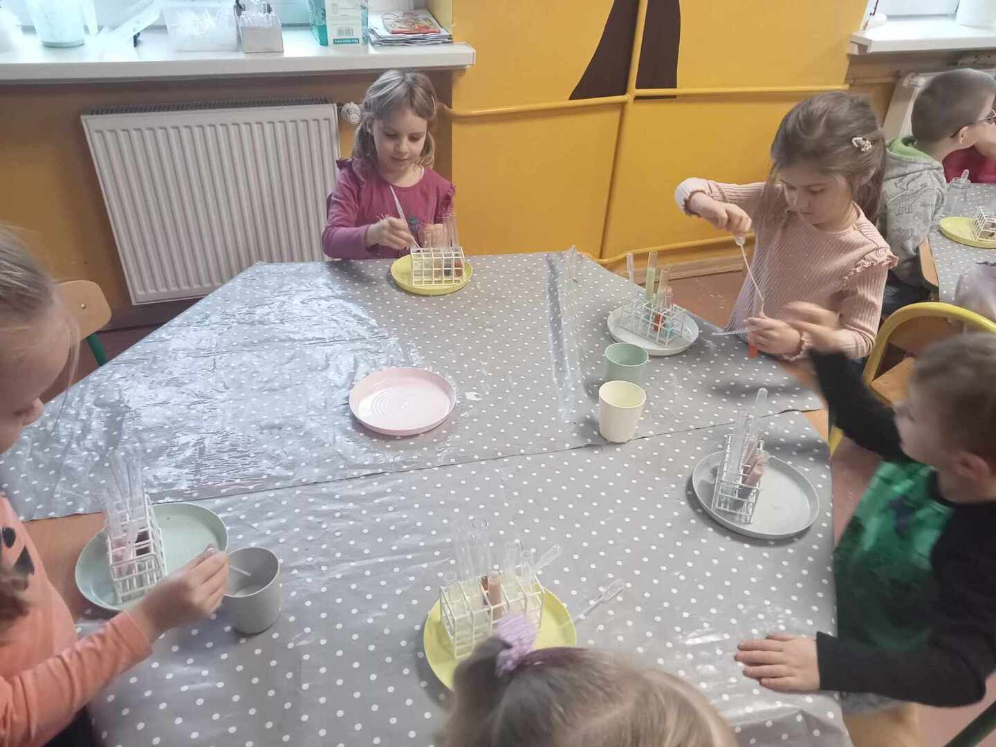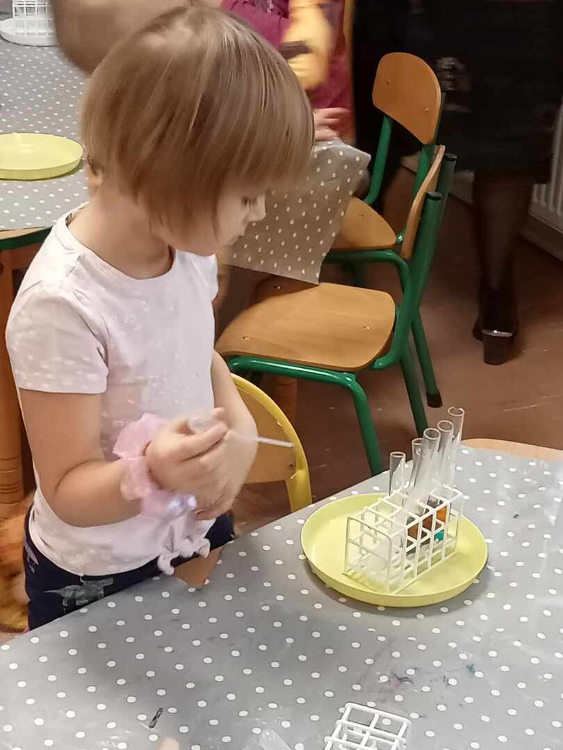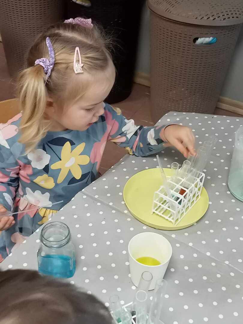 Aktywności, zaproponowane podczas zajęć, nawiązywały tematycznie do zimy. Nasze przedszkolaki mogły również poeksperymentować. Zabawy z kolorami, łączenie kolorów, próby przewidywania jaki kolor powstanie, nazywanie kolorów – to sprawy, którymi zajęliśmy się dziś w naszym przedszkolnym mini laboratorium.