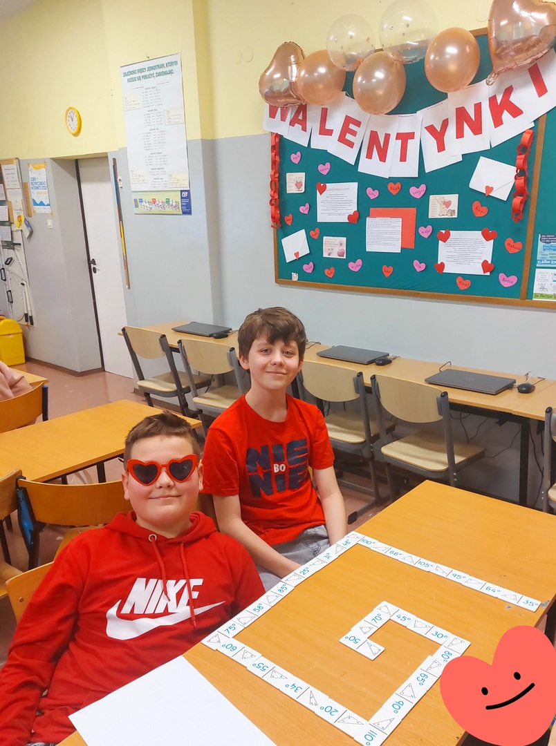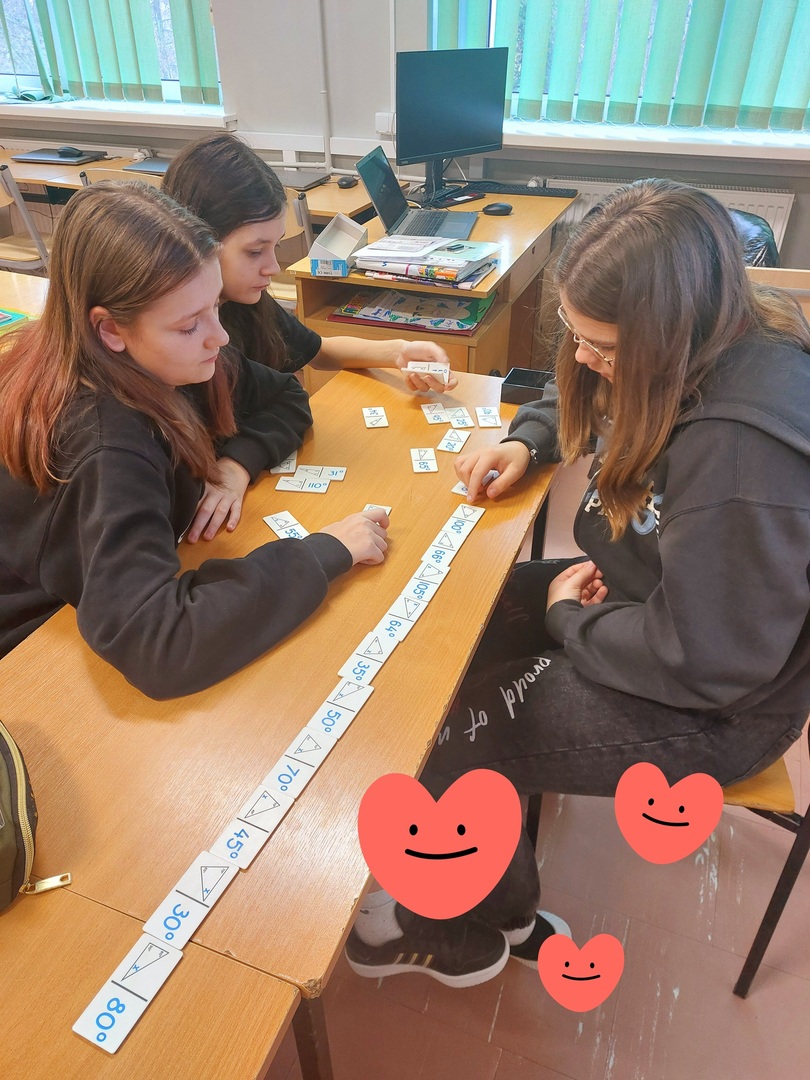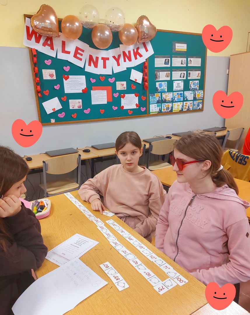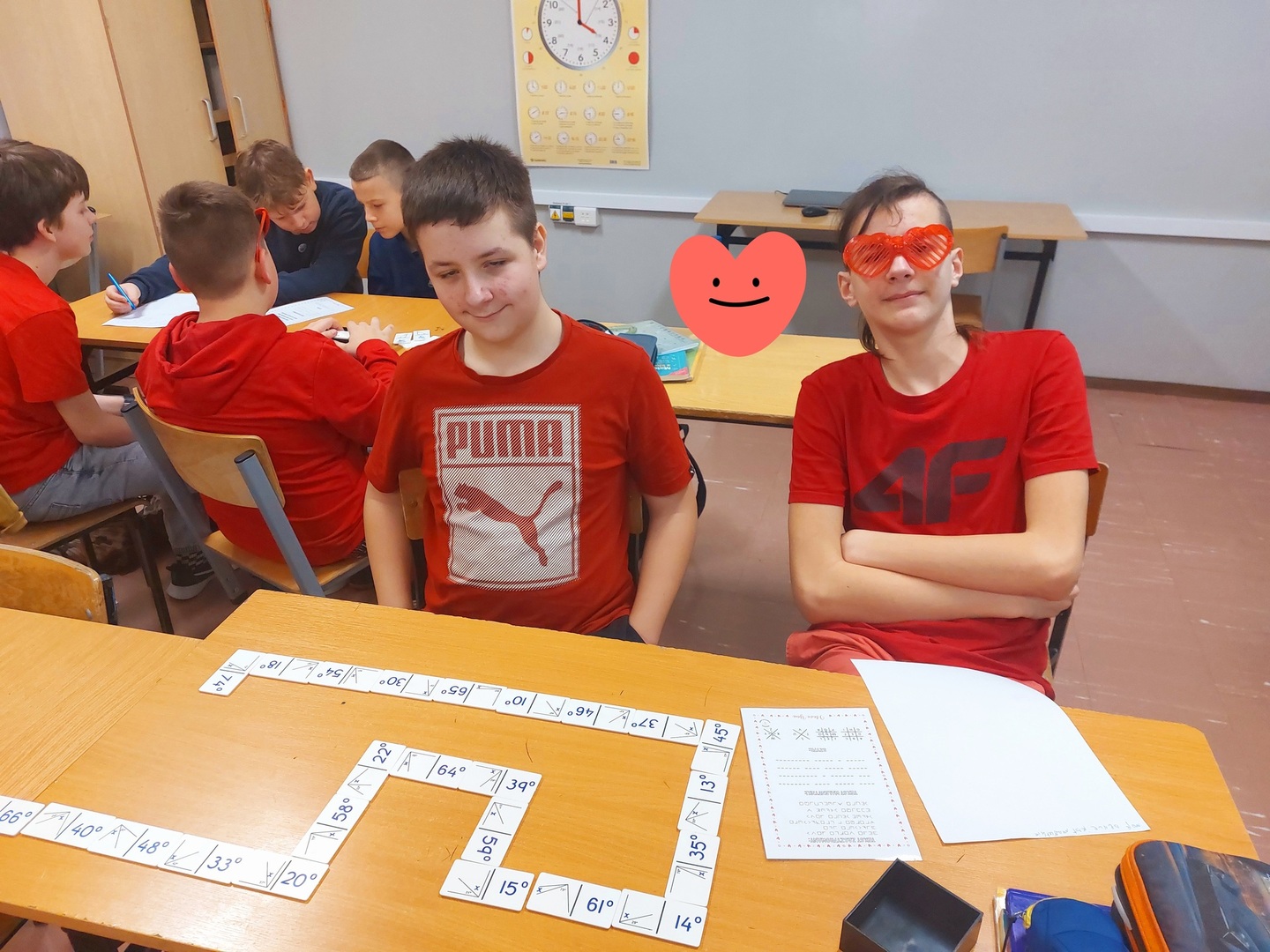 I choć święto Walentego za 2 dni, to już dziś na lekcji matematyki uczniowie klasy 6B układali domino matematyczne obliczając brakujące kąty przyległe, kąty w trójkątach oraz czworokątach.