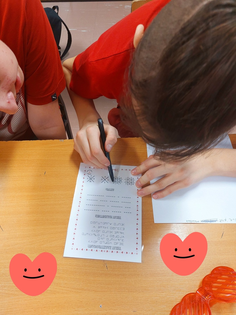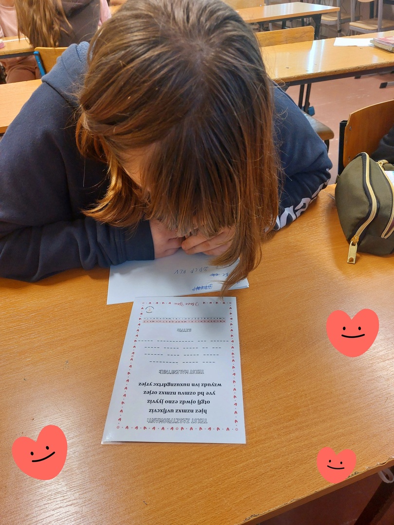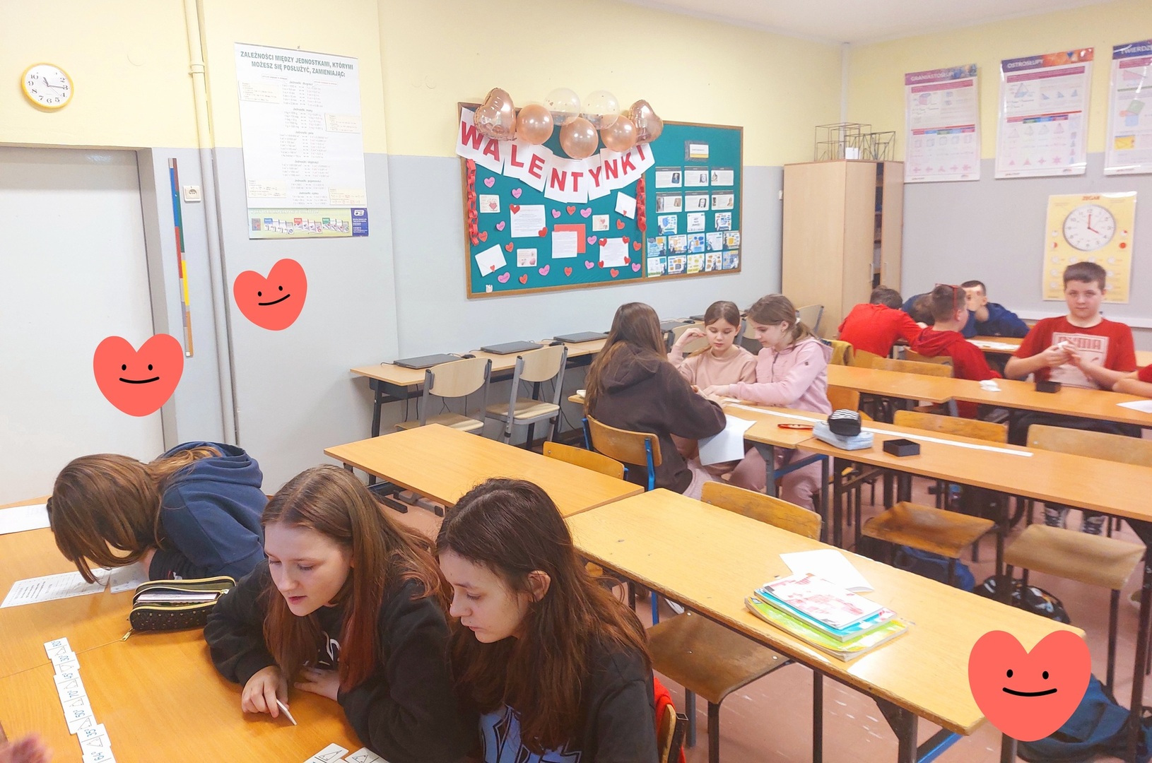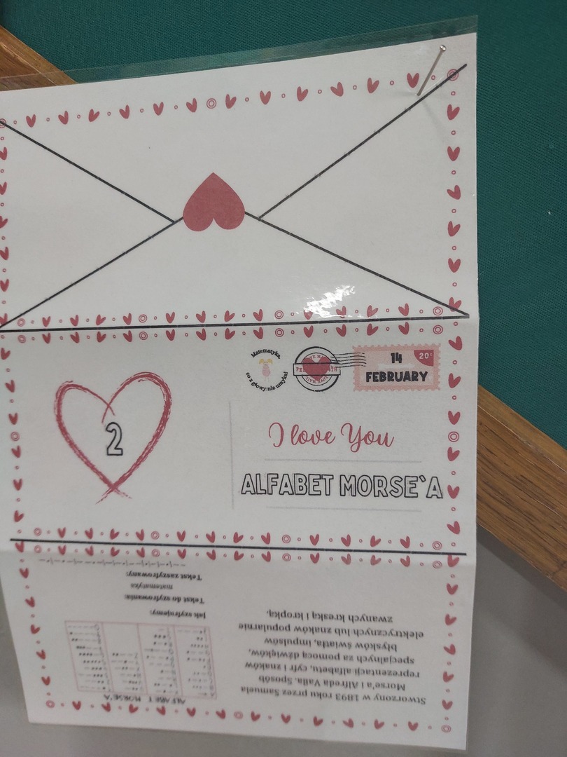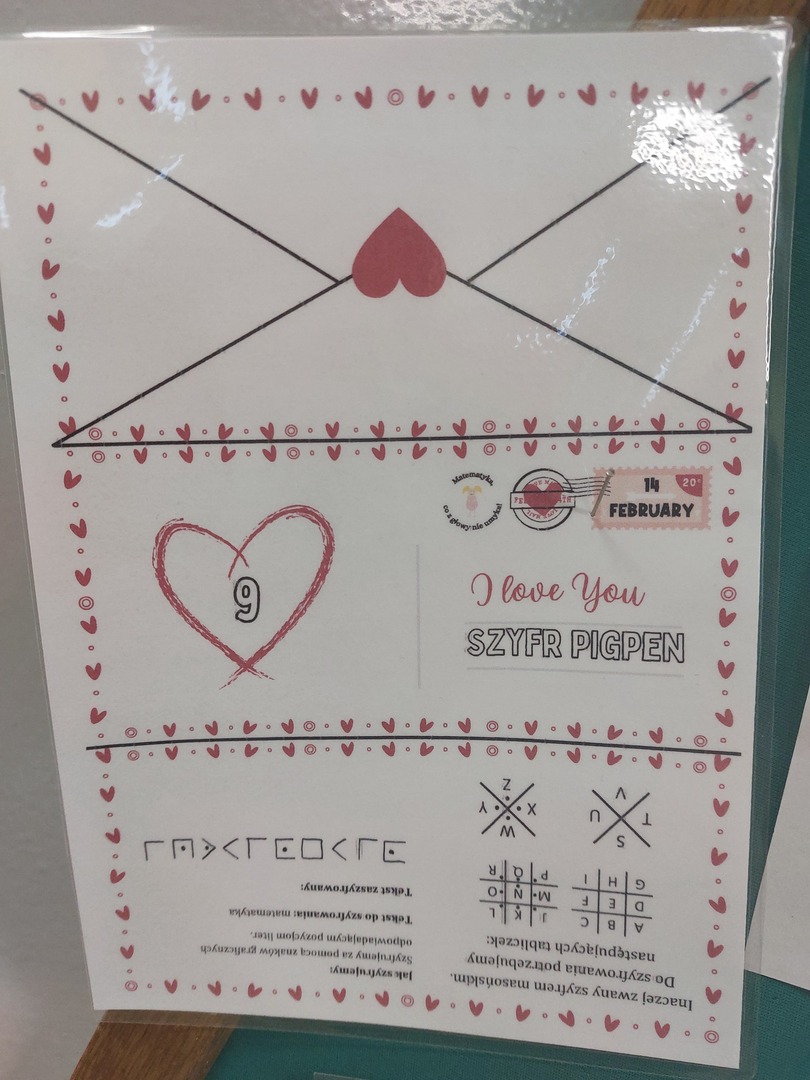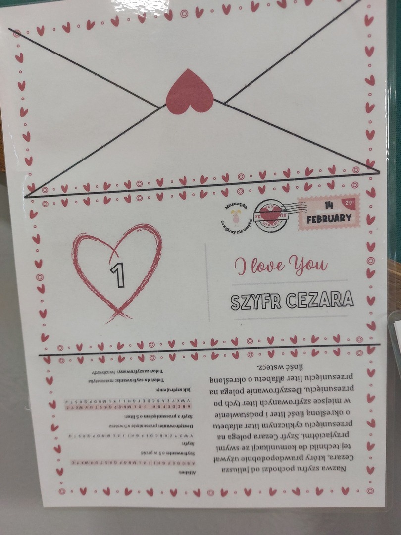 Dodatkowo każda grupa odgadywała hasła walentynkowe zaszyfrowane za pomocą różnych szyfrów, np. Szyfr Cezara, Alfabet Morse'a, szyfr ułamkowy itp. Grupa miała się zapoznać ze swoją Walentynką - przeczytać informację o szyfrze i rozkodować Walentynkę. Następnie uczniowie po wykonanym zadaniu odczytali treść swojej walentynki i przedstawiali poznany szyfr pozostałym.