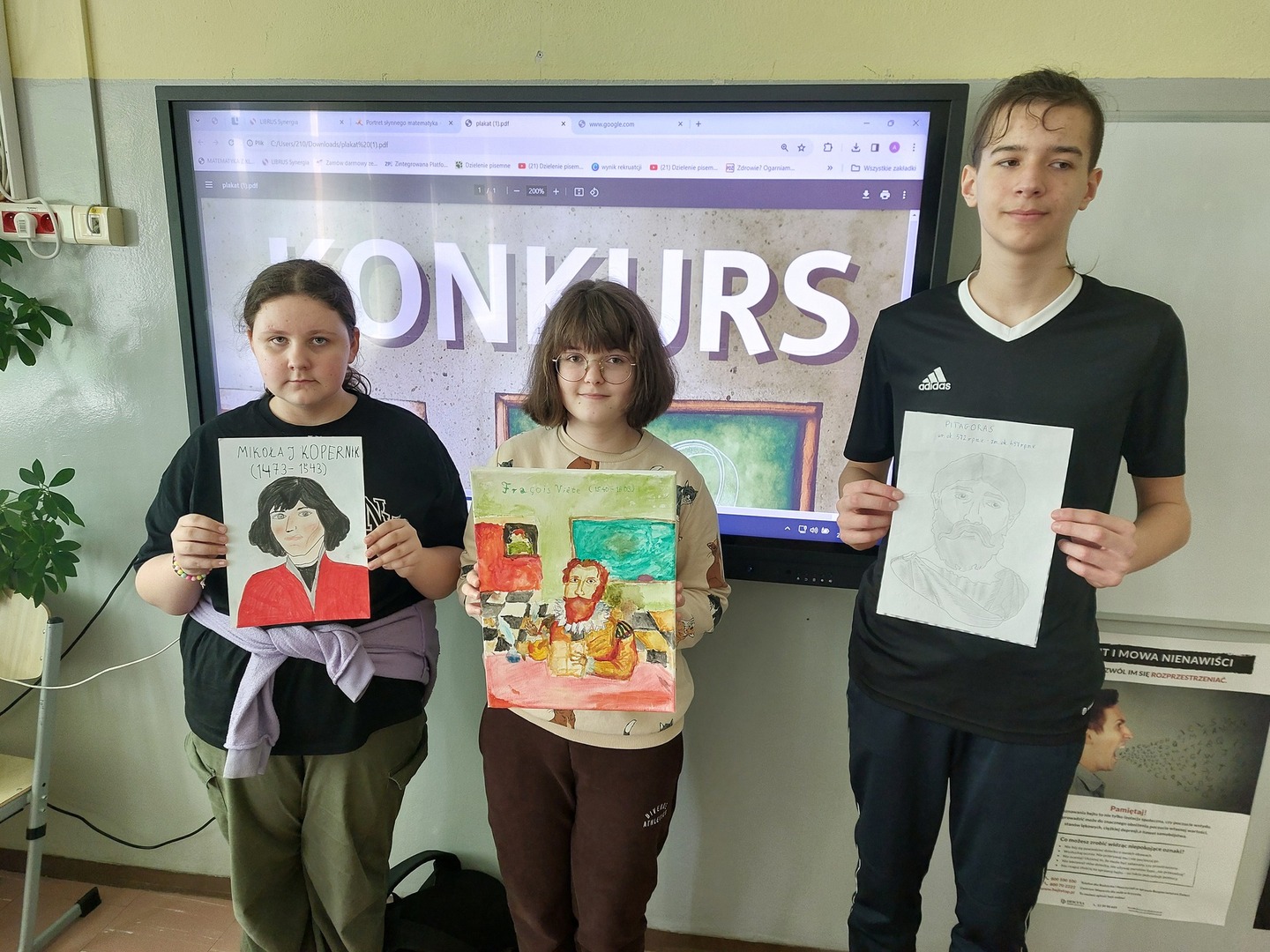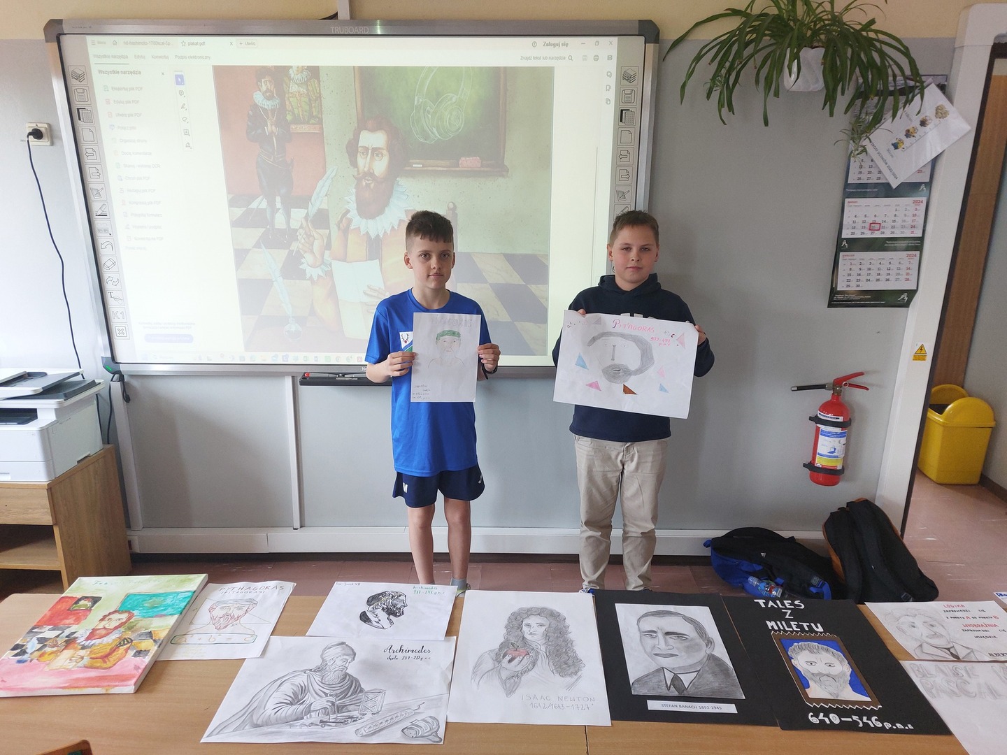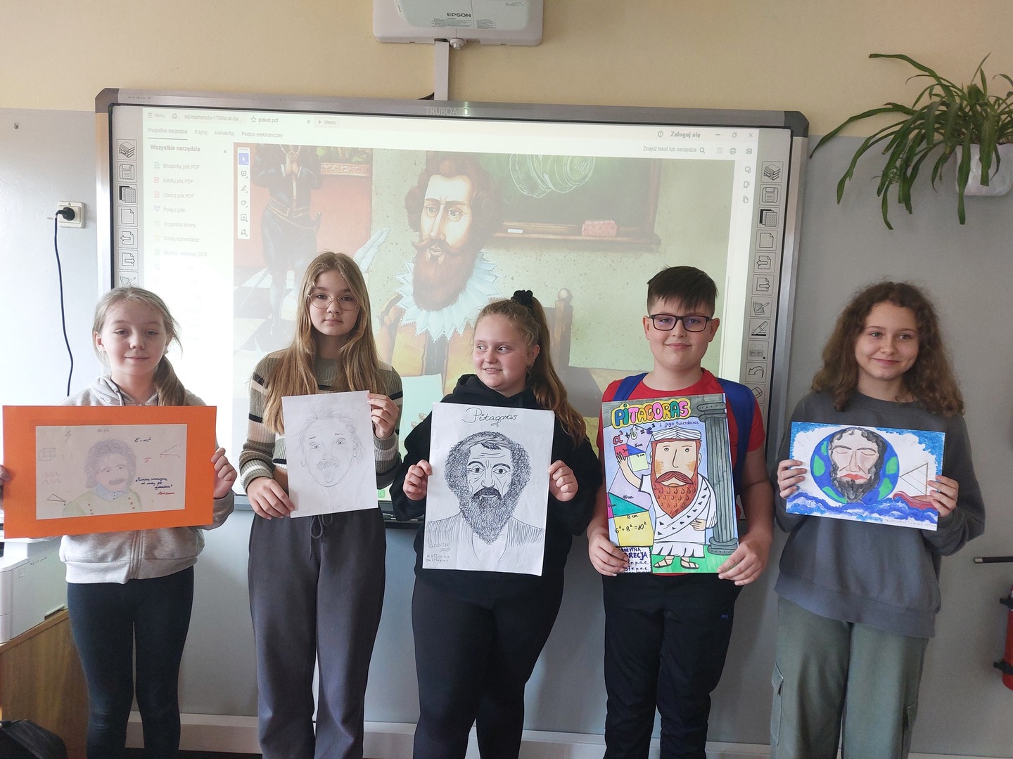 Dodatkowo, w ramach obchodów dnia matematyki 18 uczniów klas IV - VI wykonało piękne portrety słynnych matematyków. Prace zostały wysłane do organizatora konkursu, a z utworzonych kopii zostanie utworzona wystawa.