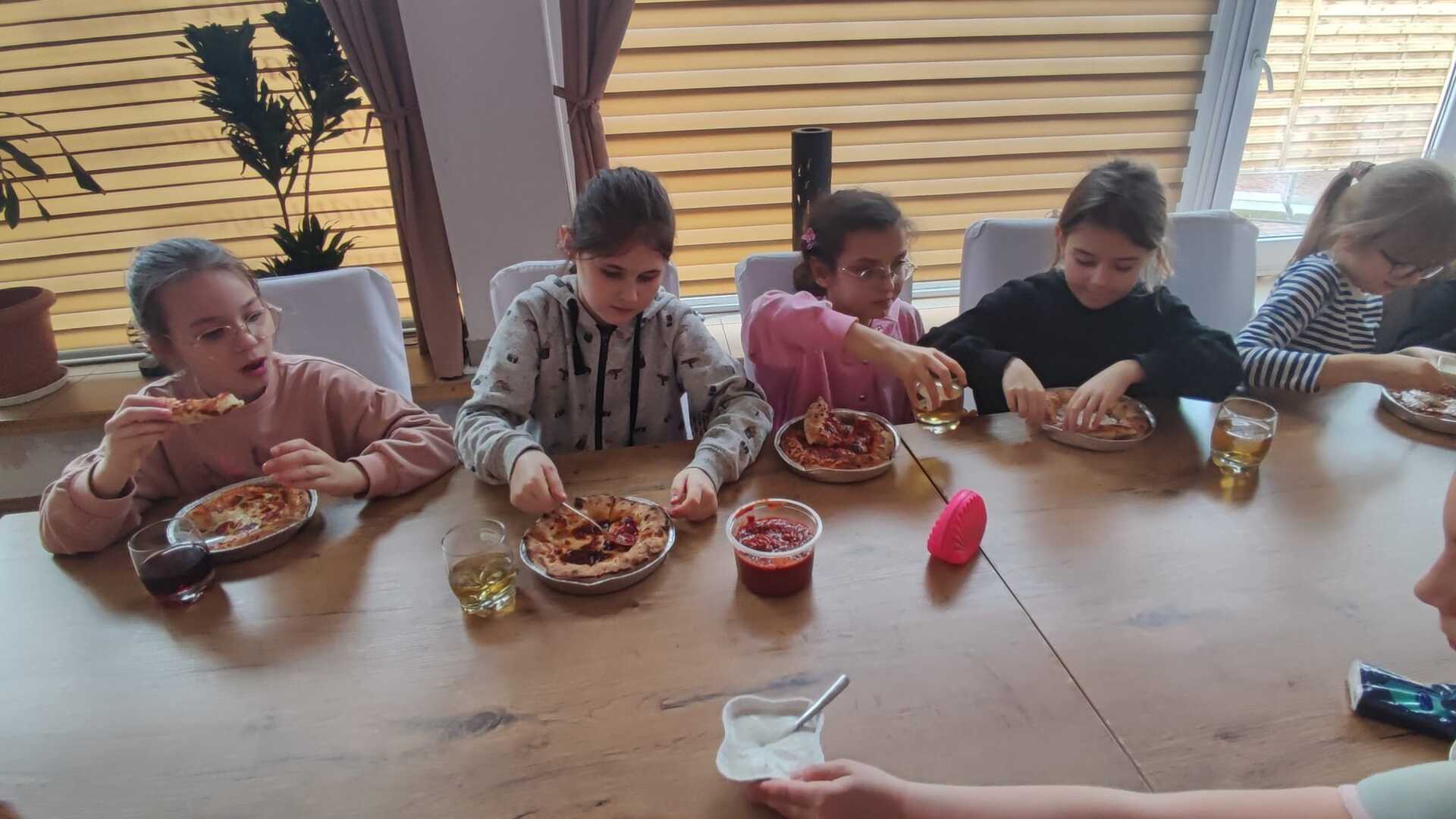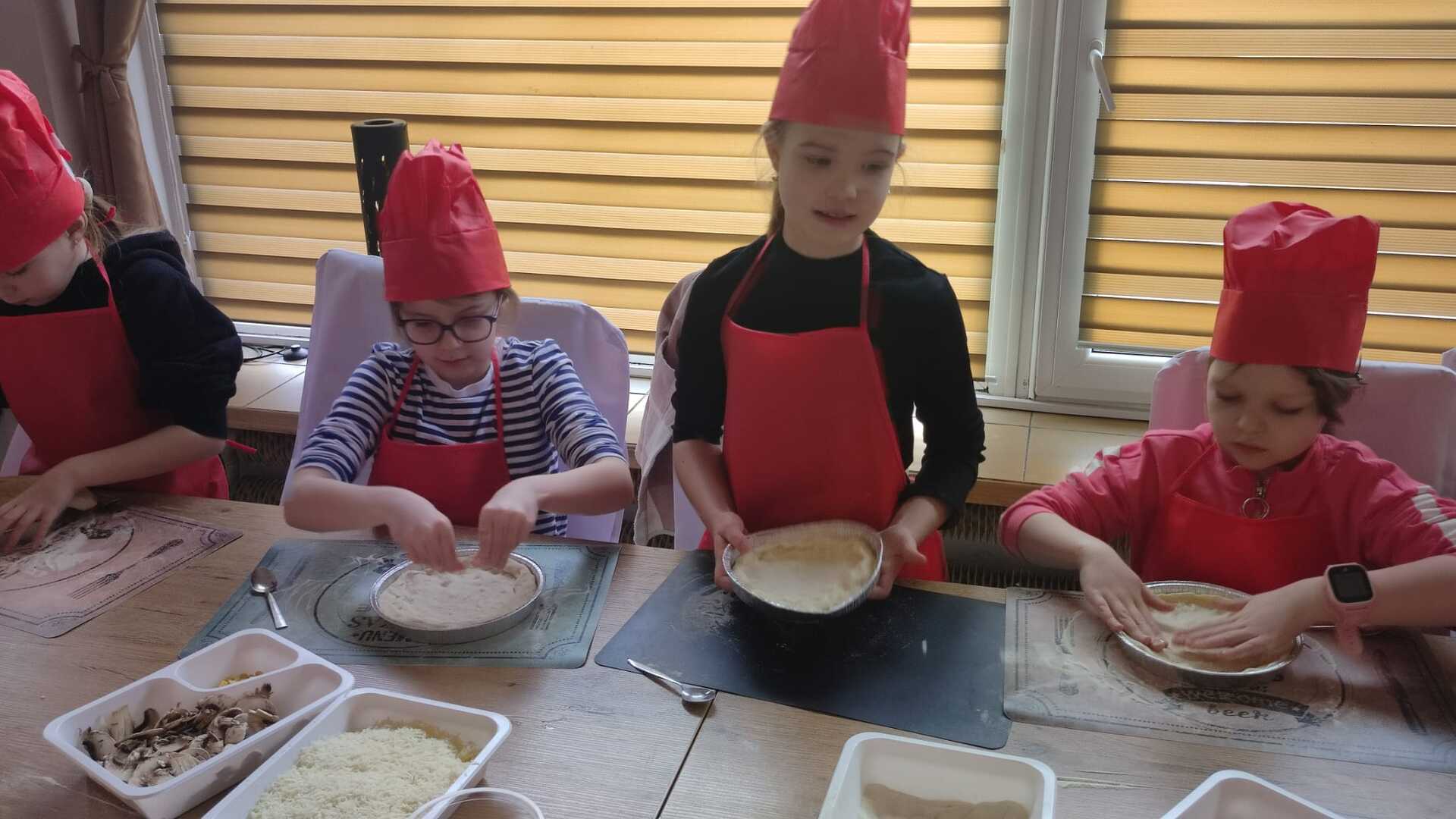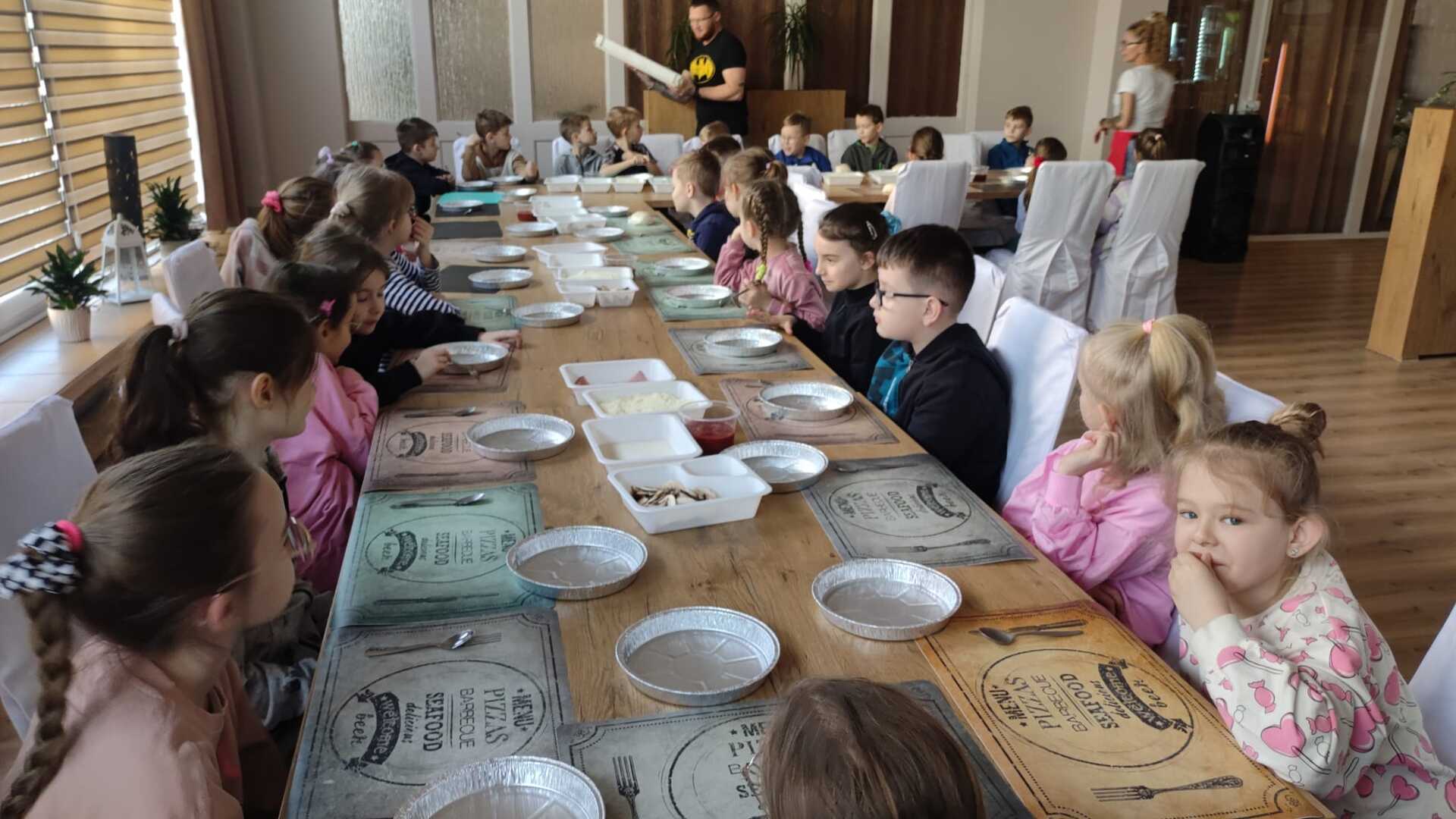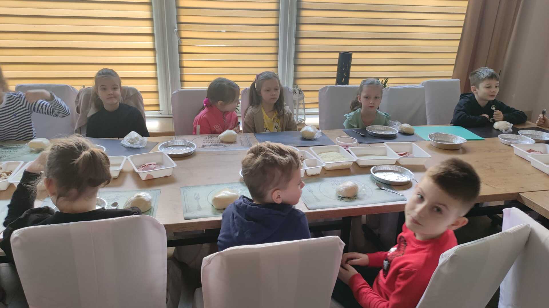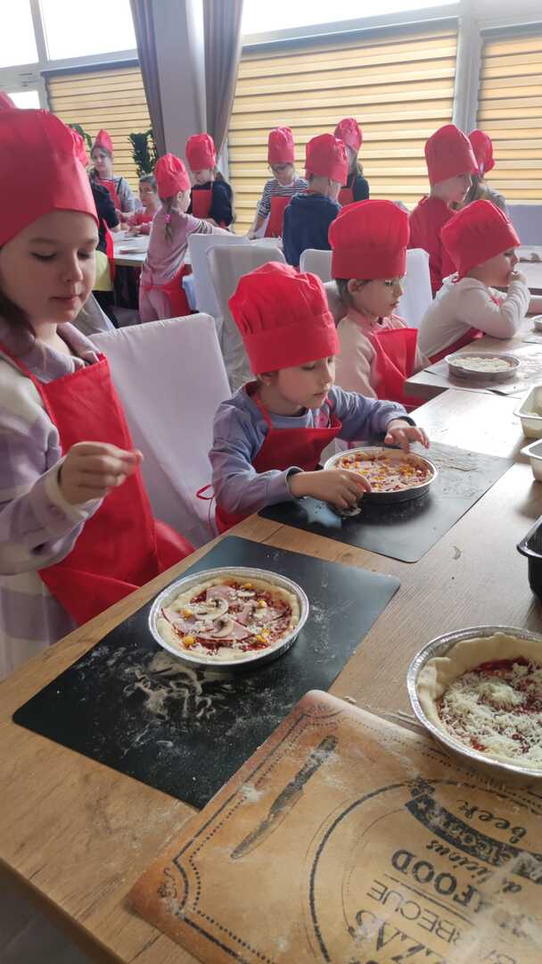 Po zapoznaniu się z techniką wykonania pizzy, dzieci wcieliły się w rolę kucharzy i przyrządziły swoje własne pizze z ulubionymi składnikami. Kiedy okrągłe przysmaki piekły się w gorącym piecu, uczniowie mieli czas by przypomnieć sobie zasady właściwego zachowywania się w restauracji i kulturalnego sposobu spożywania posiłków oraz zadbać o higienę rąk przed posiłkiem. Następnie przystąpiliśmy do degustacji. Wszyscy zgodnie stwierdzili, że pizza była bardzo smaczna.