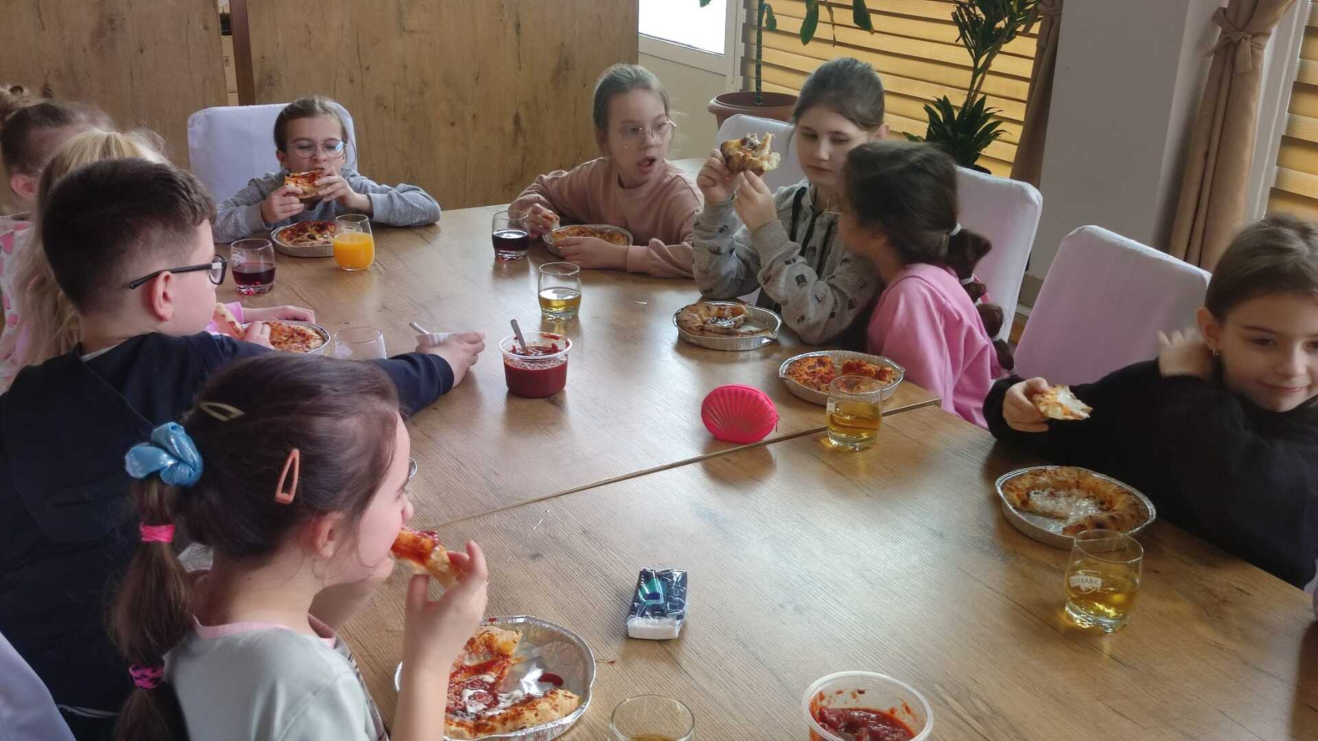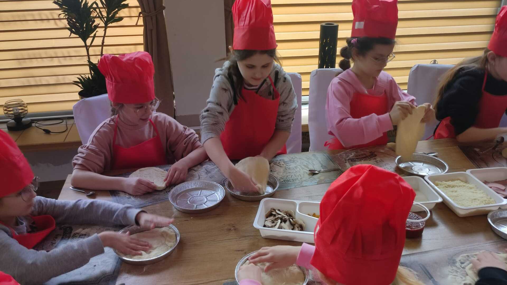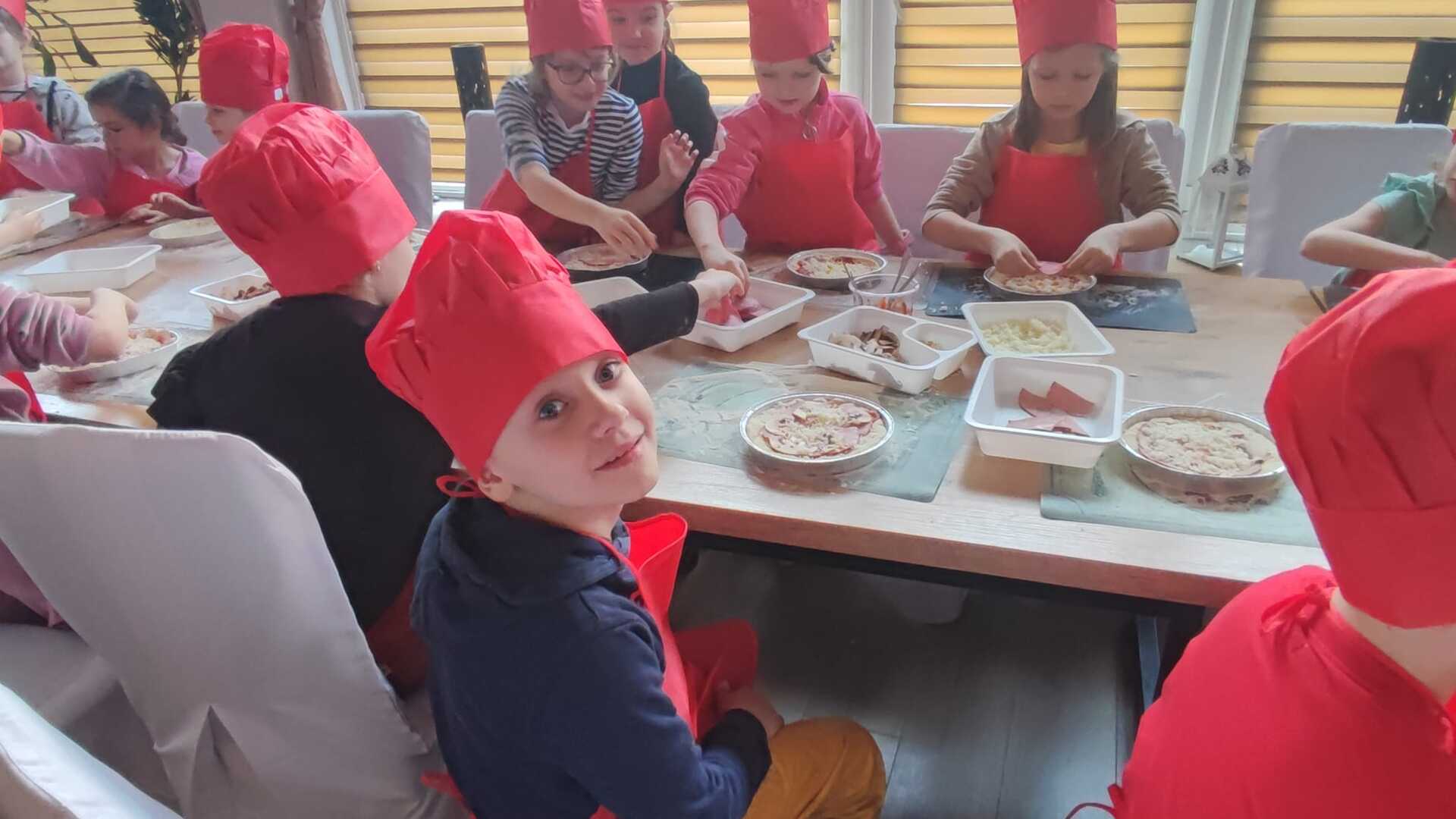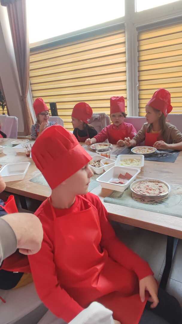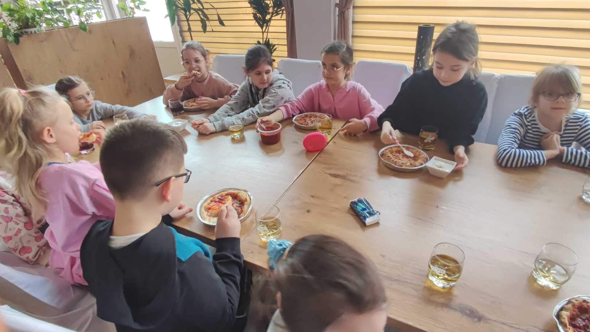 Po zapoznaniu się z techniką wykonania pizzy, dzieci wcieliły się w rolę kucharzy i przyrządziły swoje własne pizze z ulubionymi składnikami. Kiedy okrągłe przysmaki piekły się w gorącym piecu, uczniowie mieli czas by przypomnieć sobie zasady właściwego zachowywania się w restauracji i kulturalnego sposobu spożywania posiłków oraz zadbać o higienę rąk przed posiłkiem. Następnie przystąpiliśmy do degustacji. Wszyscy zgodnie stwierdzili, że pizza była bardzo smaczna.