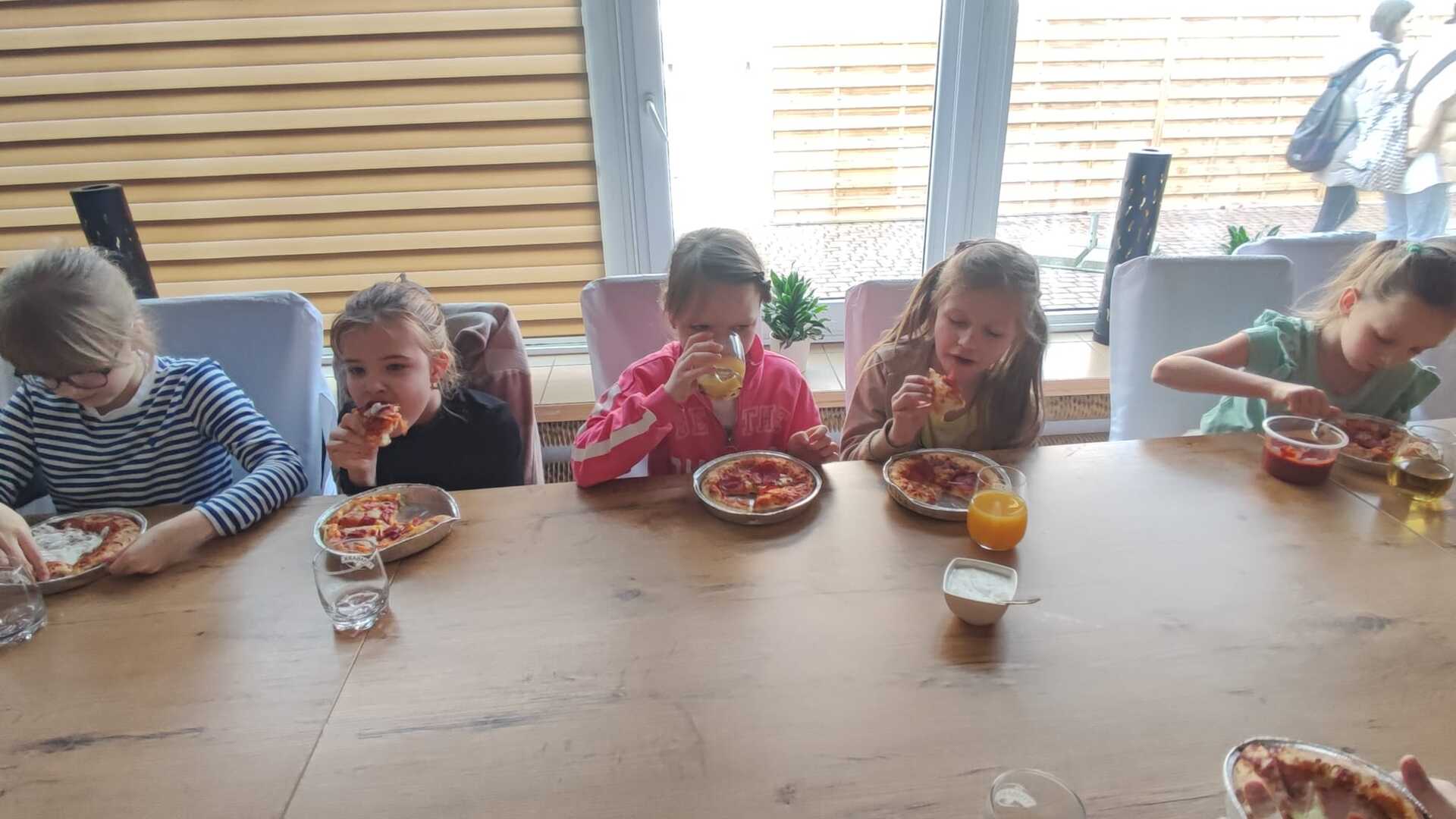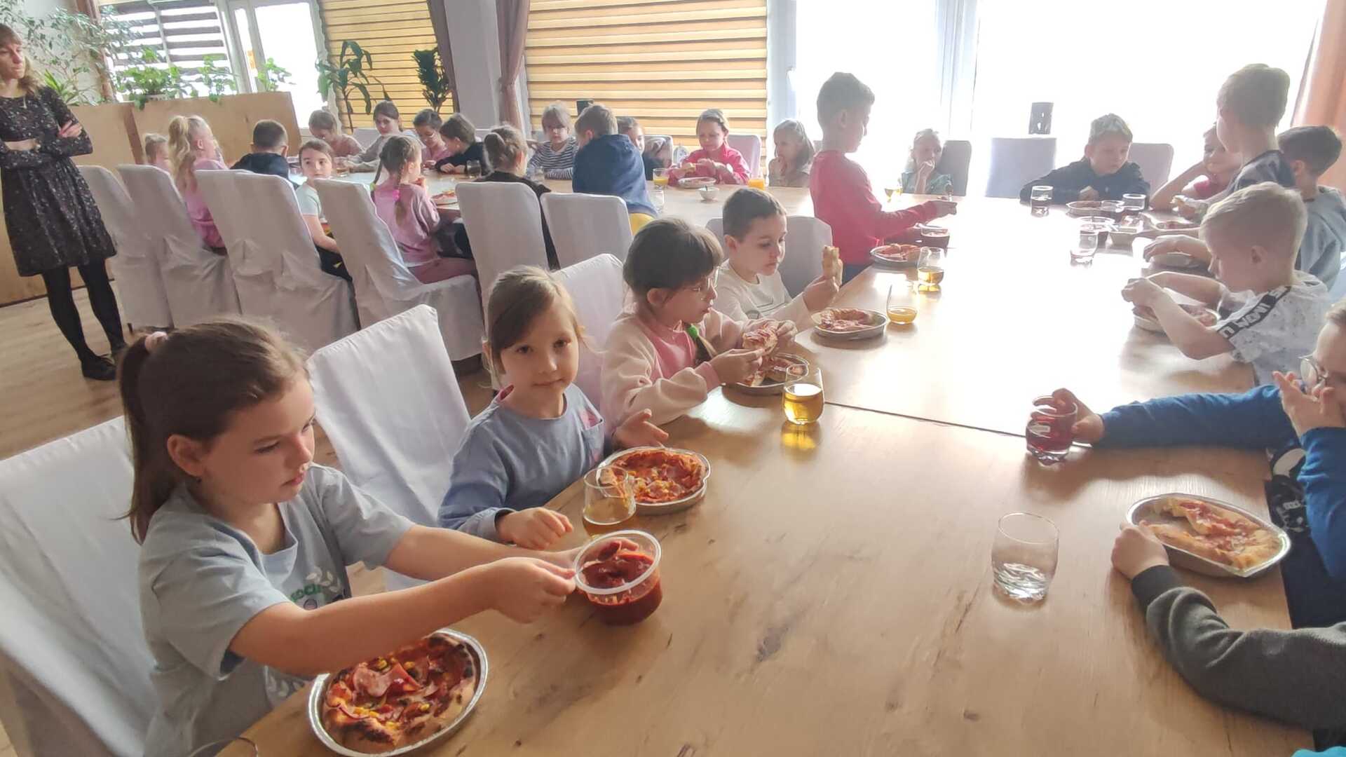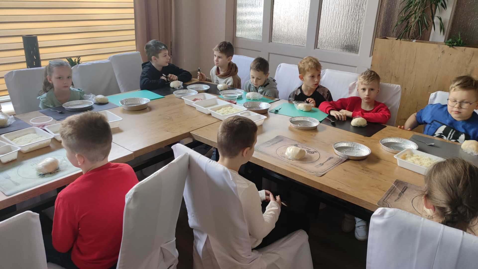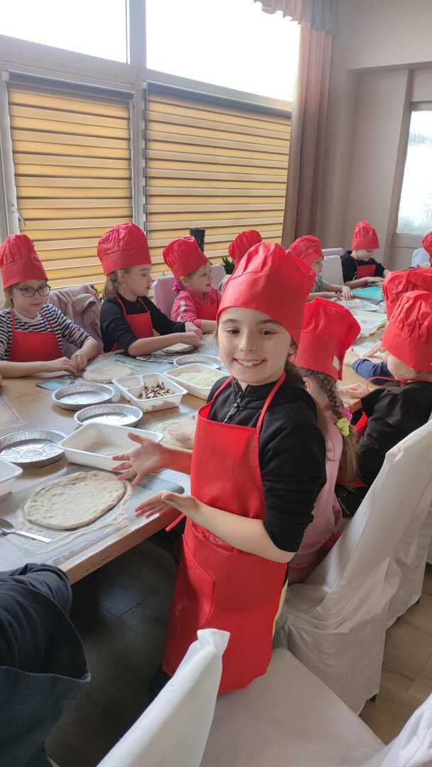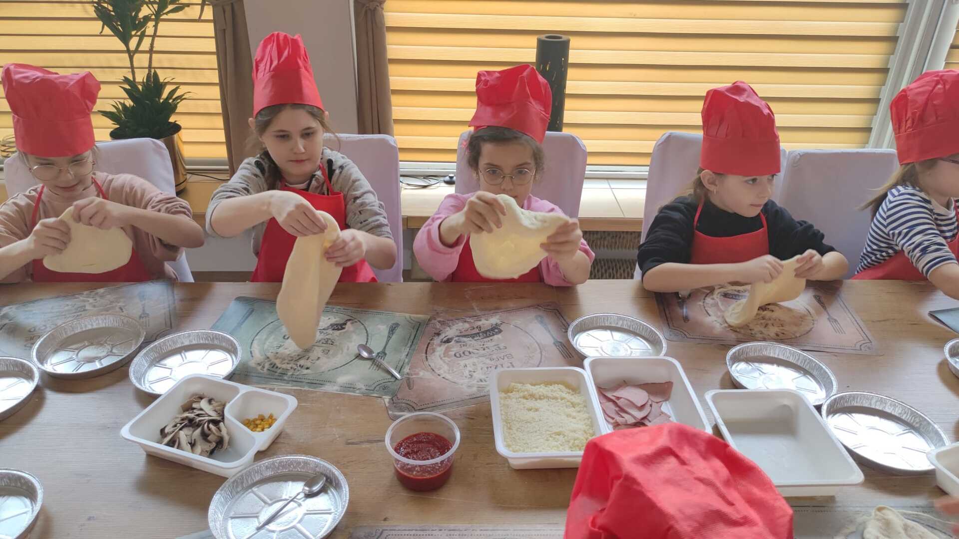 Po zapoznaniu się z techniką wykonania pizzy, dzieci wcieliły się w rolę kucharzy i przyrządziły swoje własne pizze z ulubionymi składnikami. Kiedy okrągłe przysmaki piekły się w gorącym piecu, uczniowie mieli czas by przypomnieć sobie zasady właściwego zachowywania się w restauracji i kulturalnego sposobu spożywania posiłków oraz zadbać o higienę rąk przed posiłkiem. Następnie przystąpiliśmy do degustacji. Wszyscy zgodnie stwierdzili, że pizza była bardzo smaczna.