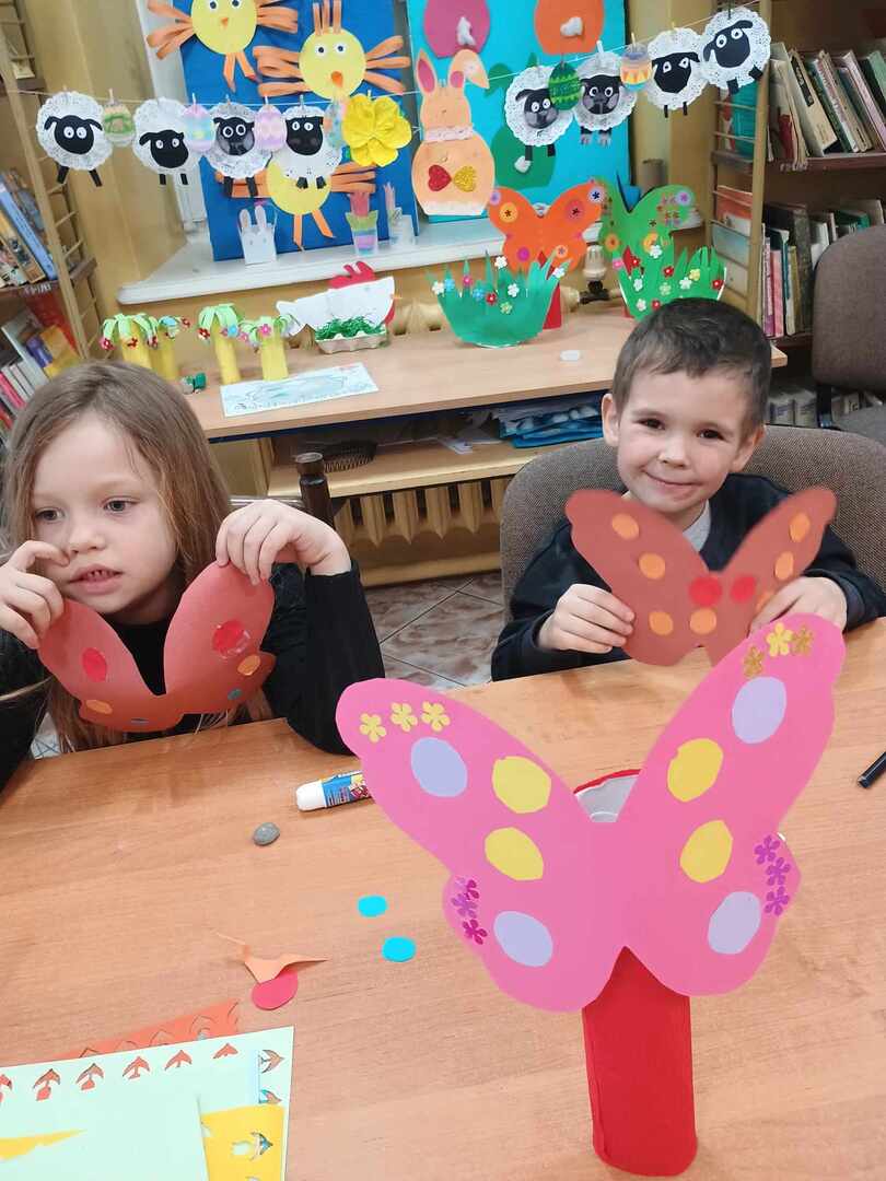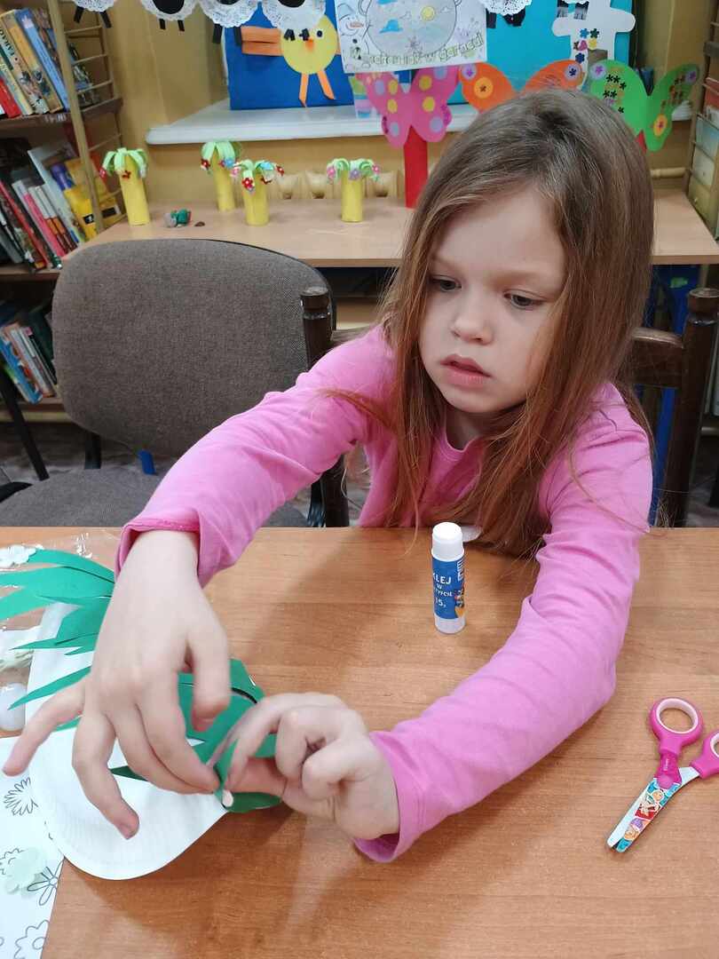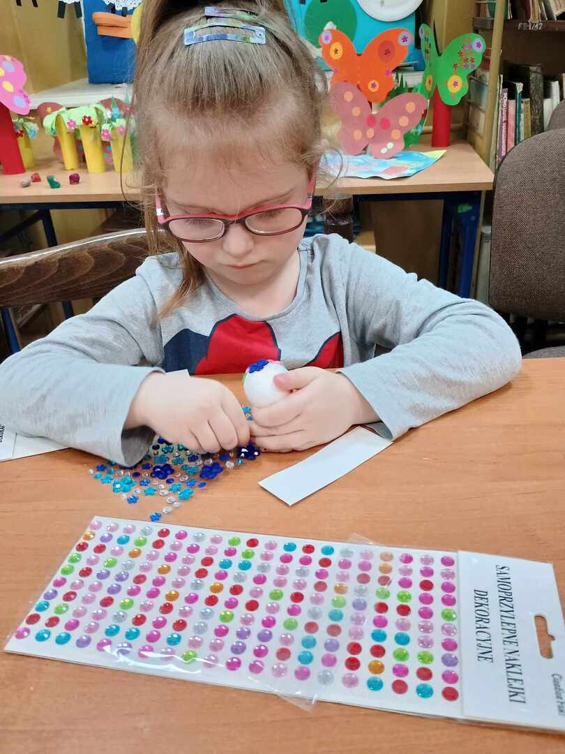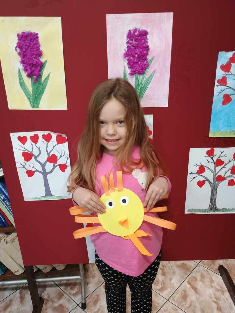Podczas zajęć wykonywały również wiosenne kwiaty, bociany, motyle. Zajęcia przebiegały w miłej, przyjemnej atmosferze. Wspólna zabawa i praca pozwoliła nam poczuć atmosferę wiosny i nadchodzących świąt Wielkie Nocy.