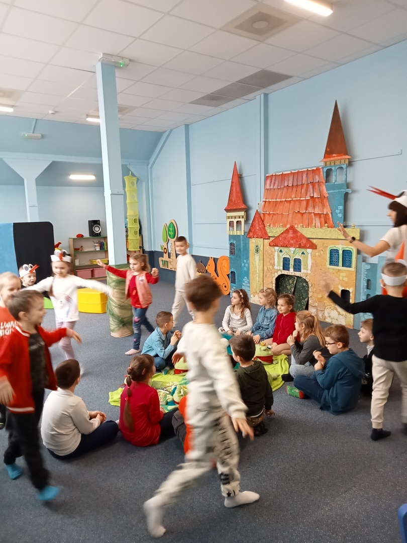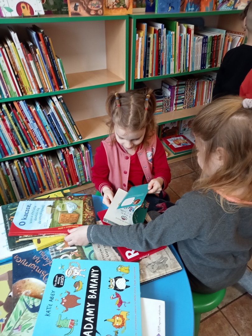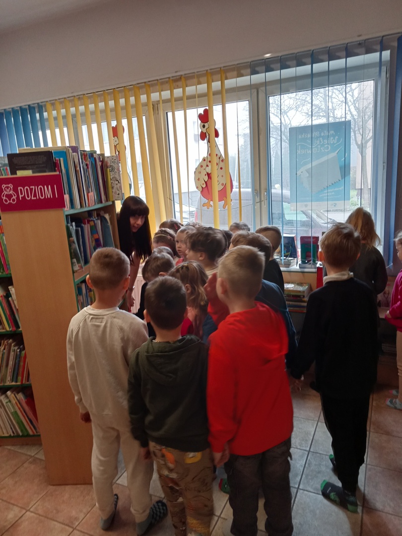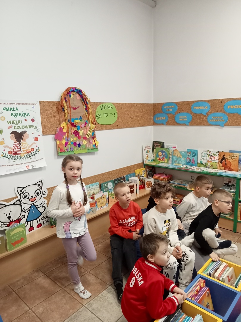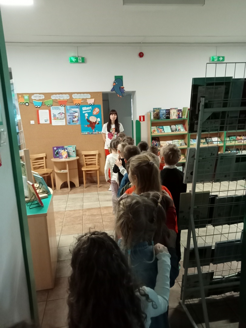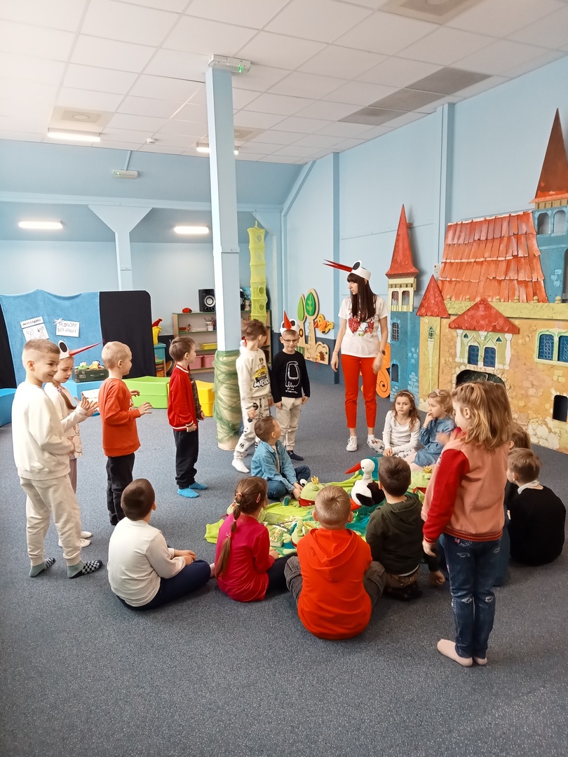 26 marca przedszkolaki wybrały się do Biblioteki im. Wandy Chotomskiej. Dzieci uczestniczyły w lekcji bibliotecznej, brały udział w zabawach ruchowych oraz wysłuchały teatrzyku walizkowego pt. "Podróże Bociana".