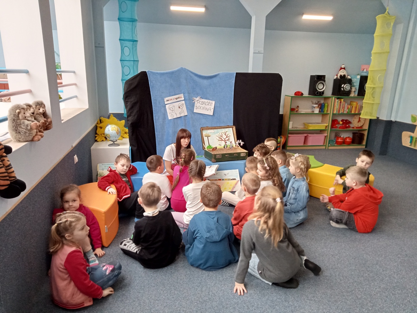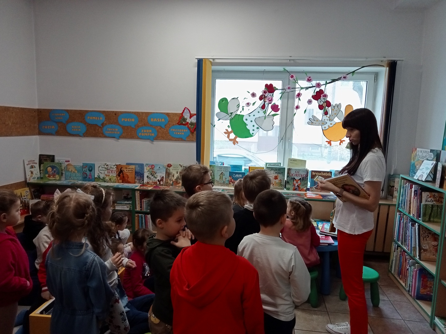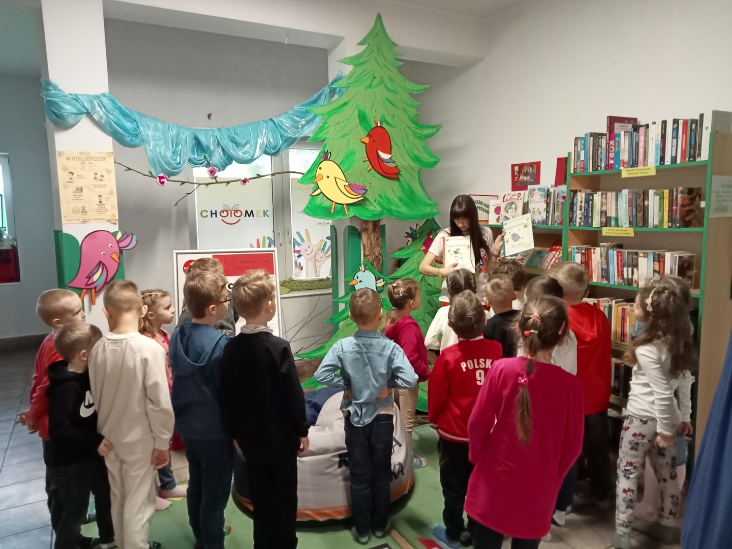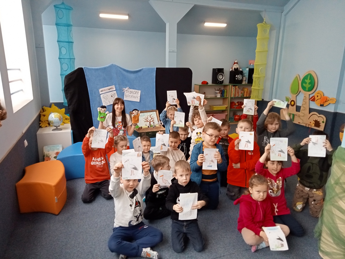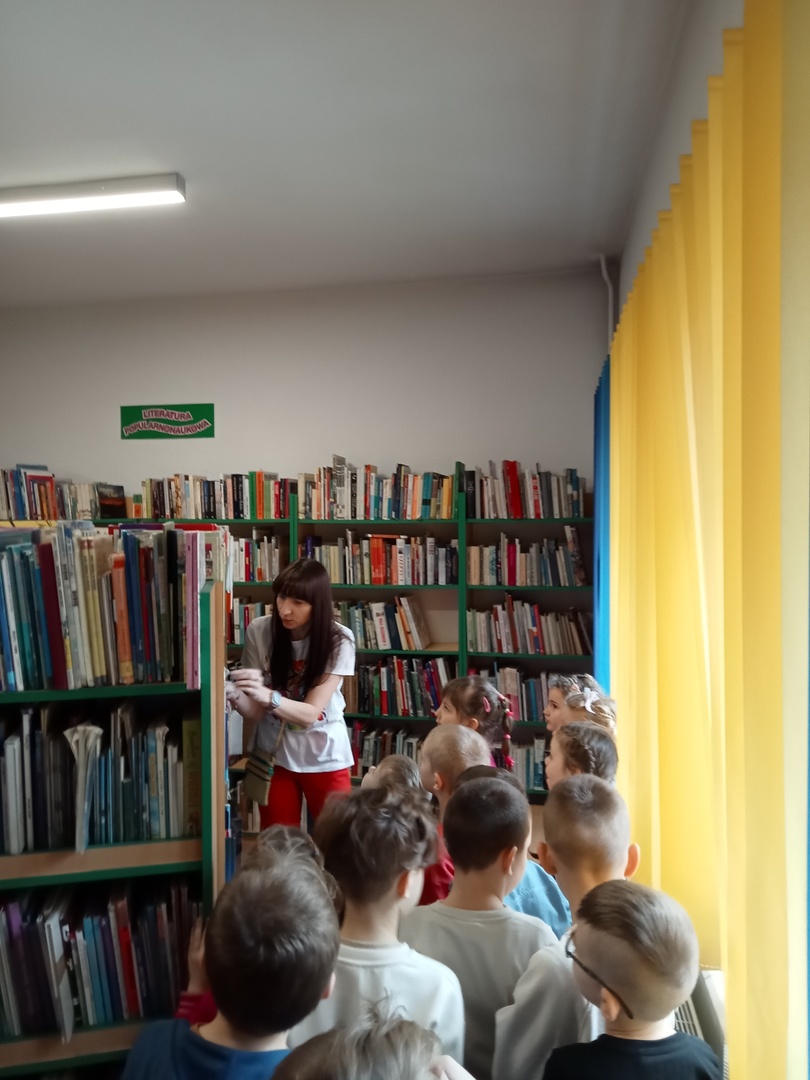 26 marca przedszkolaki wybrały się do Biblioteki im. Wandy Chotomskiej. Dzieci uczestniczyły w lekcji bibliotecznej, brały udział w zabawach ruchowych oraz wysłuchały teatrzyku walizkowego pt. "Podróże Bociana".