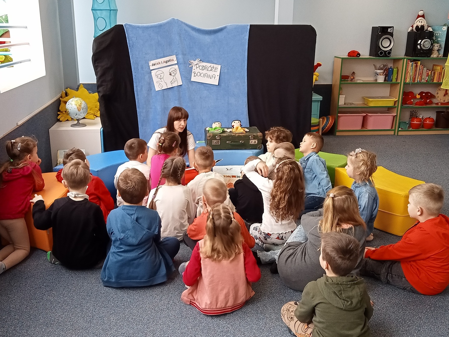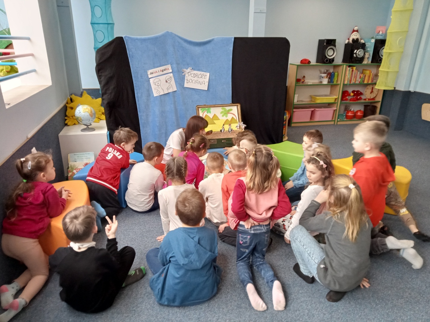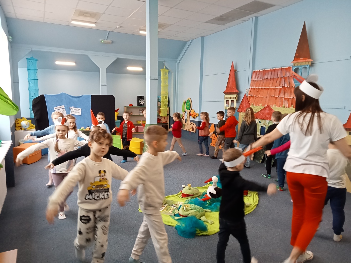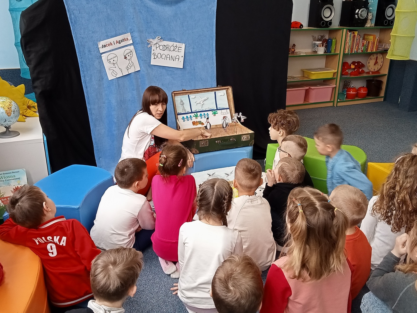 26 marca przedszkolaki wybrały się do Biblioteki im. Wandy Chotomskiej. Dzieci uczestniczyły w lekcji bibliotecznej, brały udział w zabawach ruchowych oraz wysłuchały teatrzyku walizkowego pt. "Podróże Bociana".