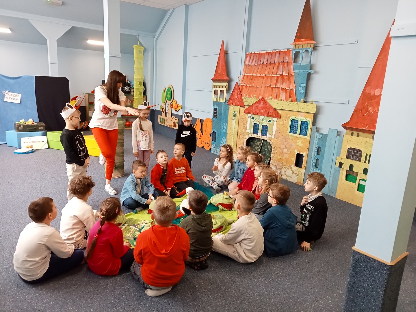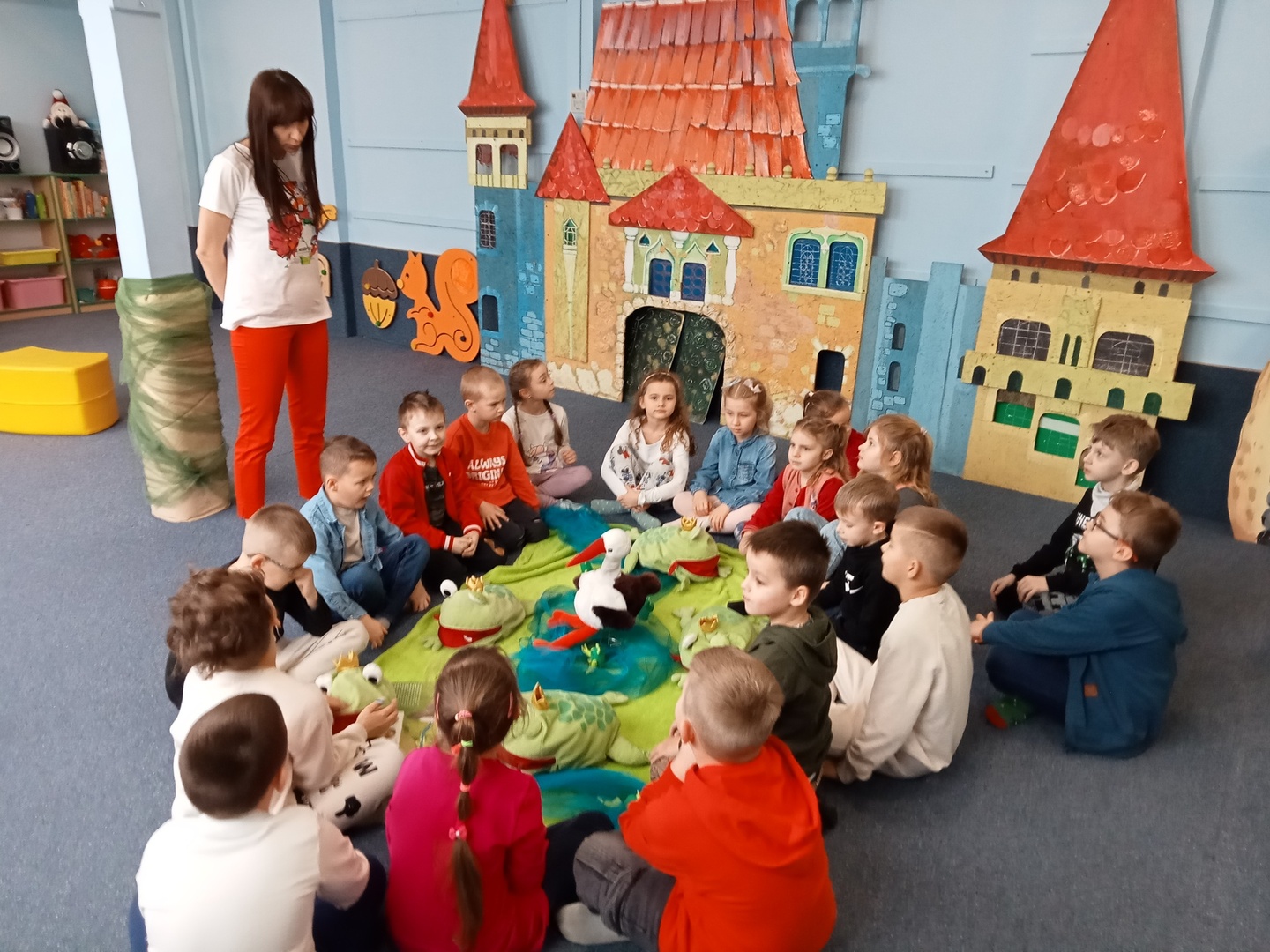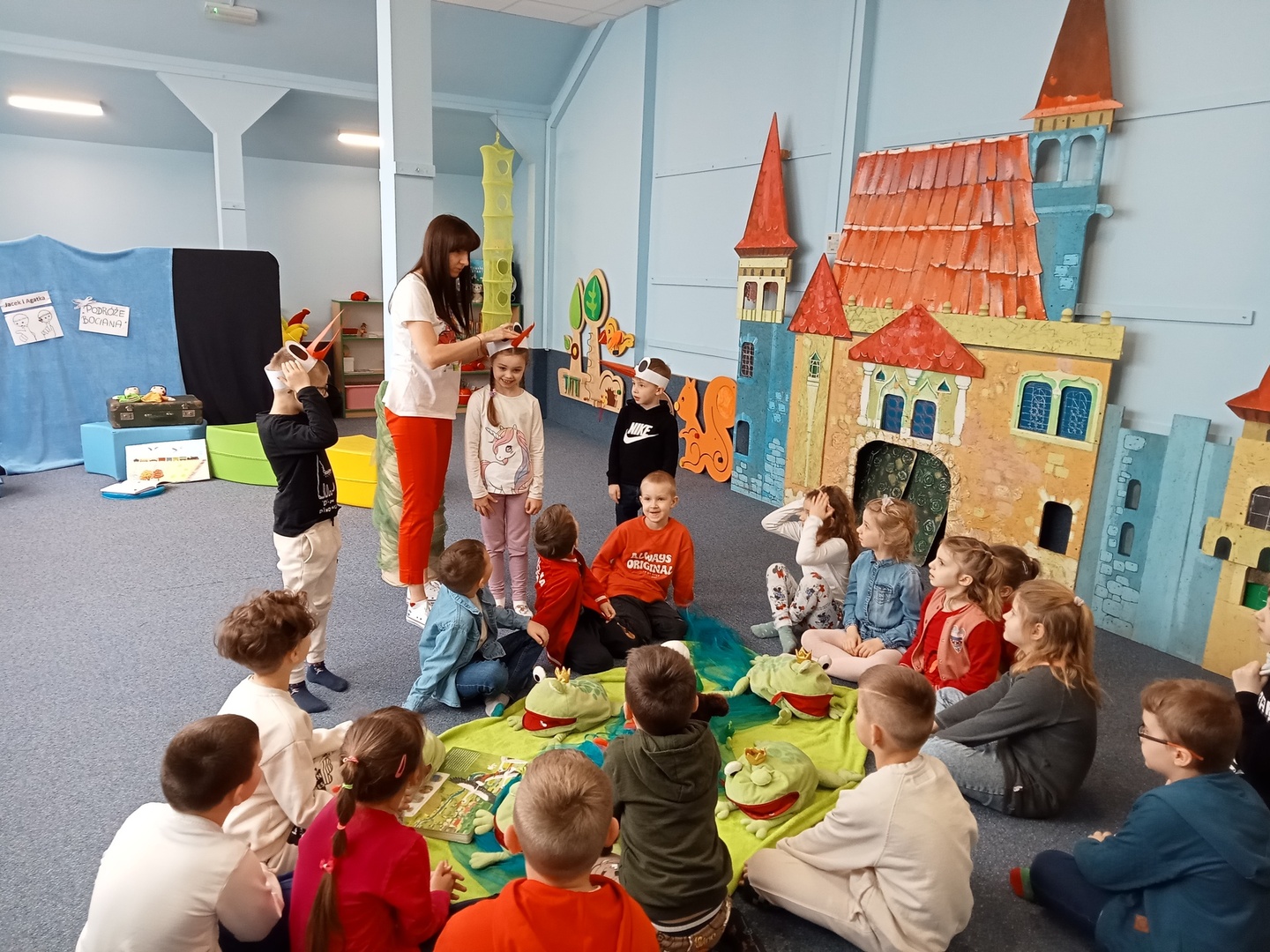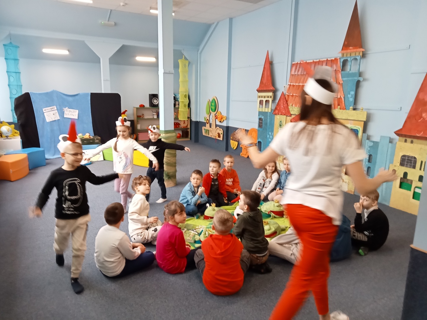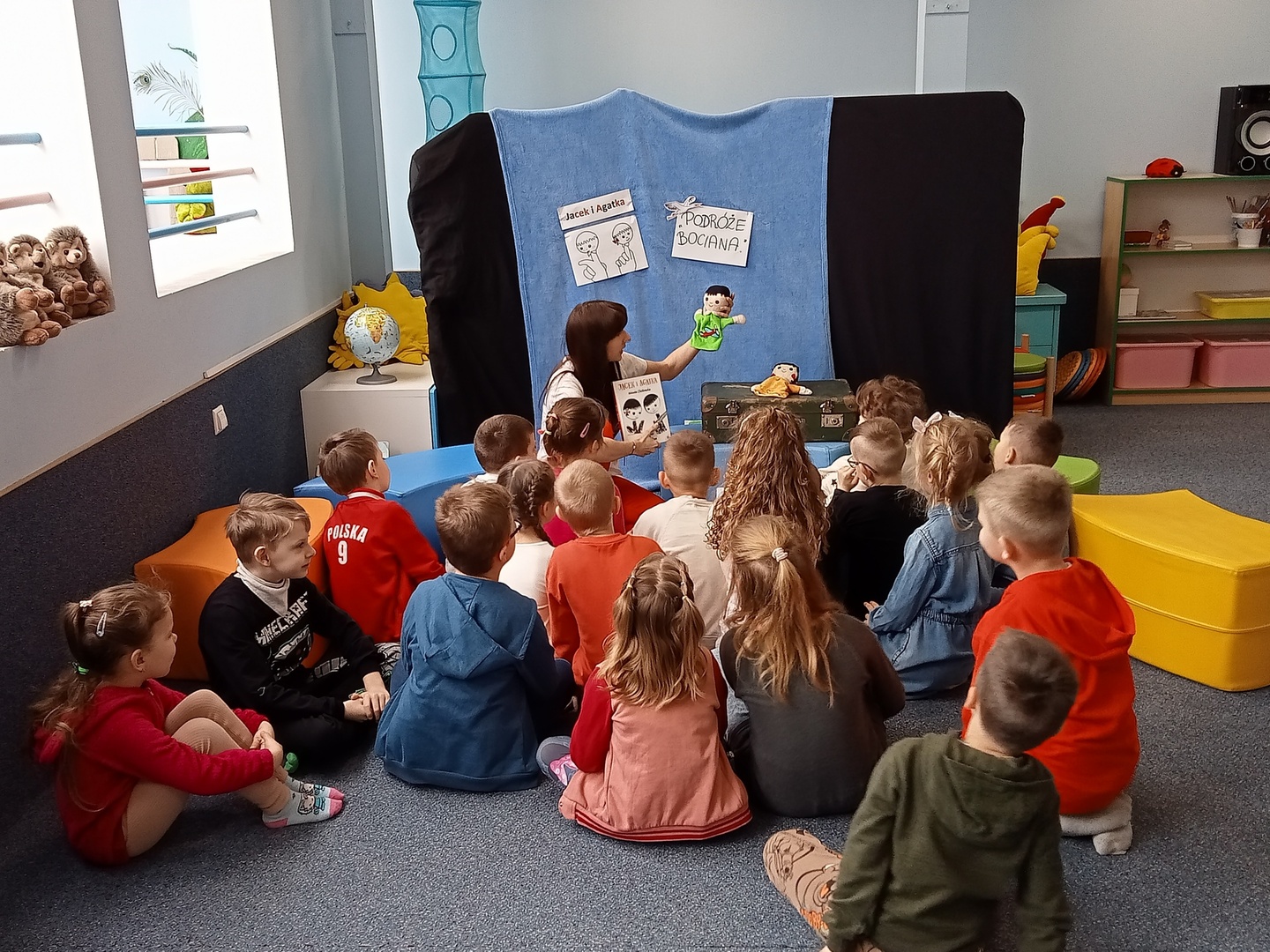 26 marca przedszkolaki wybrały się do Biblioteki im. Wandy Chotomskiej. Dzieci uczestniczyły w lekcji bibliotecznej, brały udział w zabawach ruchowych oraz wysłuchały teatrzyku walizkowego pt. "Podróże Bociana".