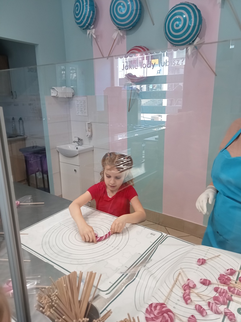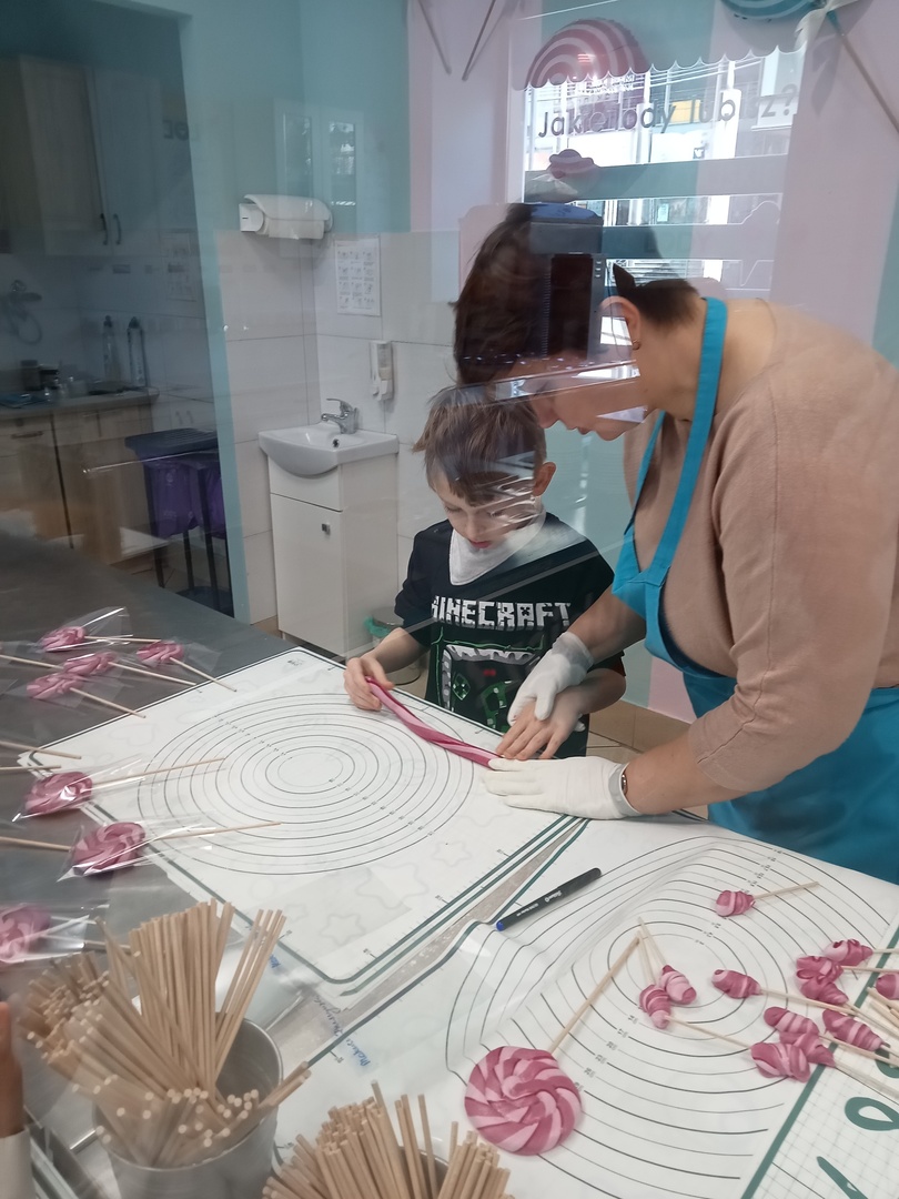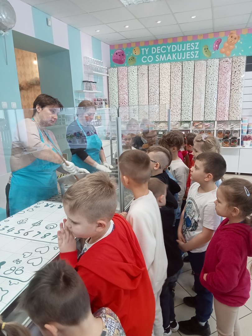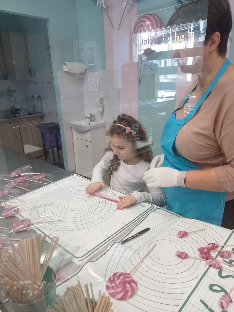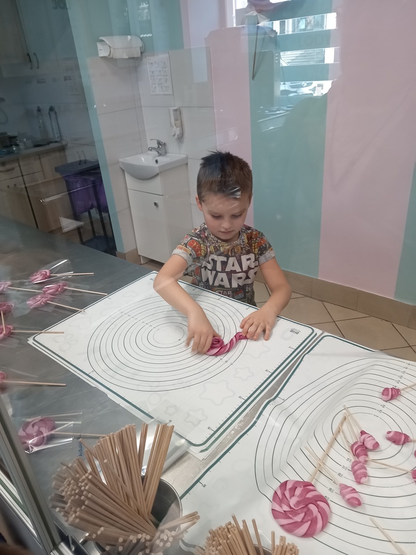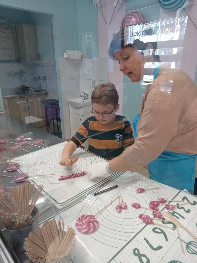 Po zakończonej wizycie w bibliotece dzieci udały się do Manufaktury Słodyczy. Uczestniczyły w warsztatach, w trakcie których miały okazję poznać cały proces ręcznego wykonywania słodkości. Przez cały czas obserwowały proces produkcyjny - od momentu wylania karmelu na kamienny blat, poprzez nadawanie mu smaku i kolorów, aż do momentu pakowania gotowych produktów. Mistrzowie pracy z karmelem pokazali, na czym polega ich praca, a dzieci mogły się przekonać, że robienie lizaków to prawdziwa sztuka. Po pokazie przedszkolaki samodzielnie wykonały lizaki, które zapakowały i zabrały do domu. To była wspaniała wycieczka, którą dzieci będą długo wspominać.