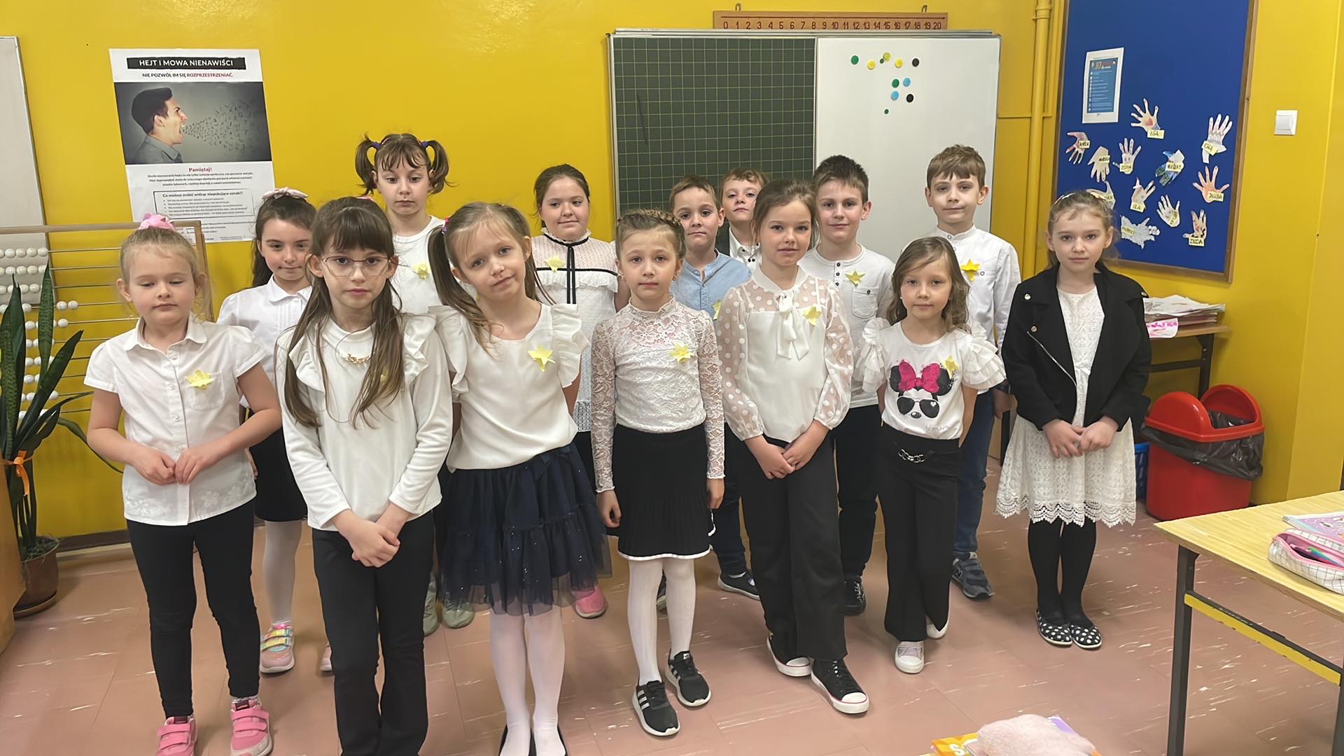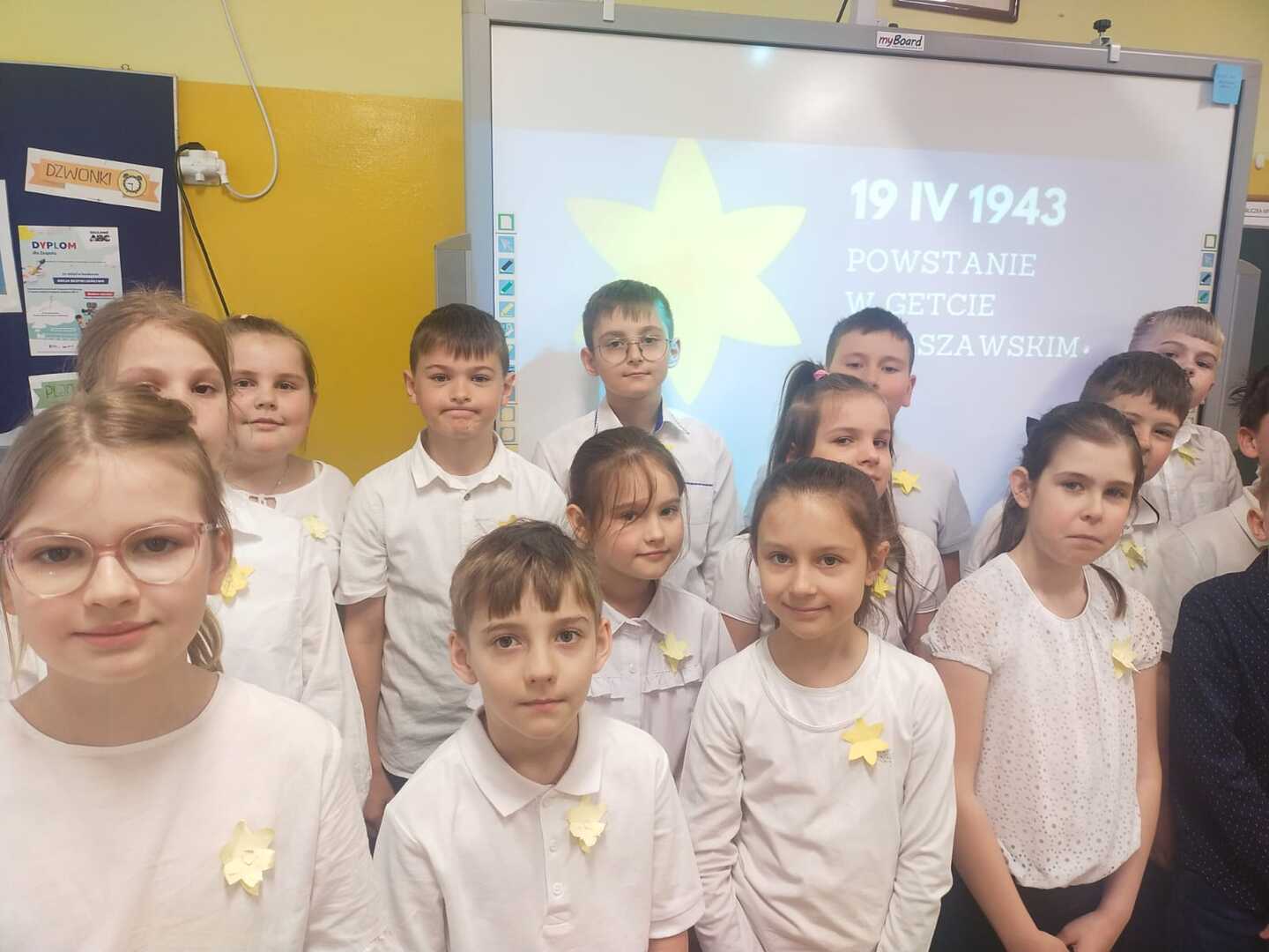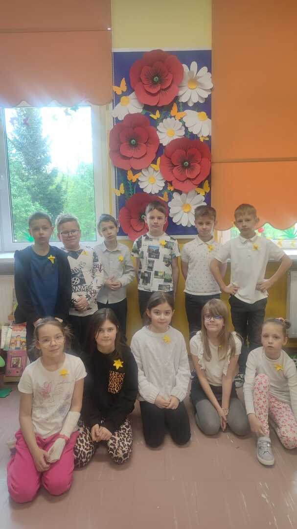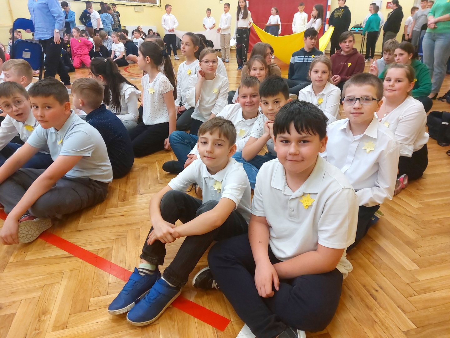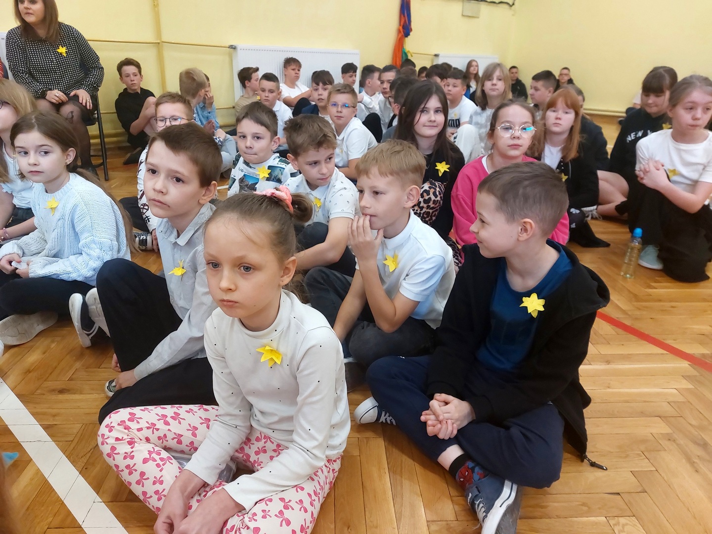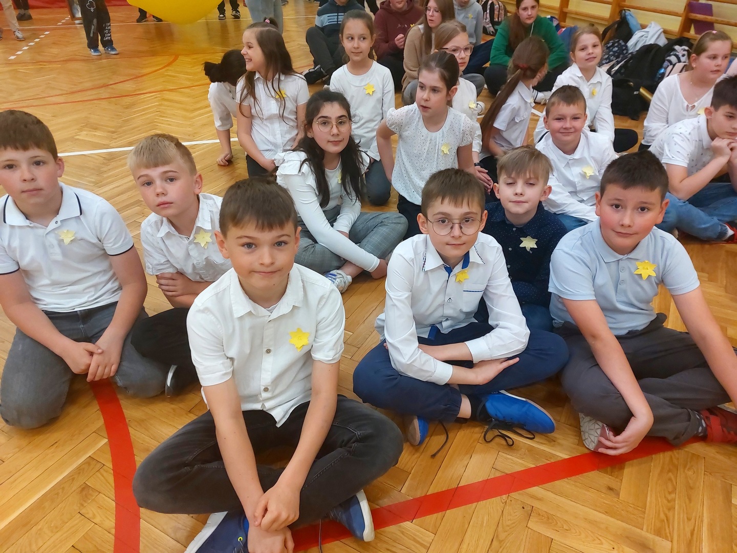 Uczniowie wraz z wychowawcami wykonali papierowe, żółte żonkile, który zostały przypięte do białych bluzek.