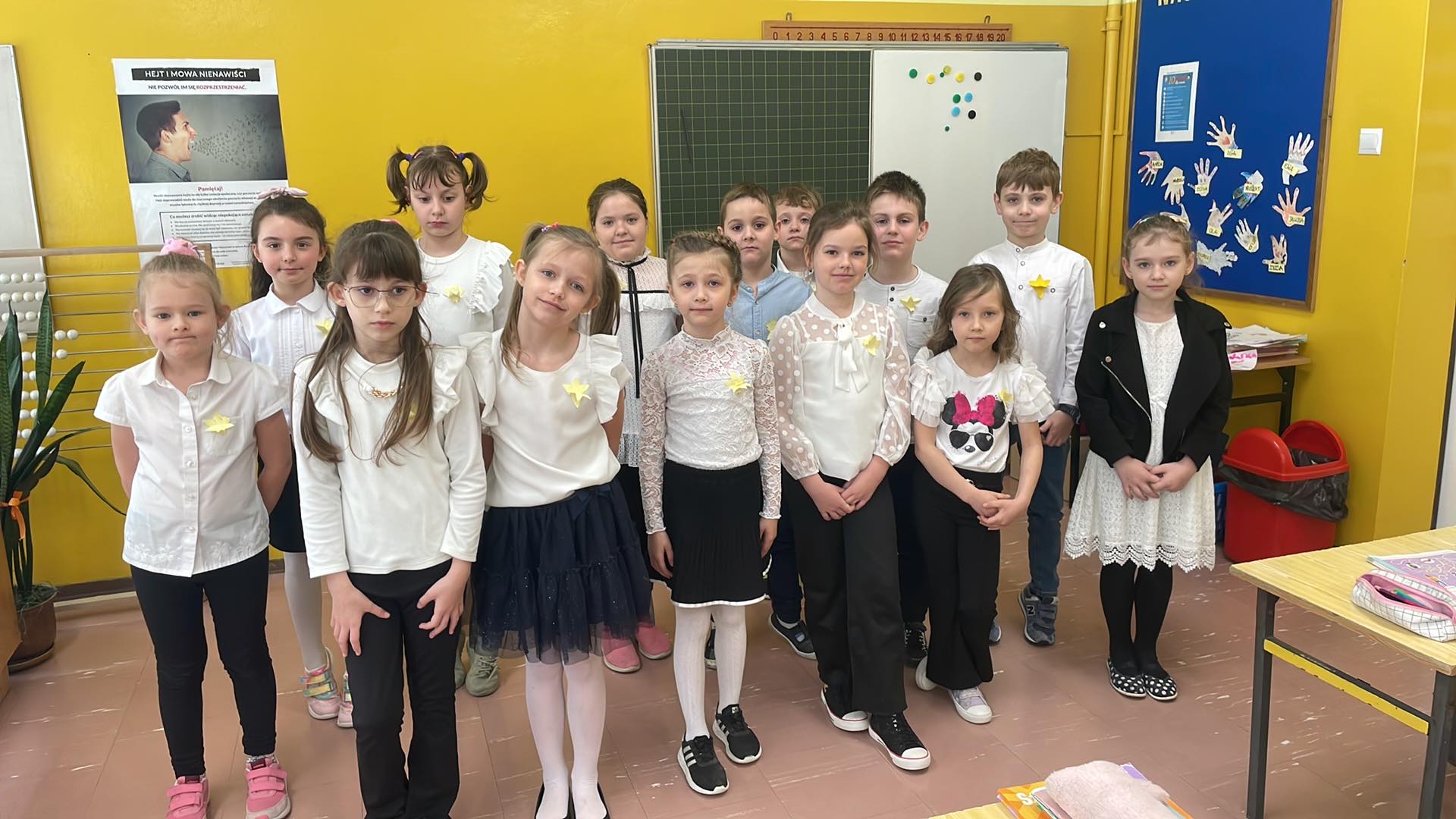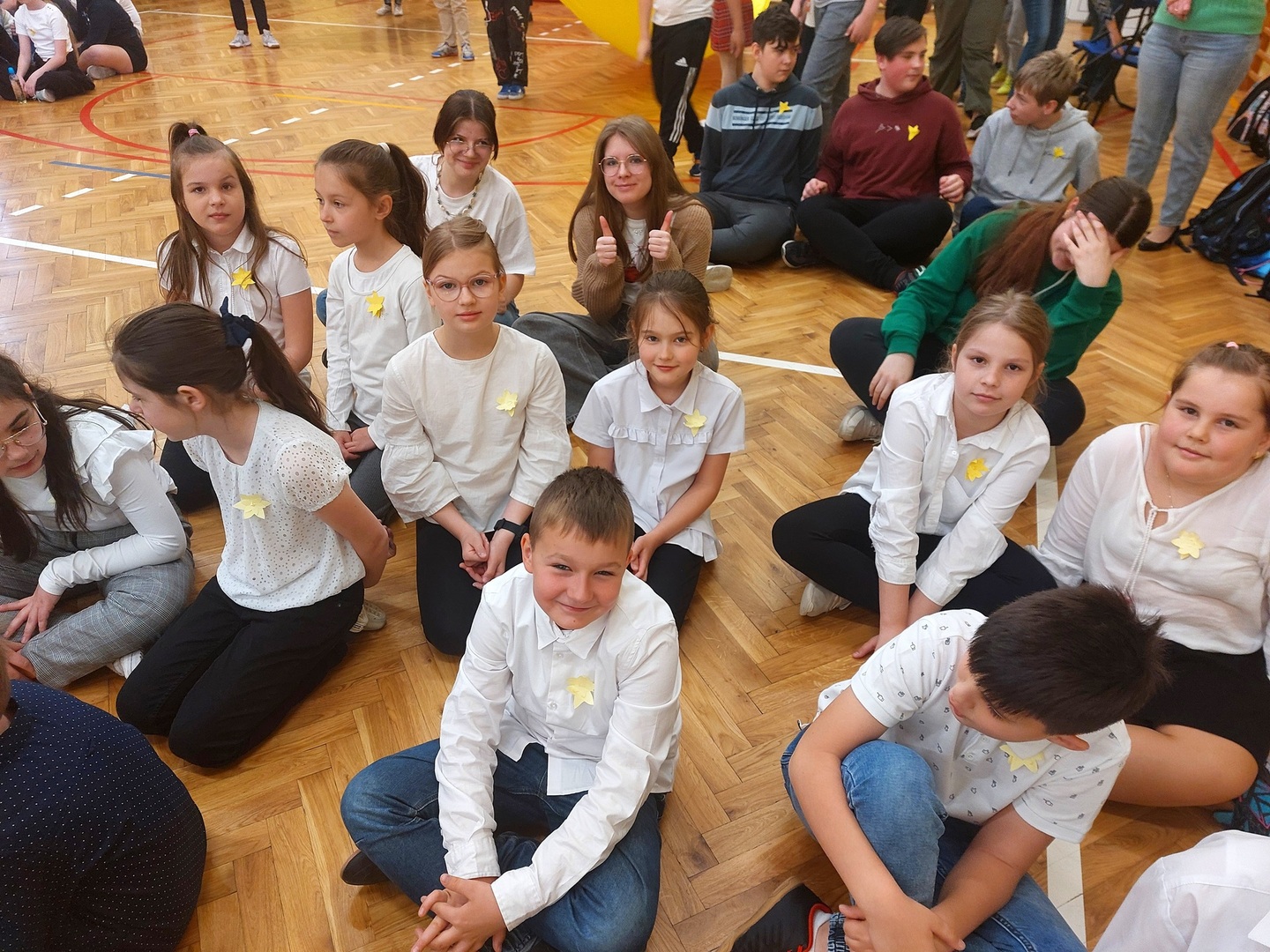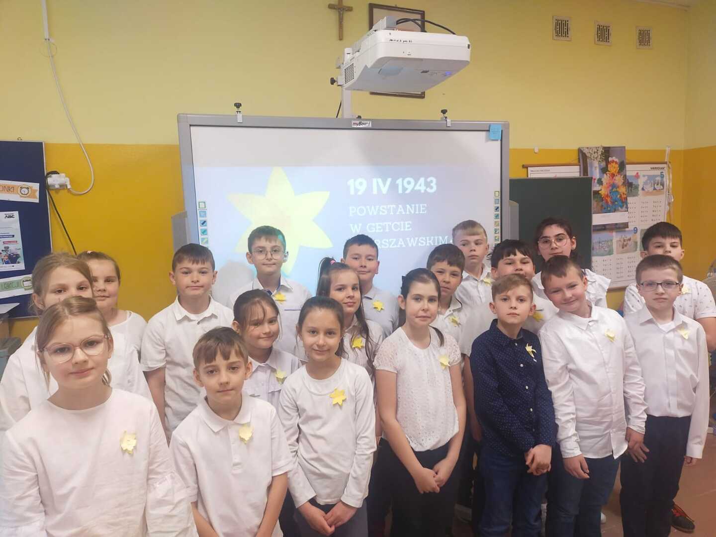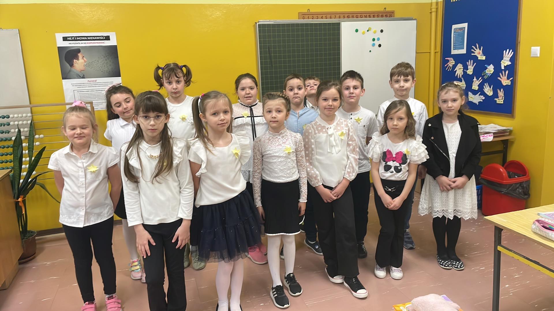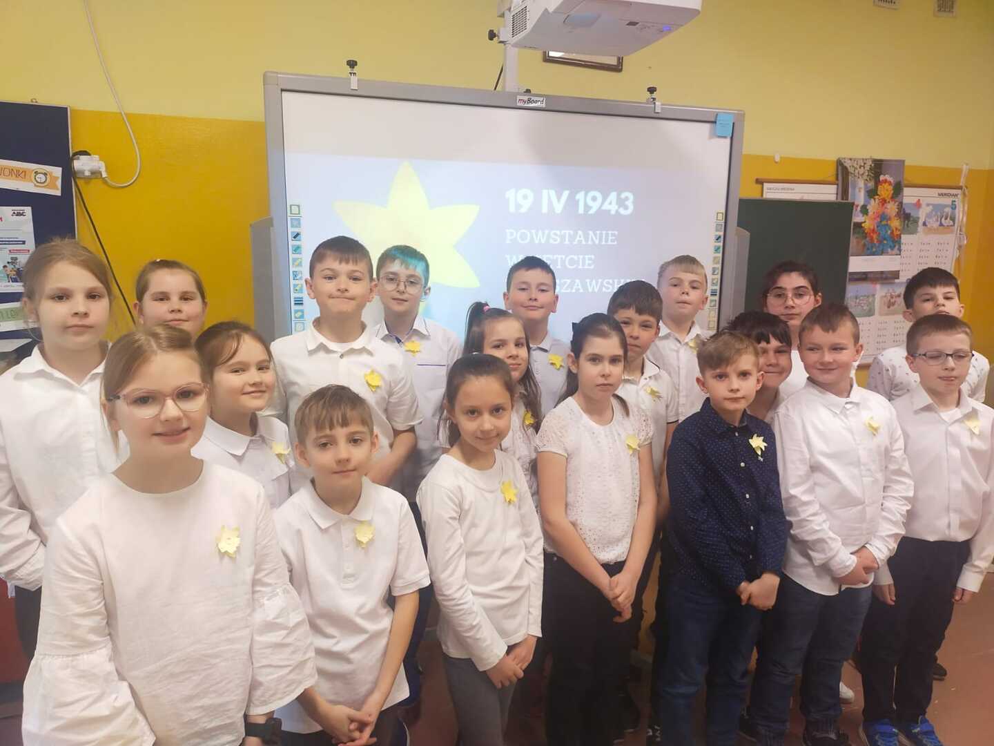 Uczniowie wraz z wychowawcami wykonali papierowe, żółte żonkile, który zostały przypięte do białych bluzek.