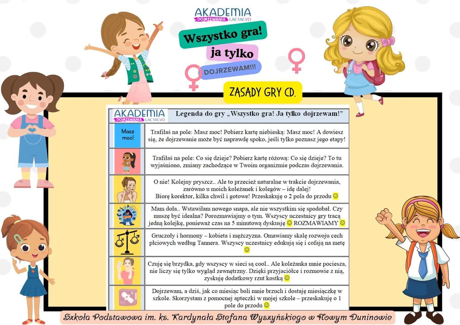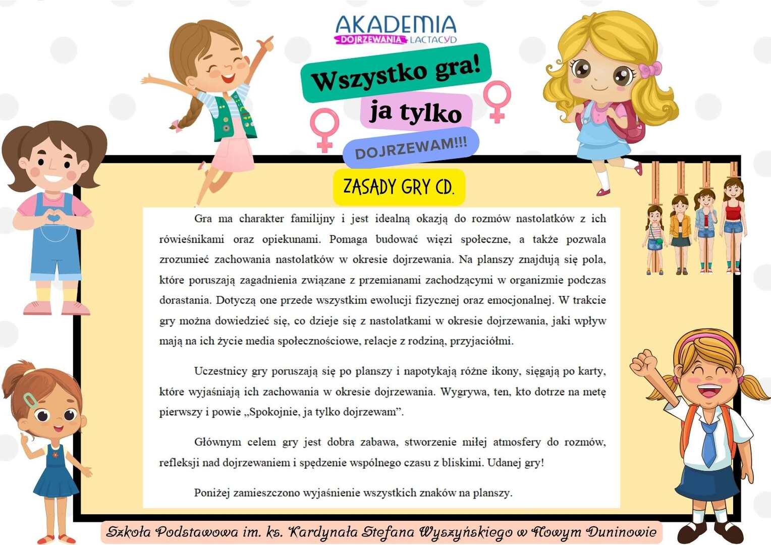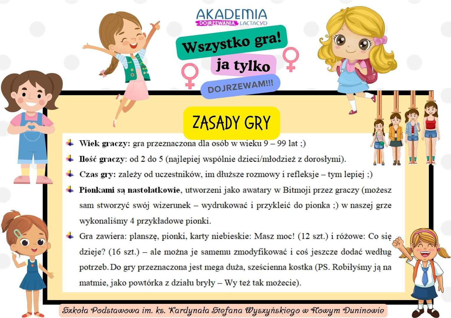 Przedmiotem Konkursu było stworzenie koncepcji i wykonanie gry planszowej o tematyce dojrzewania. Uczennice klas piątych we współpracy z Panią Agnieszką Paradowską wykonali projekt gry planszowej na lekcjach informatyki. Gra została wydrukowana w formie plakatu. Dziewczynki zrobiły pionki z własnym awatarami w Snapchacie oraz giga kostkę w kształcie sześcianu. Gra miała charakter familijny i poruszała między innymi takie zagadnienia jak: przemiany fizyczne i emocjonalne podczas dojrzewania; zmiany w relacjach z rodziną, przyjaciółmi i społecznością; postrzeżenia na temat tożsamości, poczucia własnej wartości i akceptacji siebie; wyzwania i radości związane z okresem dojrzewania; wpływ mediów społecznościowych na postrzeganie własnego ciała i tożsamości.
