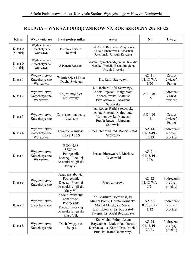 Poniżej podajemy wykaz podręczników do nauki religii na rok szkolny 2024/2025, które należy zakupić.