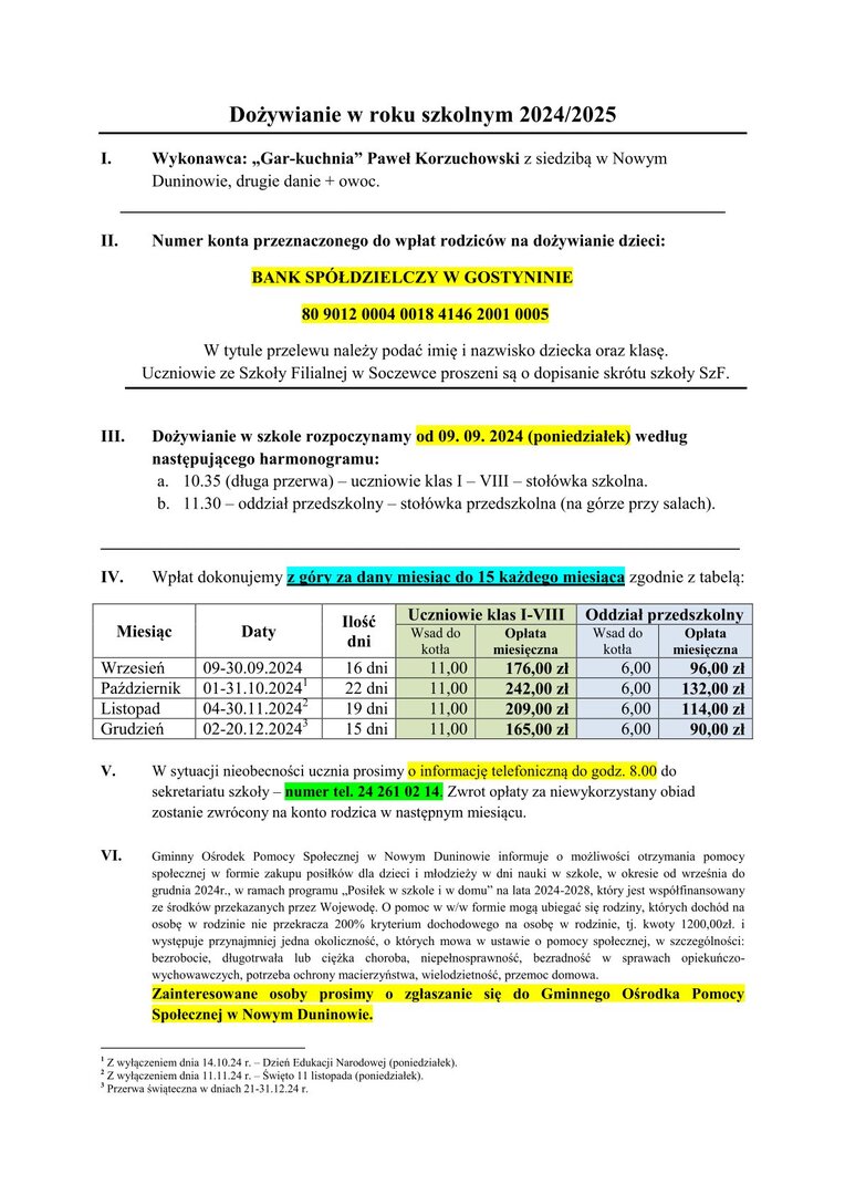 poniżej przedstawiamy informacje na temat dożywiania w szkole, które rozpocznie się z dniem 9 września 2024r.