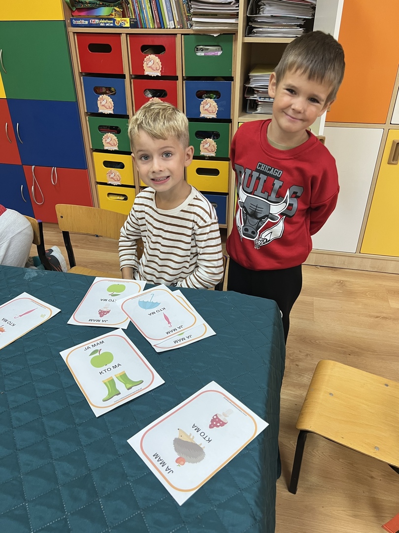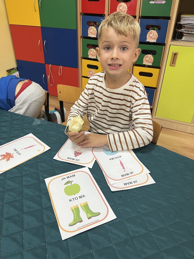 Wszystkie kolejne zabawy podczas pobytu dzieci w tym dniu w przedszkolu dotyczyły oczywiście jabłek. Były to zabawy dydaktyczne, ruchowe, matematyczne oraz logopedyczne.
