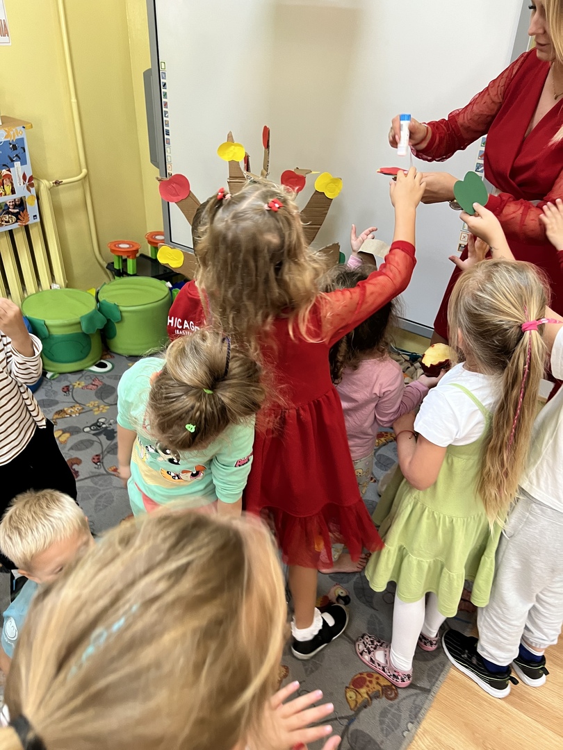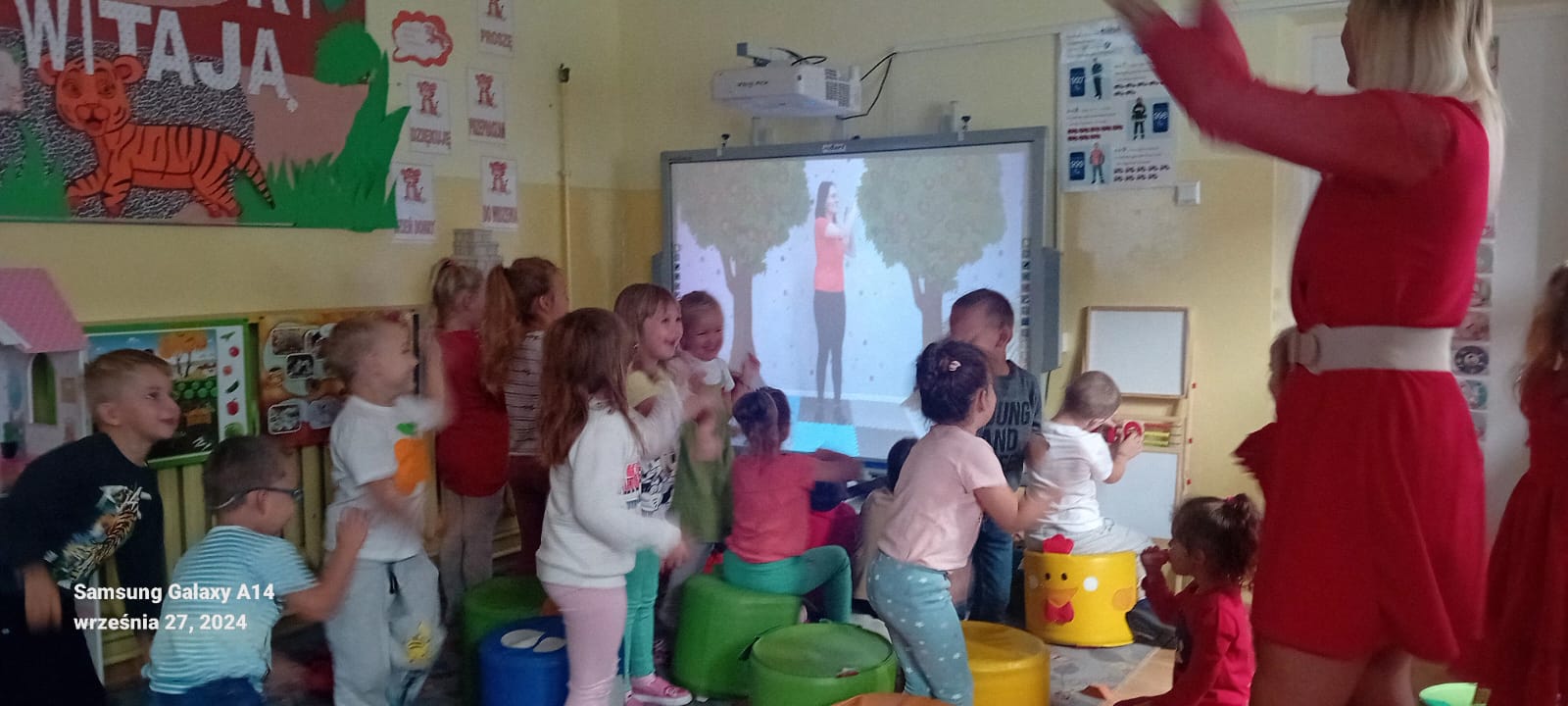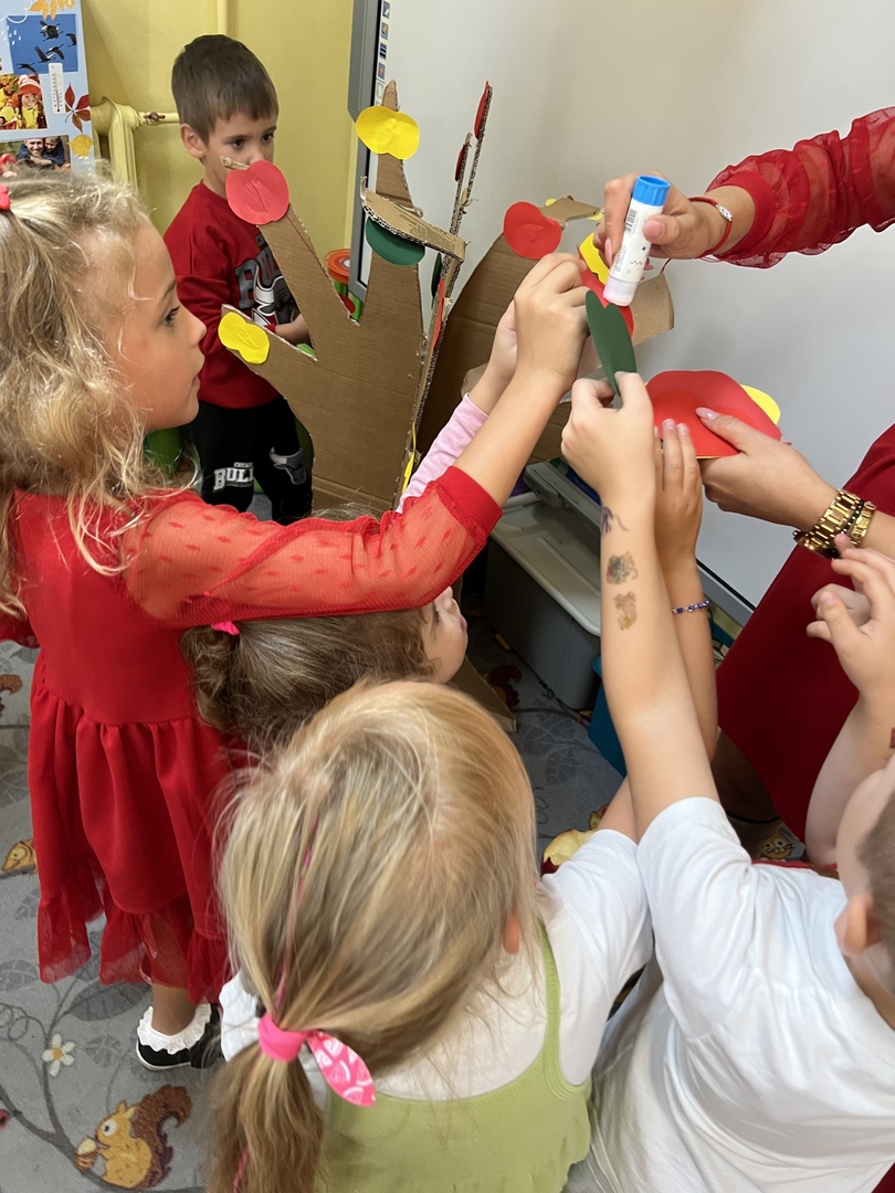 Przedszkolaki obejrzały film edukacyjne „Jabłuszko – największe sady owocowe w Polsce”. Następnie stworzyliśmy wspólna duża jablonke, na której dzieci zawieszały swoje papierowe jabłuszka.