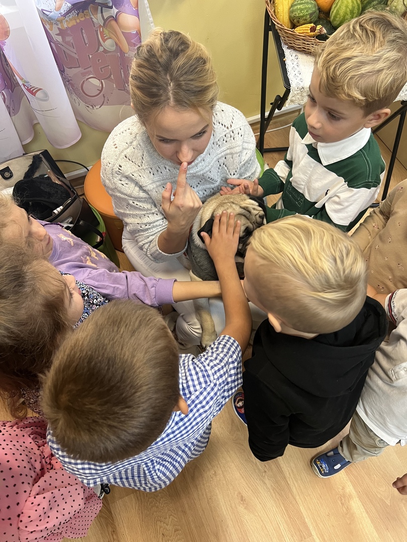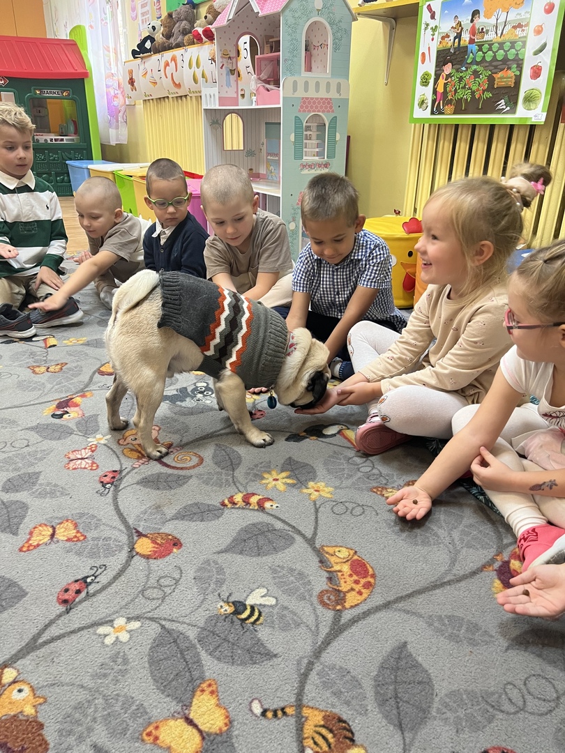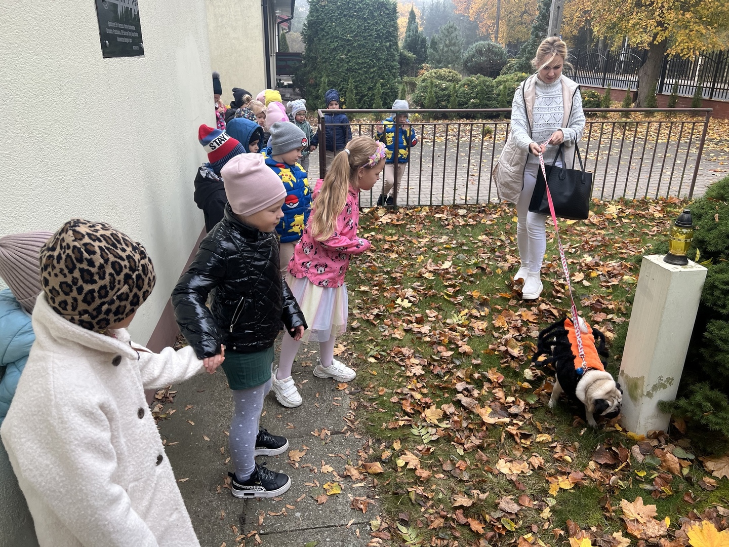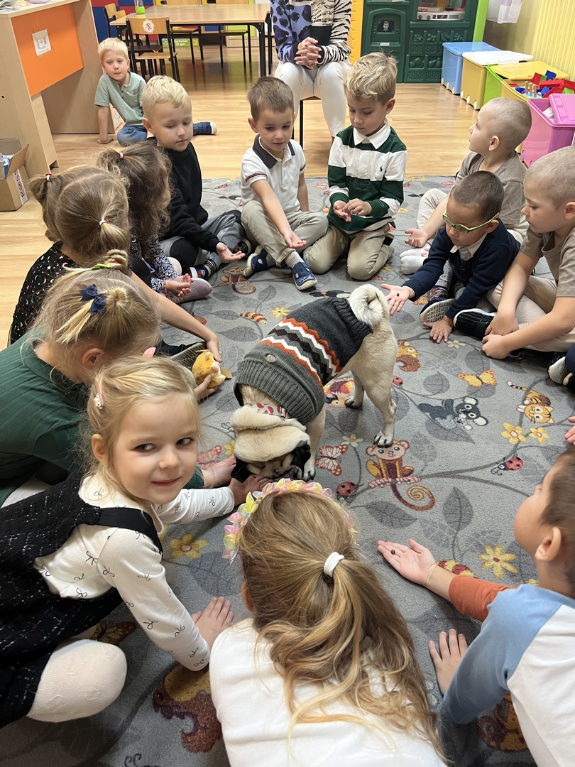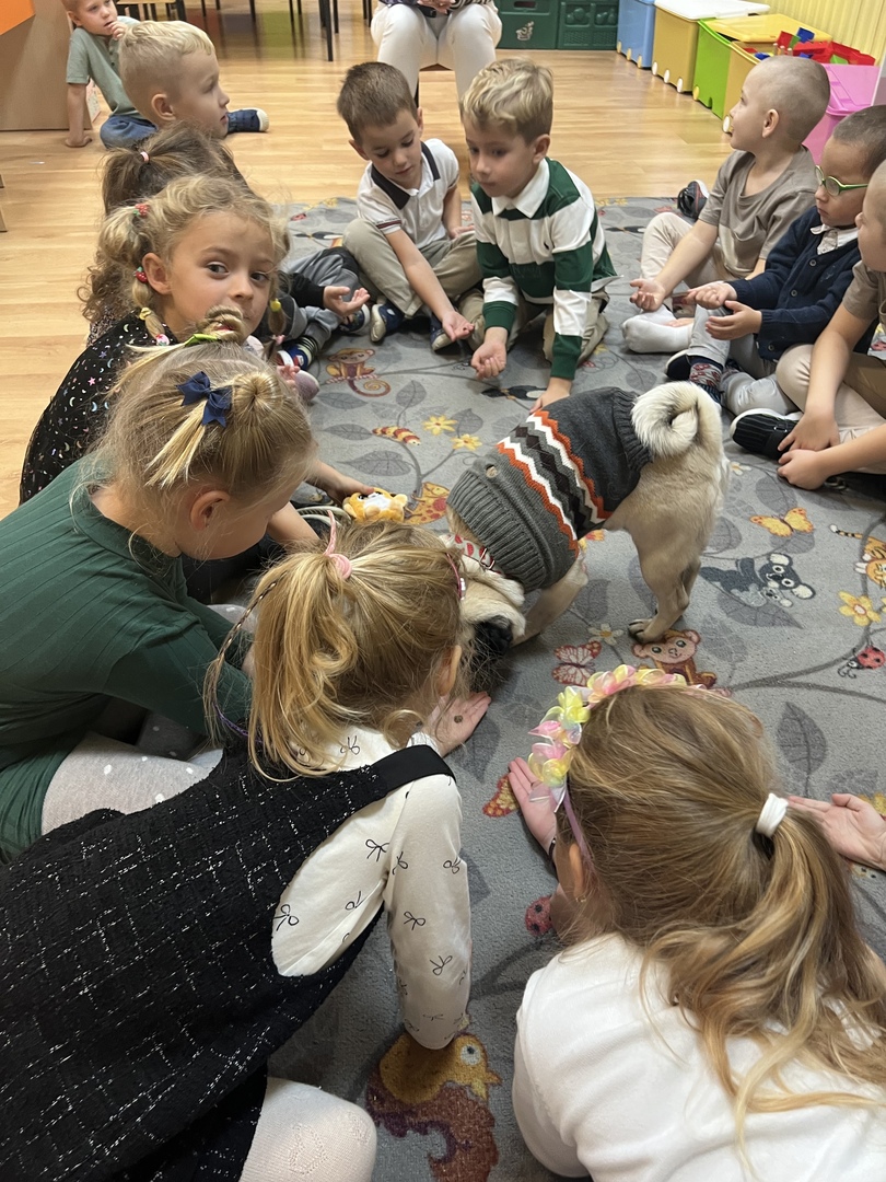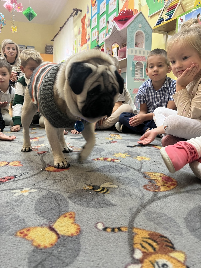 Tego dnia w naszym przedszkolu gościliśmy wspaniałych gości, a mianowicie odwiedziła nas Pani Karolina Suwała ze swoim psem Melem. Mel to pies rasy MOPS, jest to bardzo miły i przyjazny pies o czym przekonały się dzieci głaszcząc go i pozując do zdjęć. Pani Karolina opowiedziała nam o umiejętnościach jakie posiada jej pies, jak należy opiekować się psem, czym karmić i jak spędzać z nim czas. Na koniec każdy mógł wyprowadzić Mela na spacer, prowadząc go samodzielnie na smyczy. Bardzo dziękujemy, za tak miłe spotkanie i upominki dla naszych przedszkolaków.