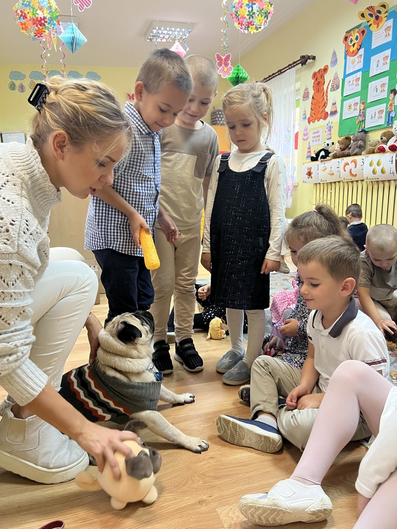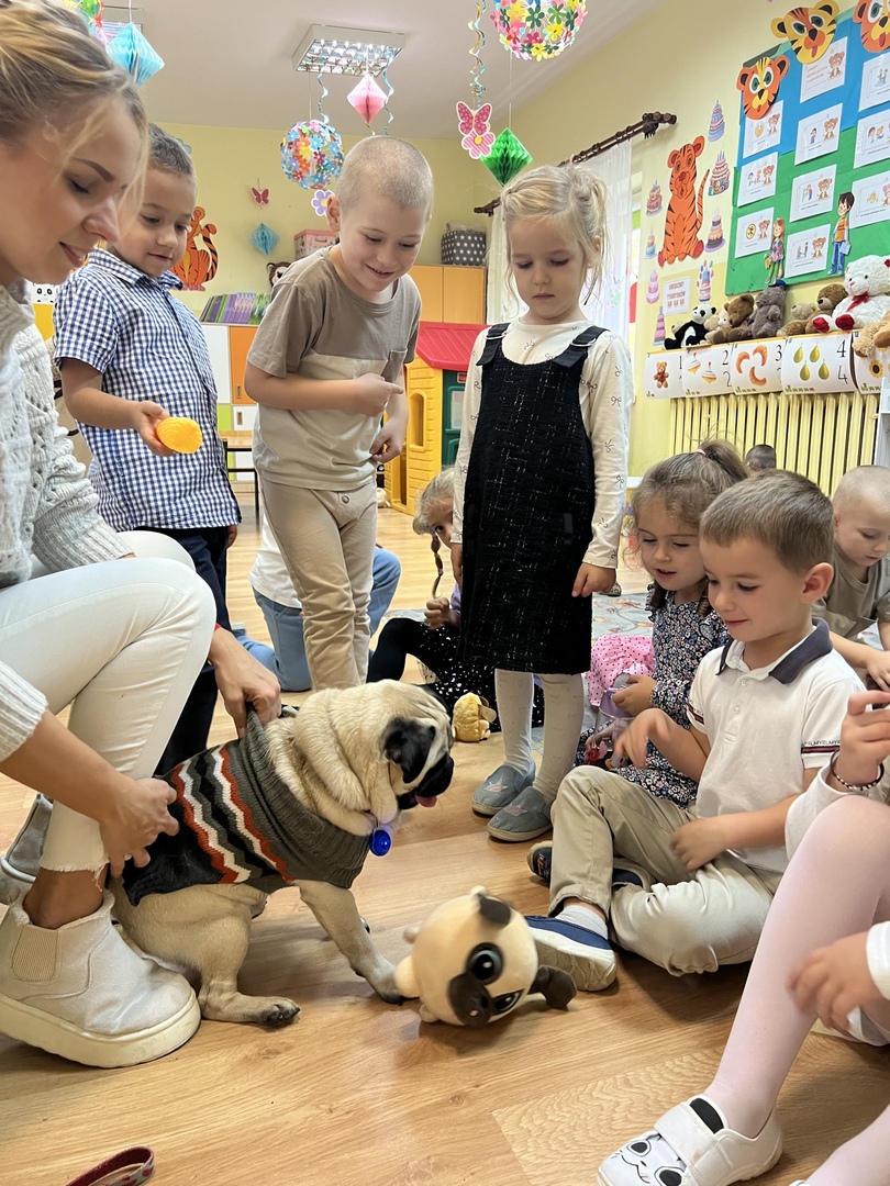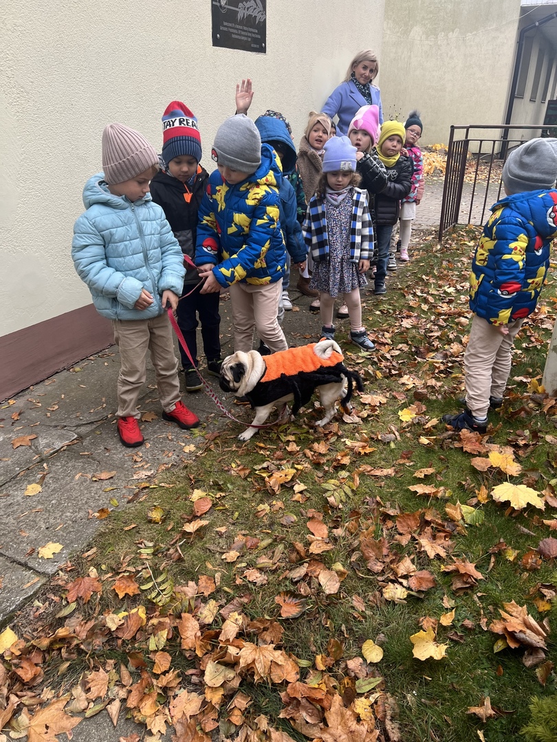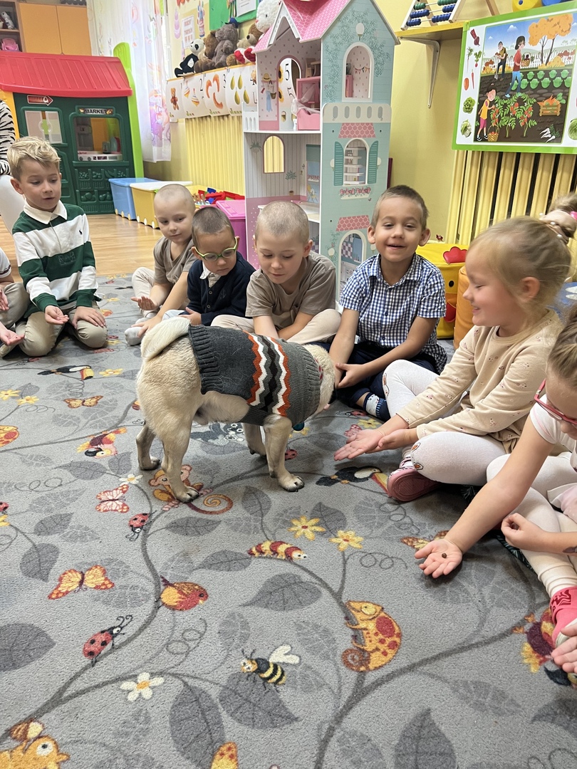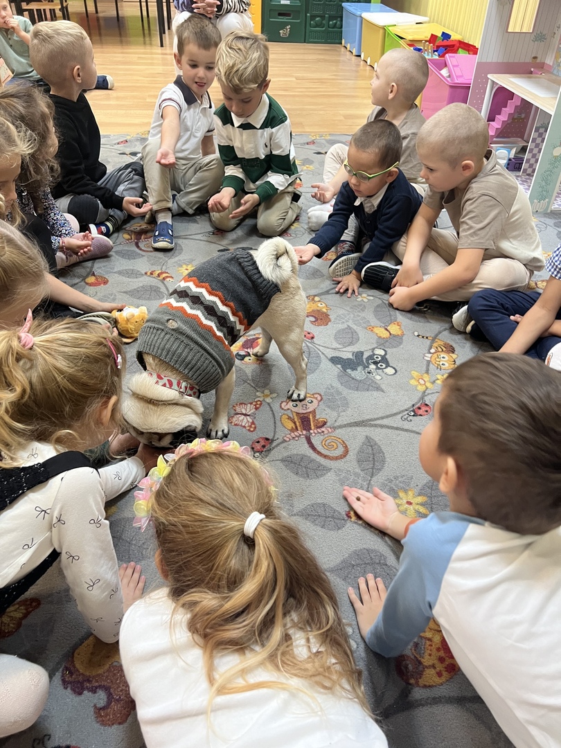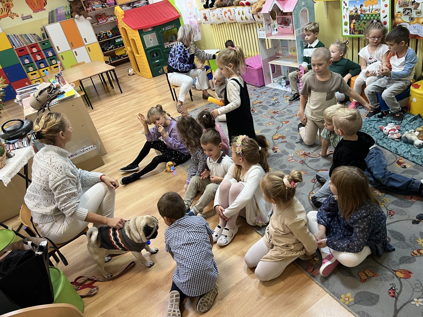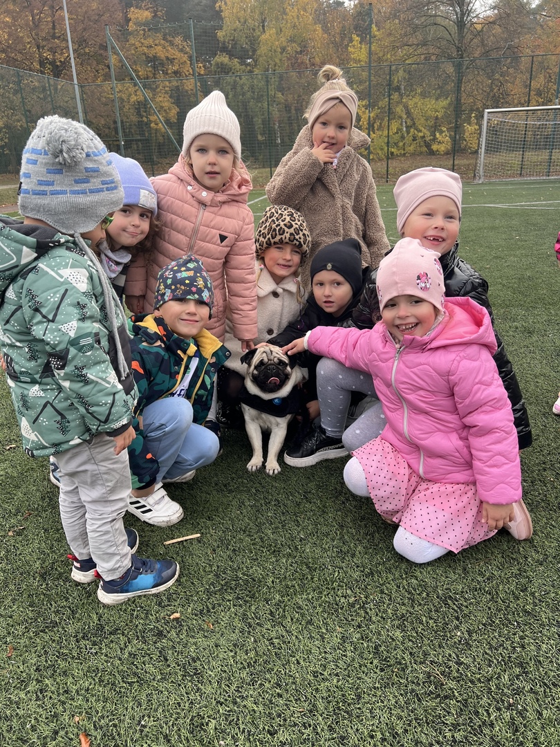 Tego dnia w naszym przedszkolu gościliśmy wspaniałych gości, a mianowicie odwiedziła nas Pani Karolina Suwała ze swoim psem Melem. Mel to pies rasy MOPS, jest to bardzo miły i przyjazny pies o czym przekonały się dzieci głaszcząc go i pozując do zdjęć. Pani Karolina opowiedziała nam o umiejętnościach jakie posiada jej pies, jak należy opiekować się psem, czym karmić i jak spędzać z nim czas. Na koniec każdy mógł wyprowadzić Mela na spacer, prowadząc go samodzielnie na smyczy. Bardzo dziękujemy, za tak miłe spotkanie i upominki dla naszych przedszkolaków.