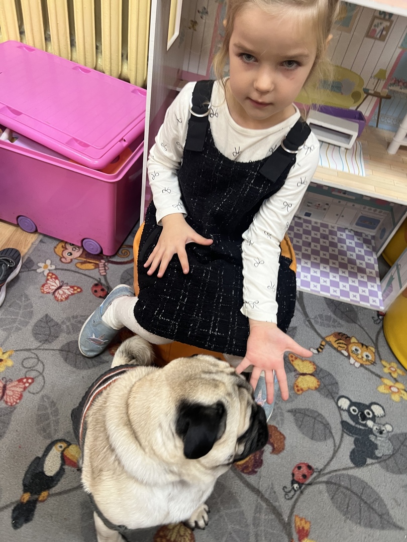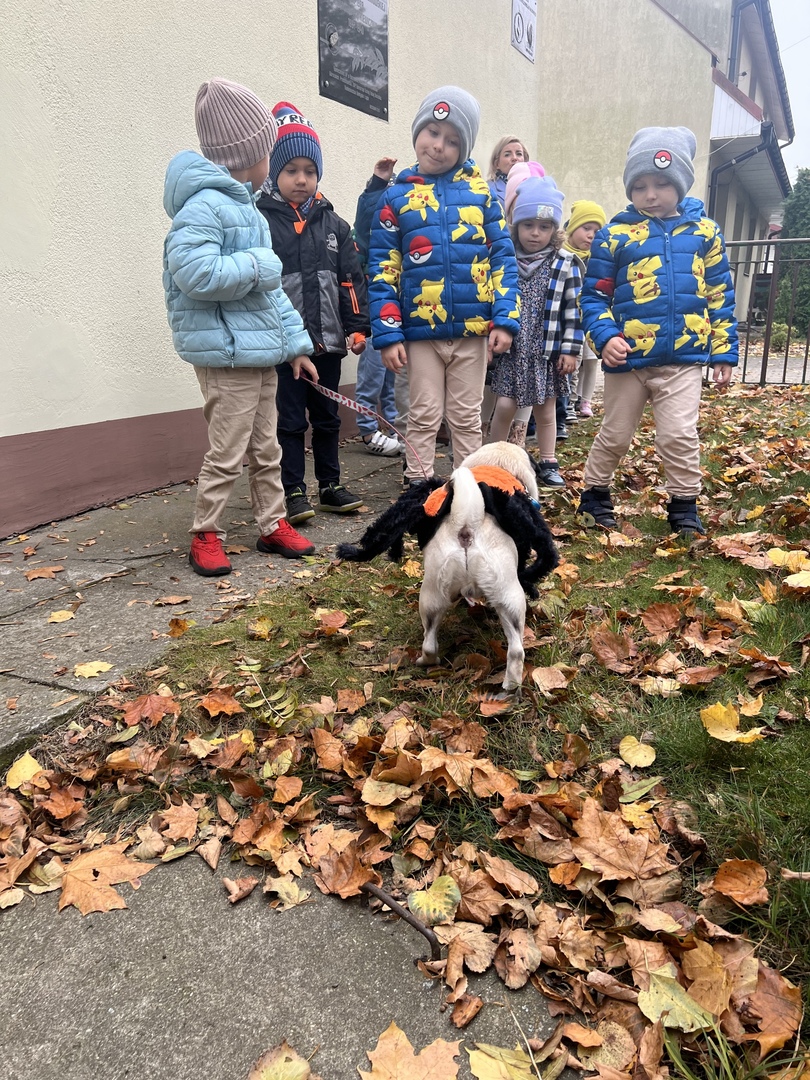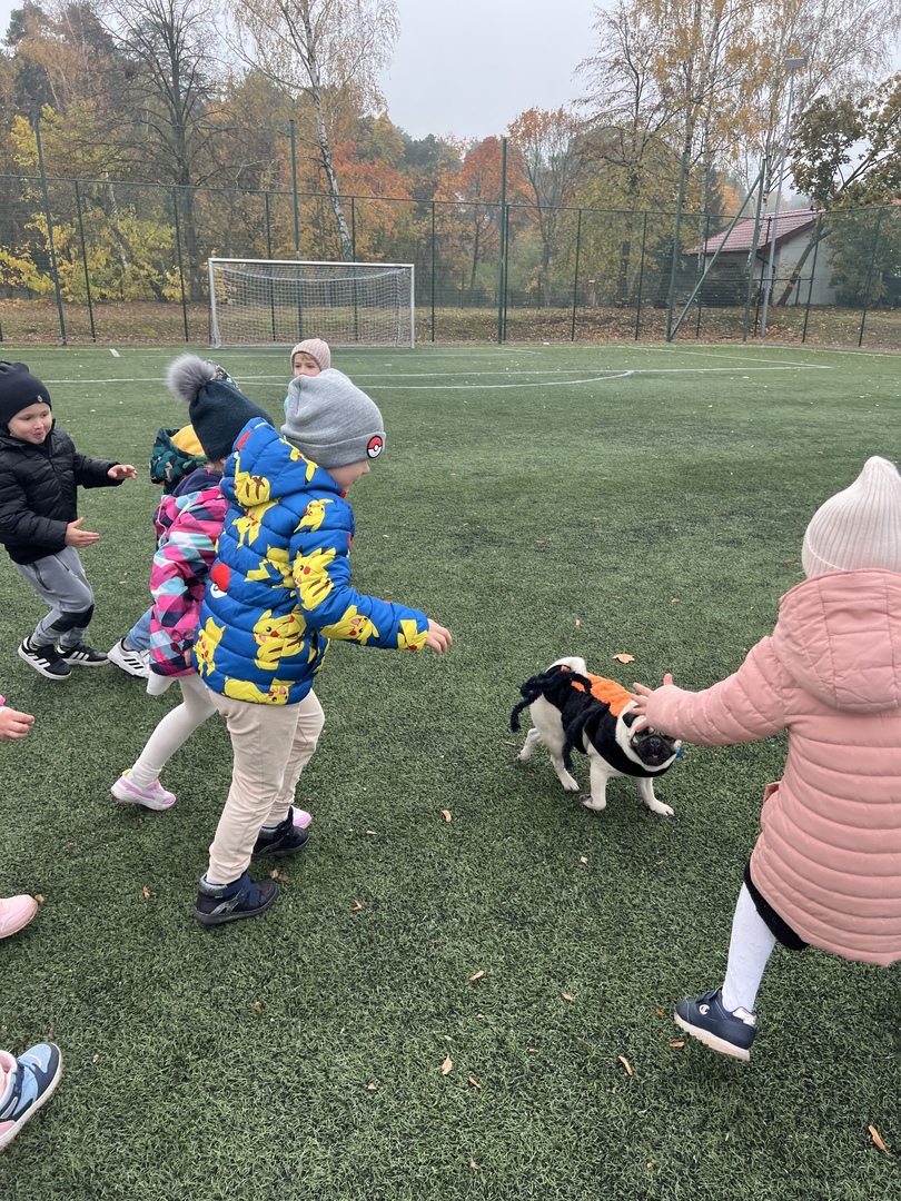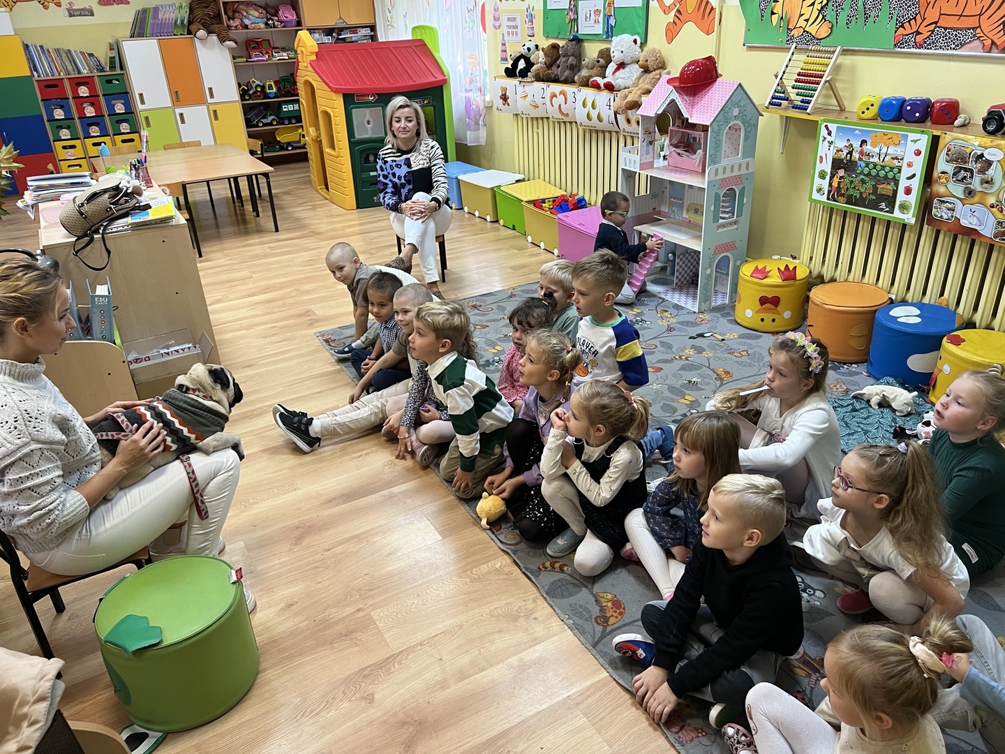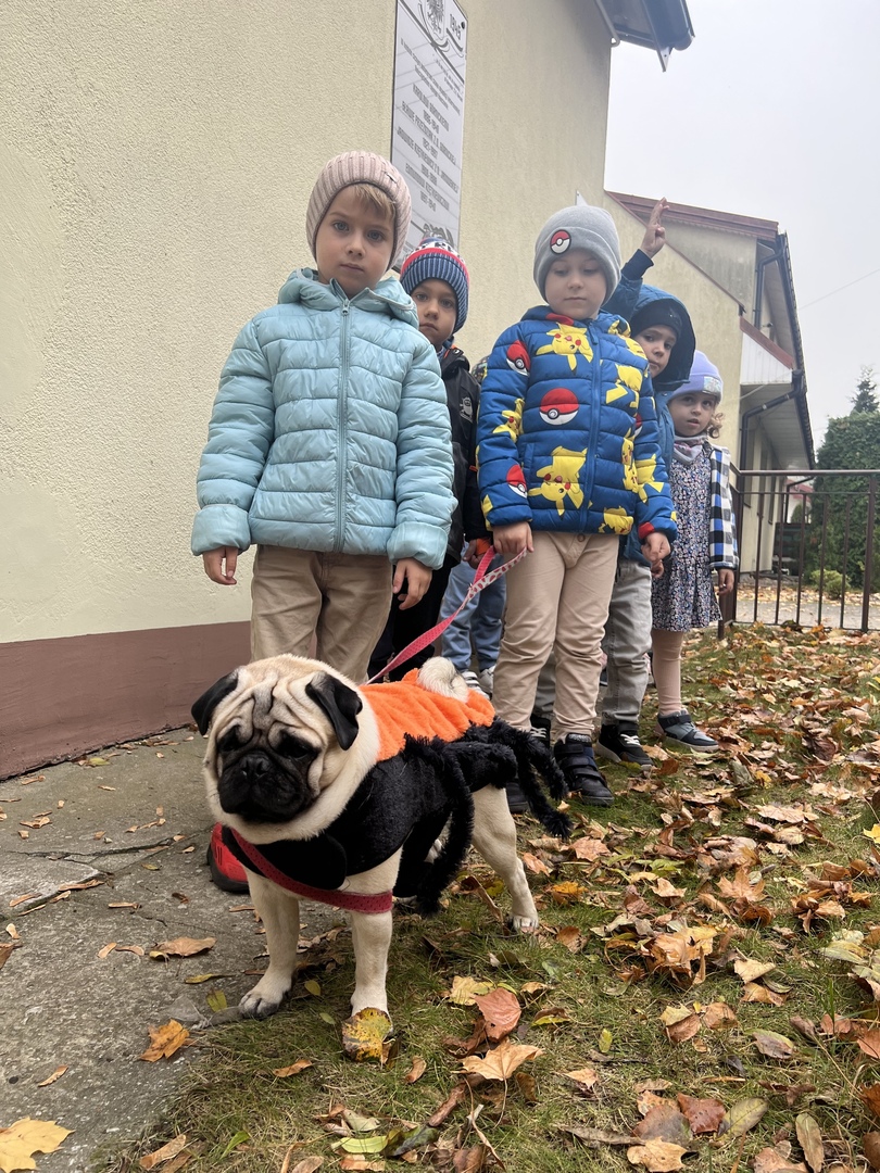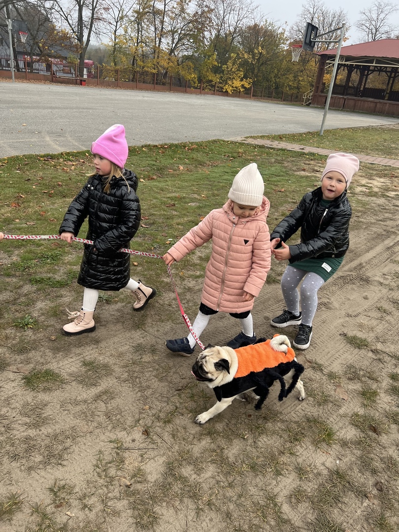 Tego dnia w naszym przedszkolu gościliśmy wspaniałych gości, a mianowicie odwiedziła nas Pani Karolina Suwała ze swoim psem Melem. Mel to pies rasy MOPS, jest to bardzo miły i przyjazny pies o czym przekonały się dzieci głaszcząc go i pozując do zdjęć. Pani Karolina opowiedziała nam o umiejętnościach jakie posiada jej pies, jak należy opiekować się psem, czym karmić i jak spędzać z nim czas. Na koniec każdy mógł wyprowadzić Mela na spacer, prowadząc go samodzielnie na smyczy. Bardzo dziękujemy, za tak miłe spotkanie i upominki dla naszych przedszkolaków.