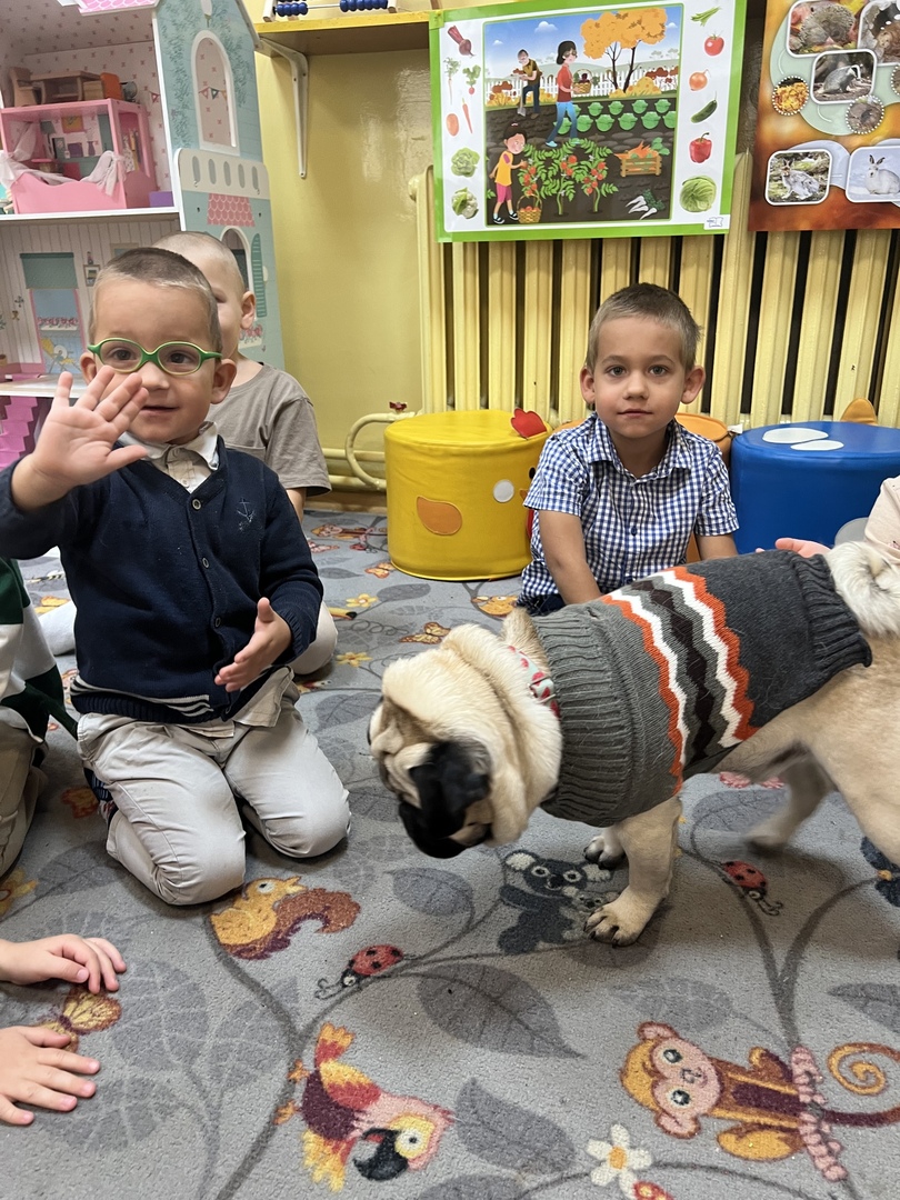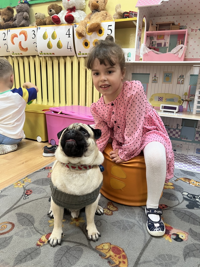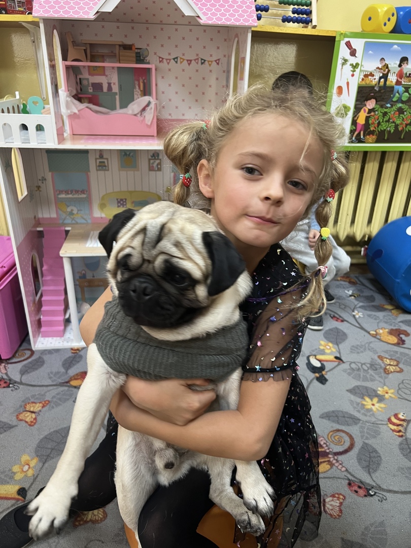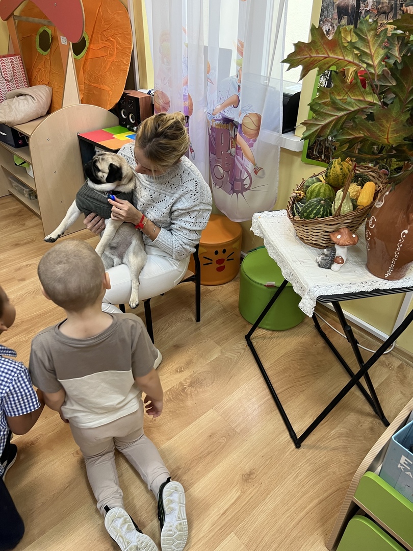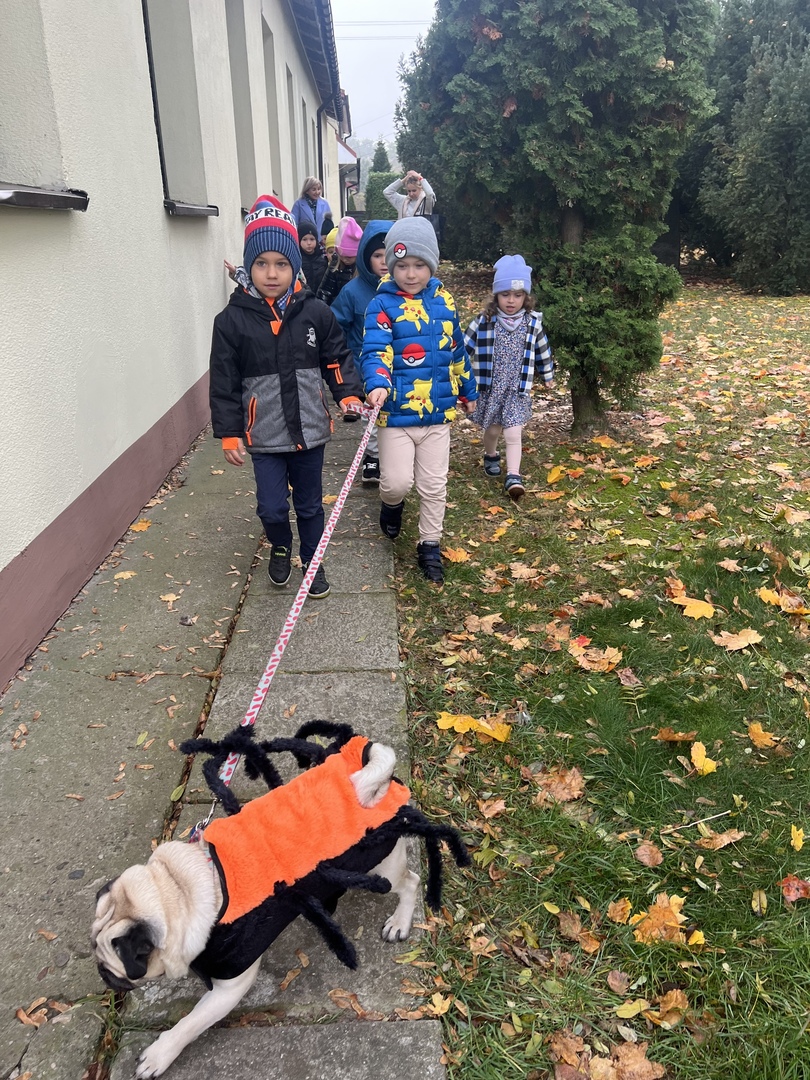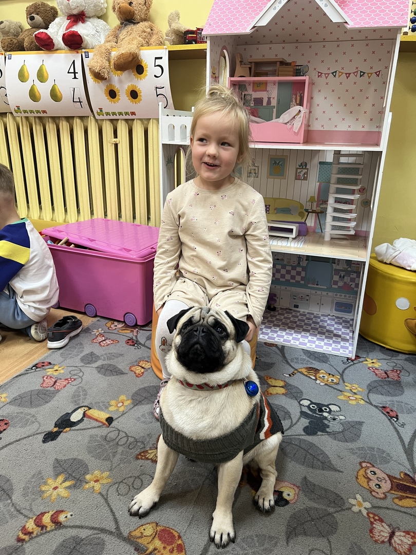 Tego dnia w naszym przedszkolu gościliśmy wspaniałych gości, a mianowicie odwiedziła nas Pani Karolina Suwała ze swoim psem Melem. Mel to pies rasy MOPS, jest to bardzo miły i przyjazny pies o czym przekonały się dzieci głaszcząc go i pozując do zdjęć. Pani Karolina opowiedziała nam o umiejętnościach jakie posiada jej pies, jak należy opiekować się psem, czym karmić i jak spędzać z nim czas. Na koniec każdy mógł wyprowadzić Mela na spacer, prowadząc go samodzielnie na smyczy. Bardzo dziękujemy, za tak miłe spotkanie i upominki dla naszych przedszkolaków.