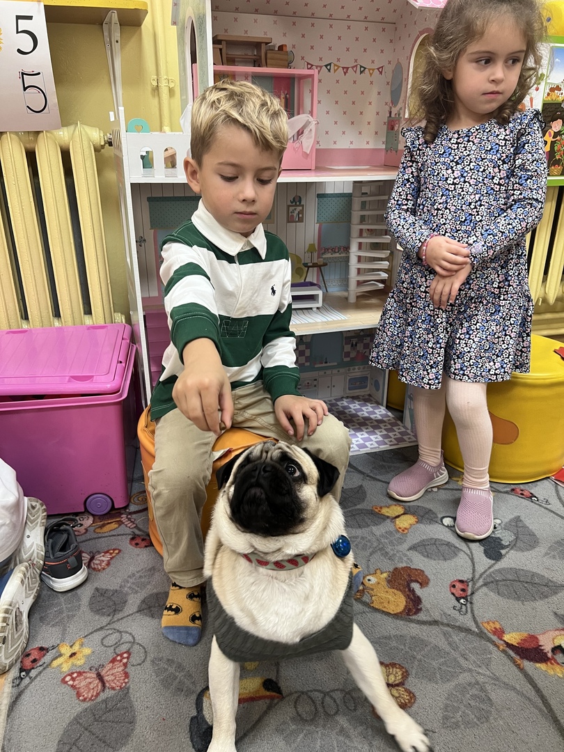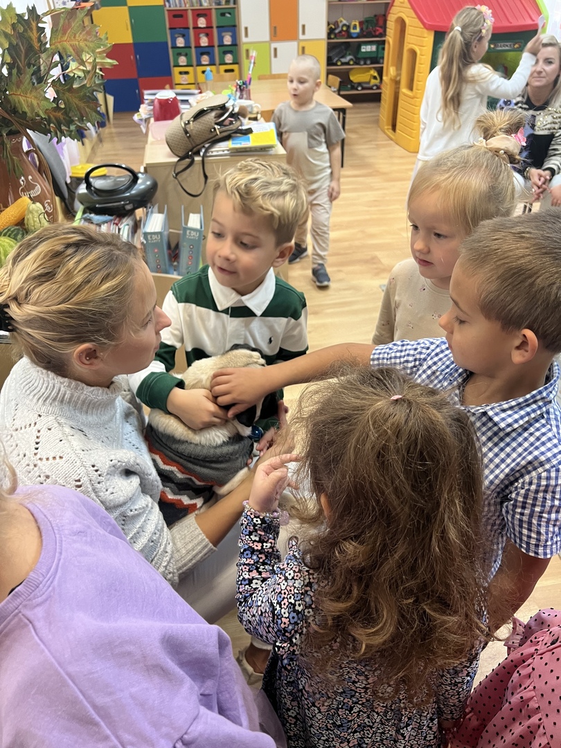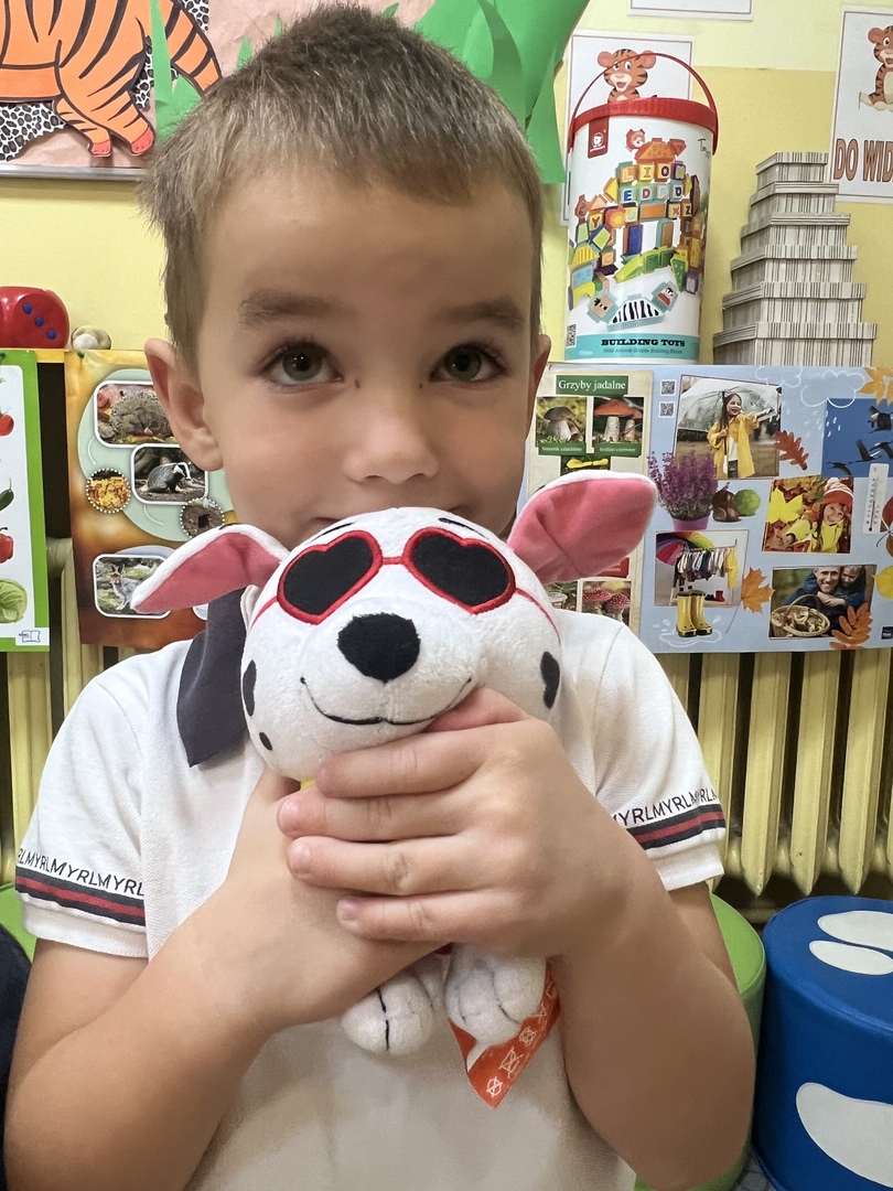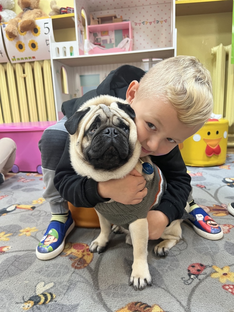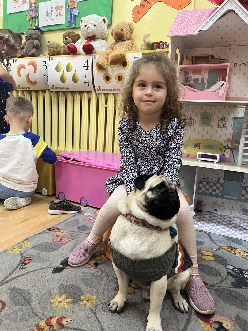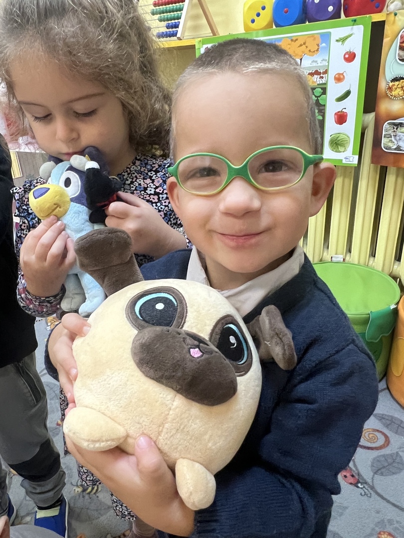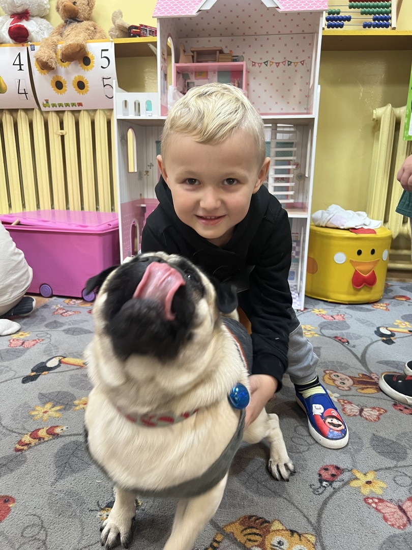 Tego dnia w naszym przedszkolu gościliśmy wspaniałych gości, a mianowicie odwiedziła nas Pani Karolina Suwała ze swoim psem Melem. Mel to pies rasy MOPS, jest to bardzo miły i przyjazny pies o czym przekonały się dzieci głaszcząc go i pozując do zdjęć. Pani Karolina opowiedziała nam o umiejętnościach jakie posiada jej pies, jak należy opiekować się psem, czym karmić i jak spędzać z nim czas. Na koniec każdy mógł wyprowadzić Mela na spacer, prowadząc go samodzielnie na smyczy. Bardzo dziękujemy, za tak miłe spotkanie i upominki dla naszych przedszkolaków.