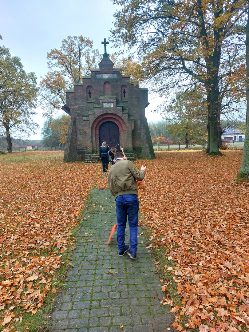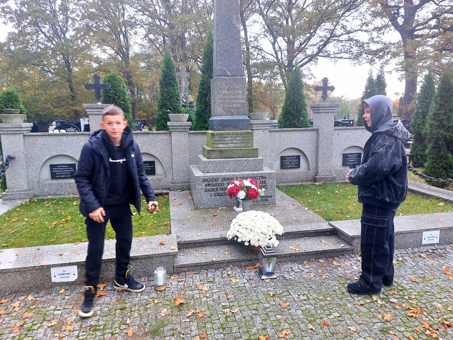 W środę 30 października 2024 uczniowie klasy 6B wraz z Panią Dyrektor Agnieszką Paradowską udali się na stary cmentarz parafialny w Nowym Duninowie i posprzątali kilka teren wokół obeliska. Uczniowie oczyścili mogiły, grabili liście i uprzątnęli alejki. Na końcu zapalili na nagrobkach znicze oraz postawili symboliczne chryzantemy.