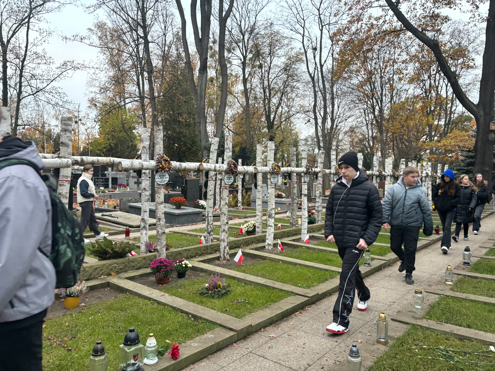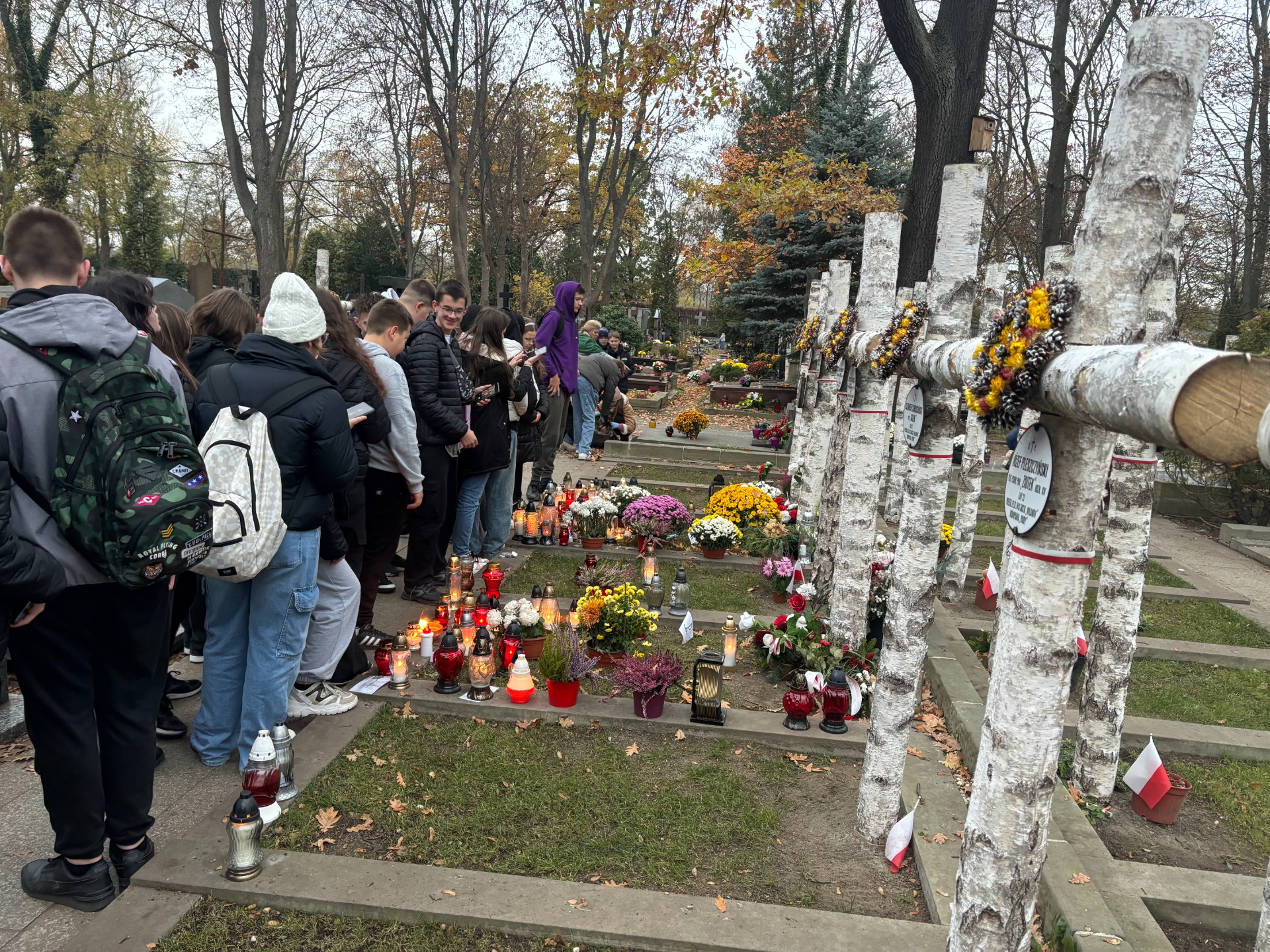 Kolejnym punktem naszej wycieczki był Cmentarz Wojskowy na Powązkach. Wśród grobów członków harcerzy Szarych Szeregów, na których ustawiono białe, brzozowe krzyże, znajduje się miejsce wiecznego spoczynku Zośki, Alka i Rudego. Chwilą zadumy oddaliśmy im cześć.