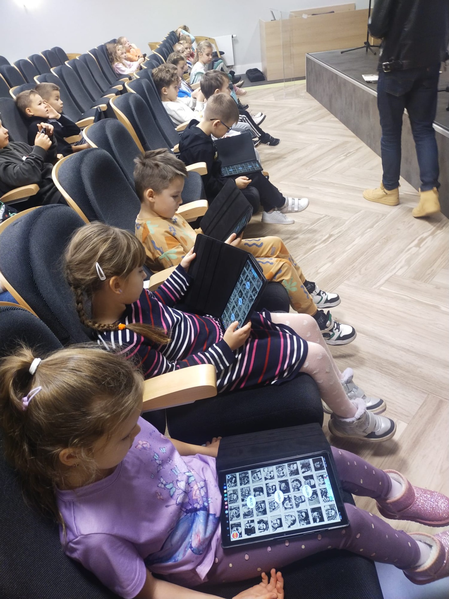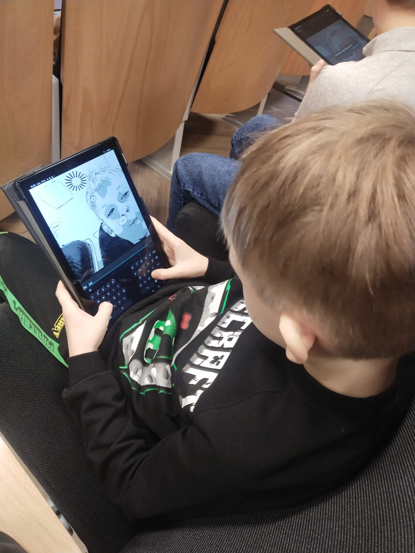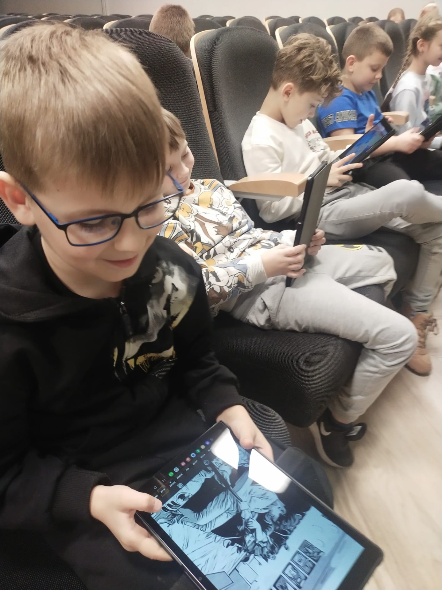 14 listopada uczniowie klasy 1 odwiedzili dział zbiorów audiowizualnych Książnicy Płockiej, zwanej ,,Mediateka eMka,,. Była to dla wszystkich dzieci pierwsza wizyta w tego typu bibliotece. O zbiorach jakie znajdują się w Mediatece opowiedziała dzieciom pani kierownik Bogumiła Tobota, a następnie wszyscy wzięli udział w warsztatach multimedialnych tworzenia komiksów w aplikacji przy pomocy tabletów. Uczniowie nauczyli się tworzyć grafikę do komiksów, wstawiać chmurki z napisami, tła i inne kolorowe elementy. Stworzone samodzielnie karty komiksów zachęciły uczniów do dalszej nauki i zabawy z aplikacją Comica. Serdecznie dziękujemy pani kierownik Gminnej Biblioteki Publicznej w Nowym Duninowie pani Krystynie Pruszyńskiej za zapisanie klasy 1 na tak ciekawe i inspirujące warsztaty.