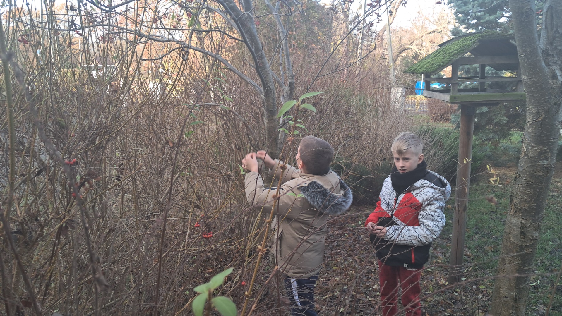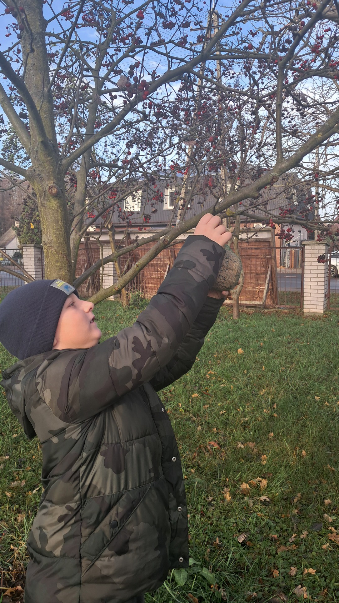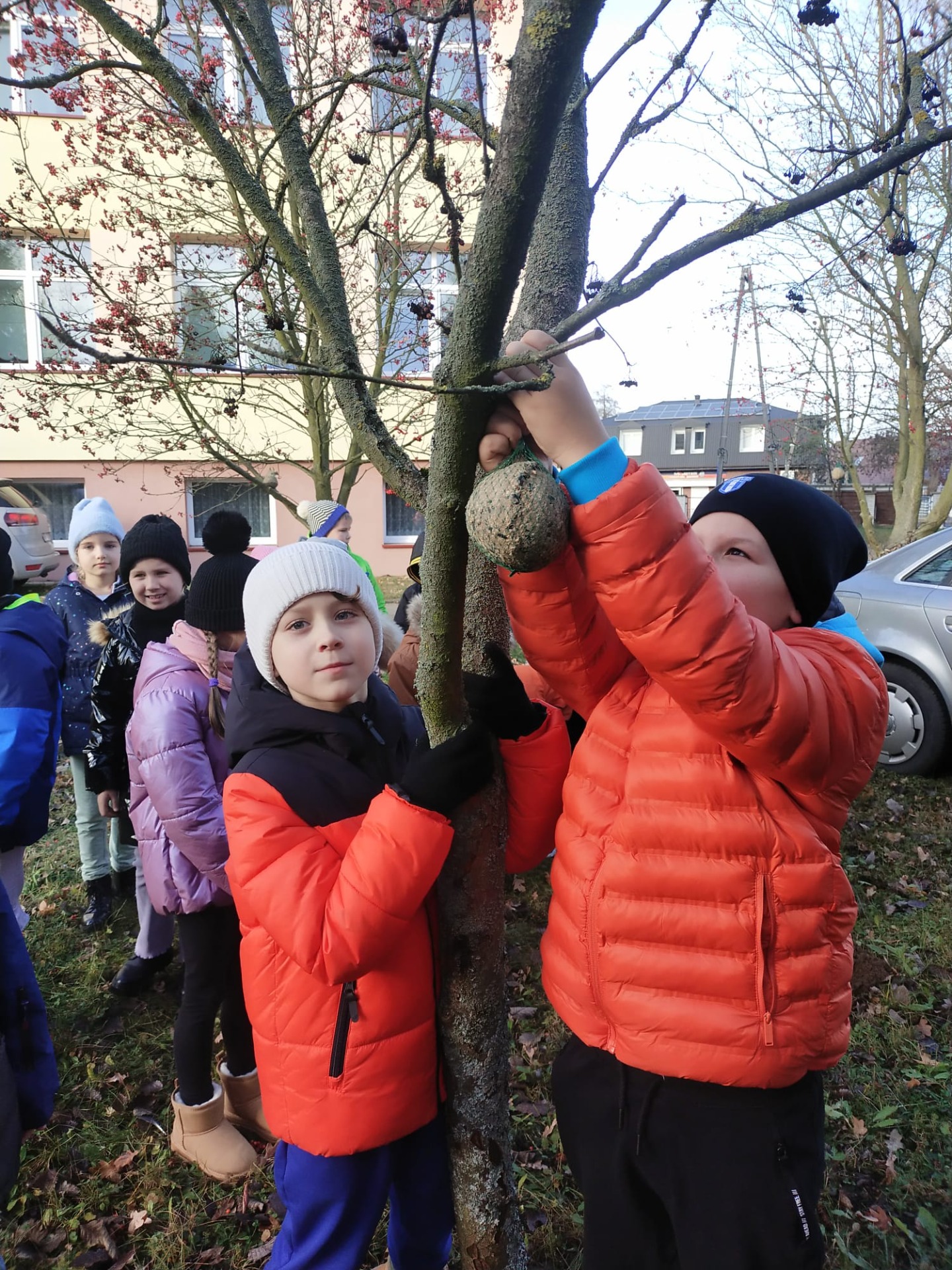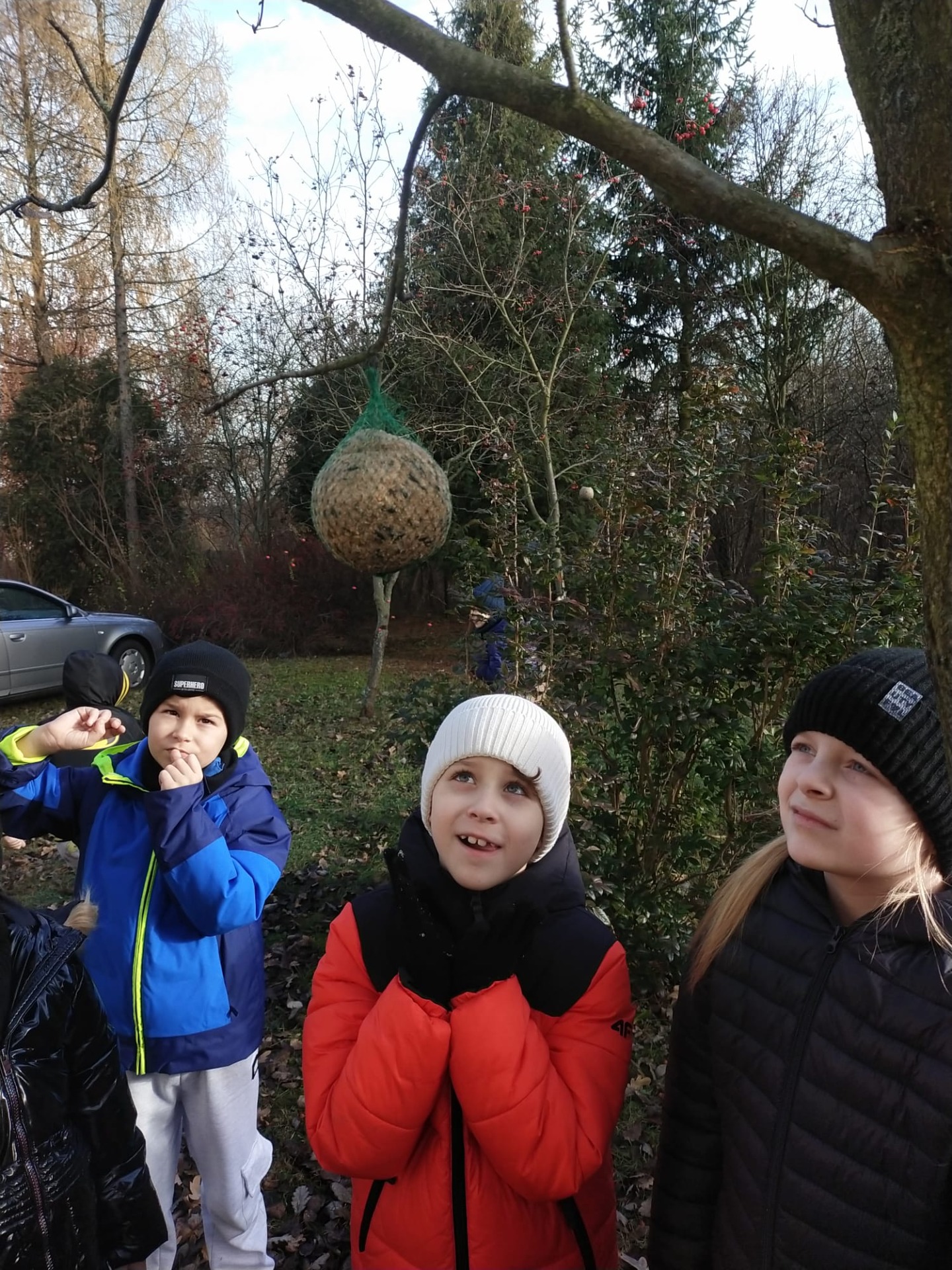 Nasi uczniowie z radością wybrali miejsca umieszczenia pokarmu dla ptaków i mogą je teraz obserwować podczas posiłku z okien swoich klas.