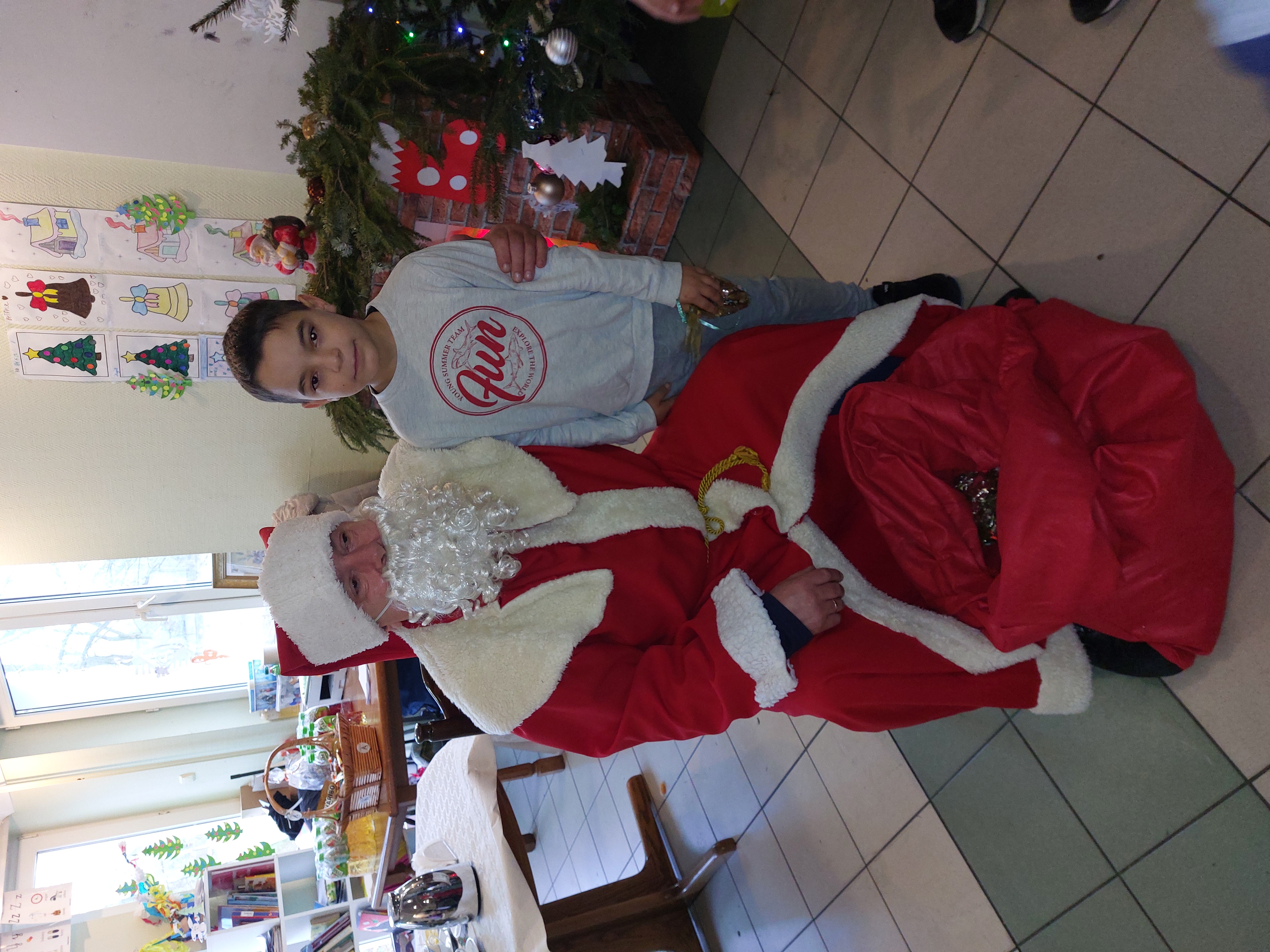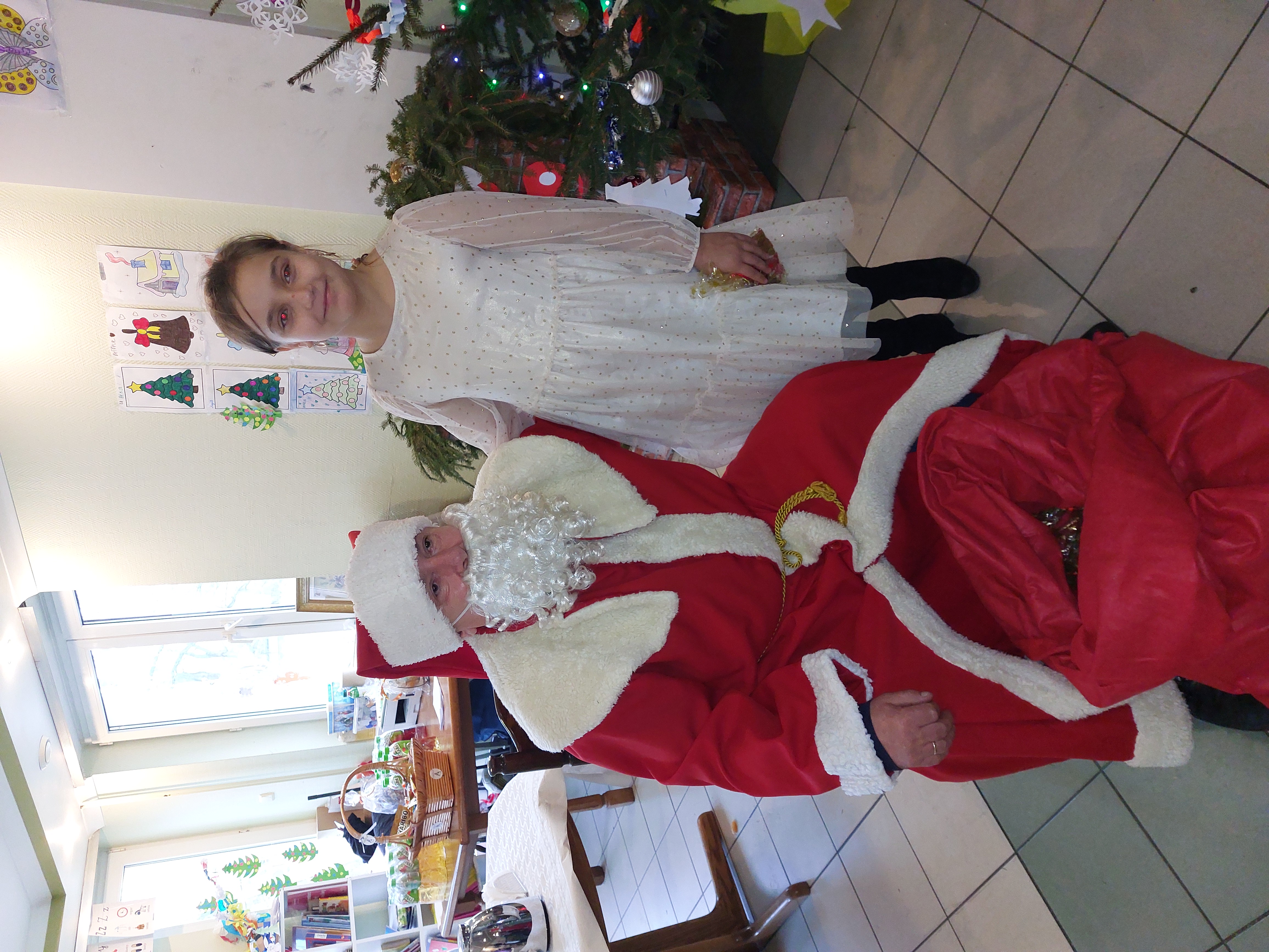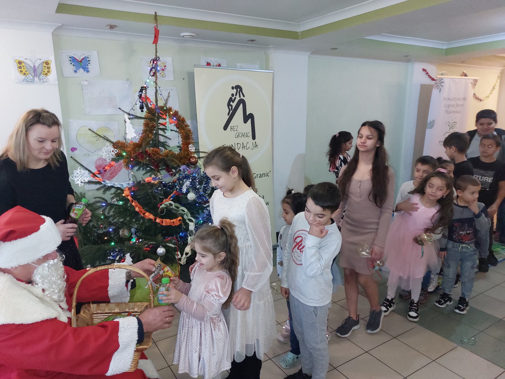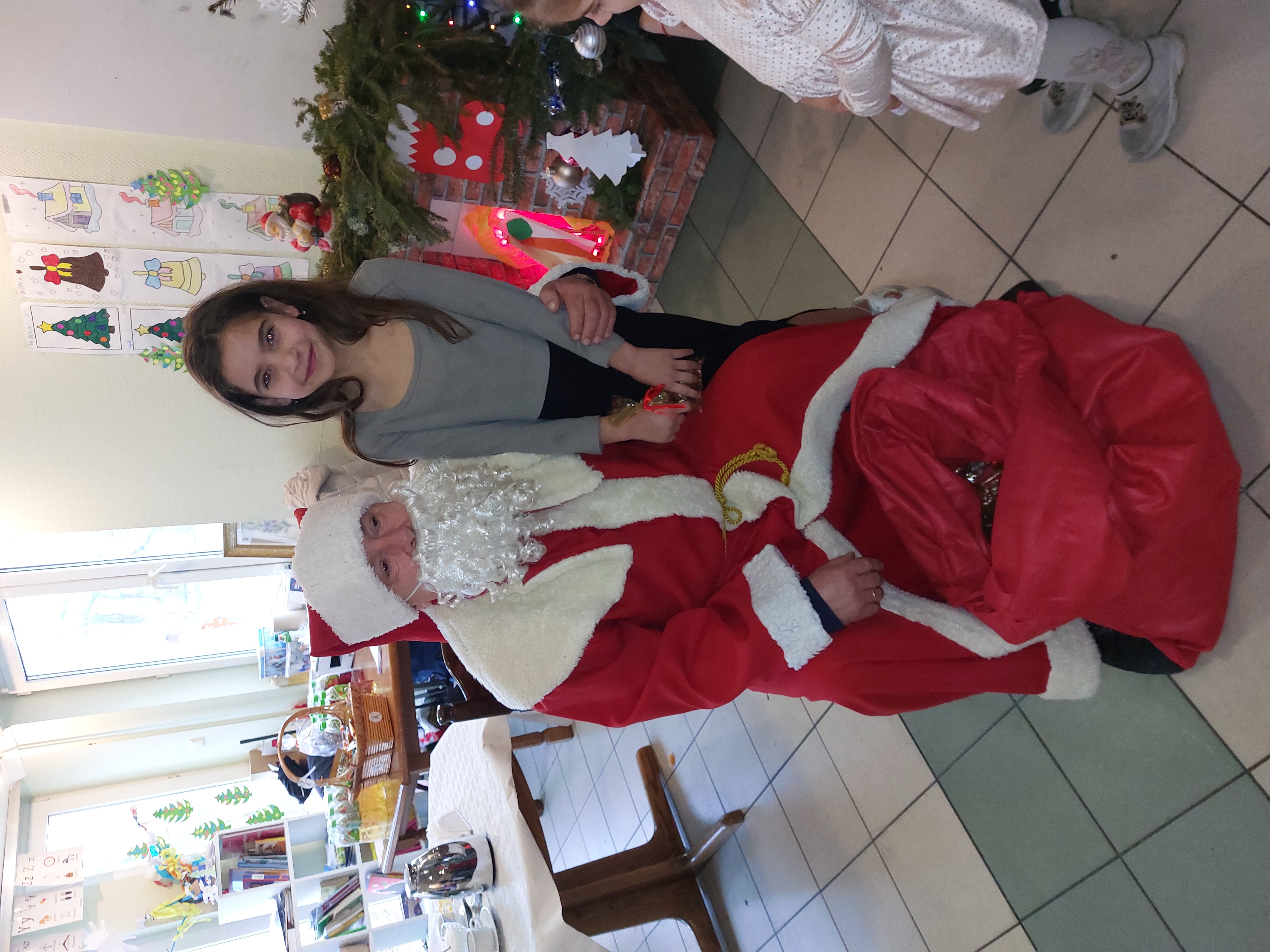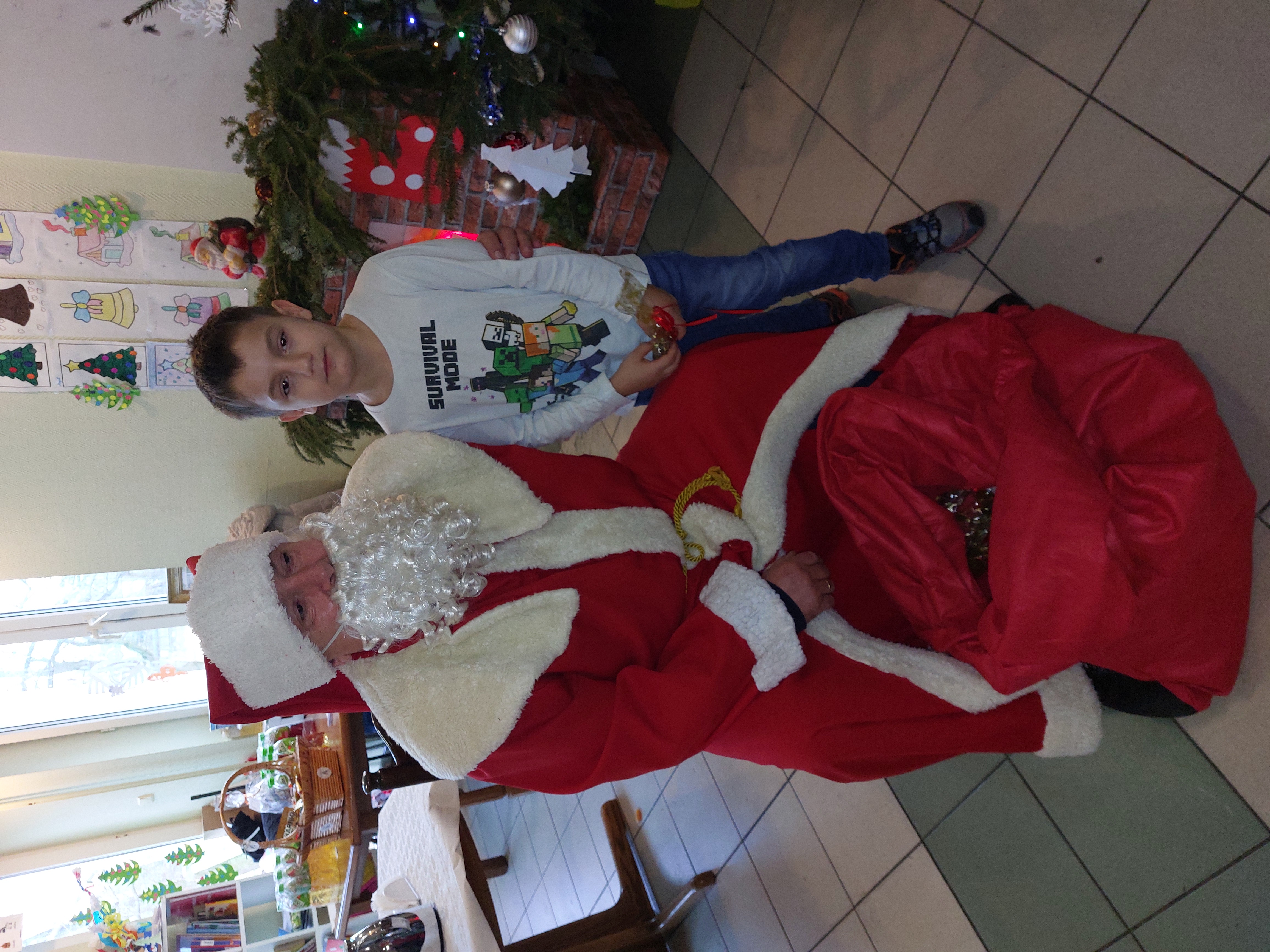 Po występie do uczniów przyjechał Mikołaj ze słodkimi upominkami ufundowanymi przez Gminny Ośrodek Kultury w Nowym Duninowie, Fundację Bez Granic, Stowarzyszenie Lepsze Jutro Mazowsza.