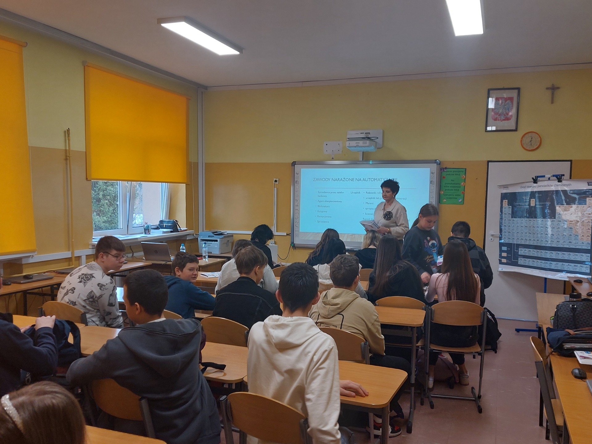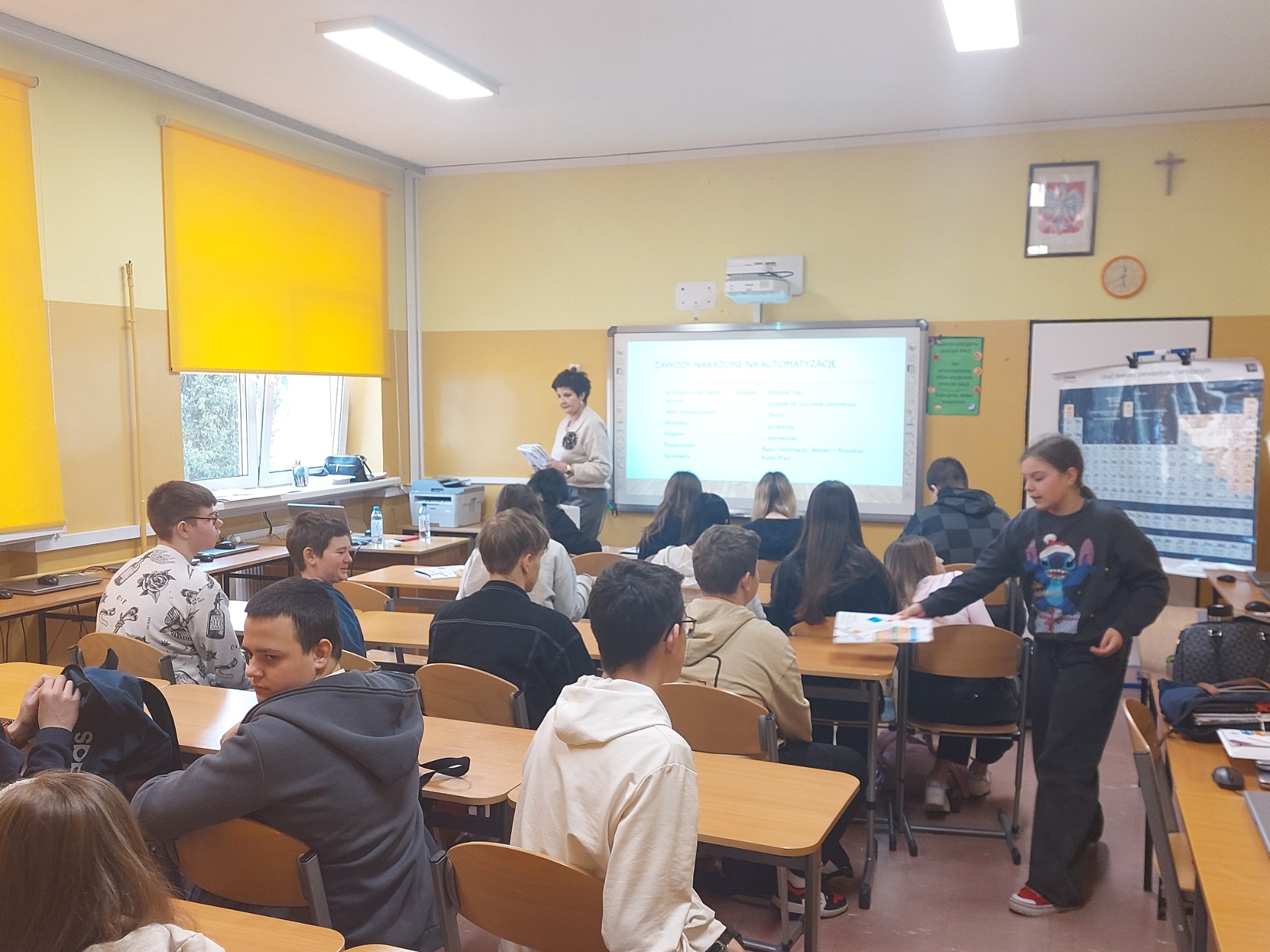Dnia 14 stycznia 2025 roku uczniowie klas VIIa, VIIb, VIIIa, VIIIb wzięli udział w spotkaniu warsztatowo-informacyjnym z doradcą zawodowym Powiatowego Urzędu Pracy w Płocku Panią Agnieszką Barankiewicz. Celem spotkania była ocena istniejących możliwości na lokalnym rynku pracy oraz pomoc w podjęciu trafnej decyzji edukacyjno-zawodowej. Uczniowie zapoznali się z ofertą szkół średnich w regionie. Podczas zajęć omówiono świadome planowanie kariery zawodowej. Uczniowie mieli możliwość indywidualnej rozmowy z doradcą zawodowym Powiatowego Urzędu Pracy. Młodzież dowiedziała się również, że warto wykorzystywać szanse pojawiające się w ich życiu, aby korzystać ze swoich mocnych stron i realizować swoje potrzeby zawodowe. Uczniowie poznali, co młodzi ludzie biorą pod uwagę przy dokonywaniu wyboru zawodu i czym powinni kierować się przy podejmowaniu tej decyzji.