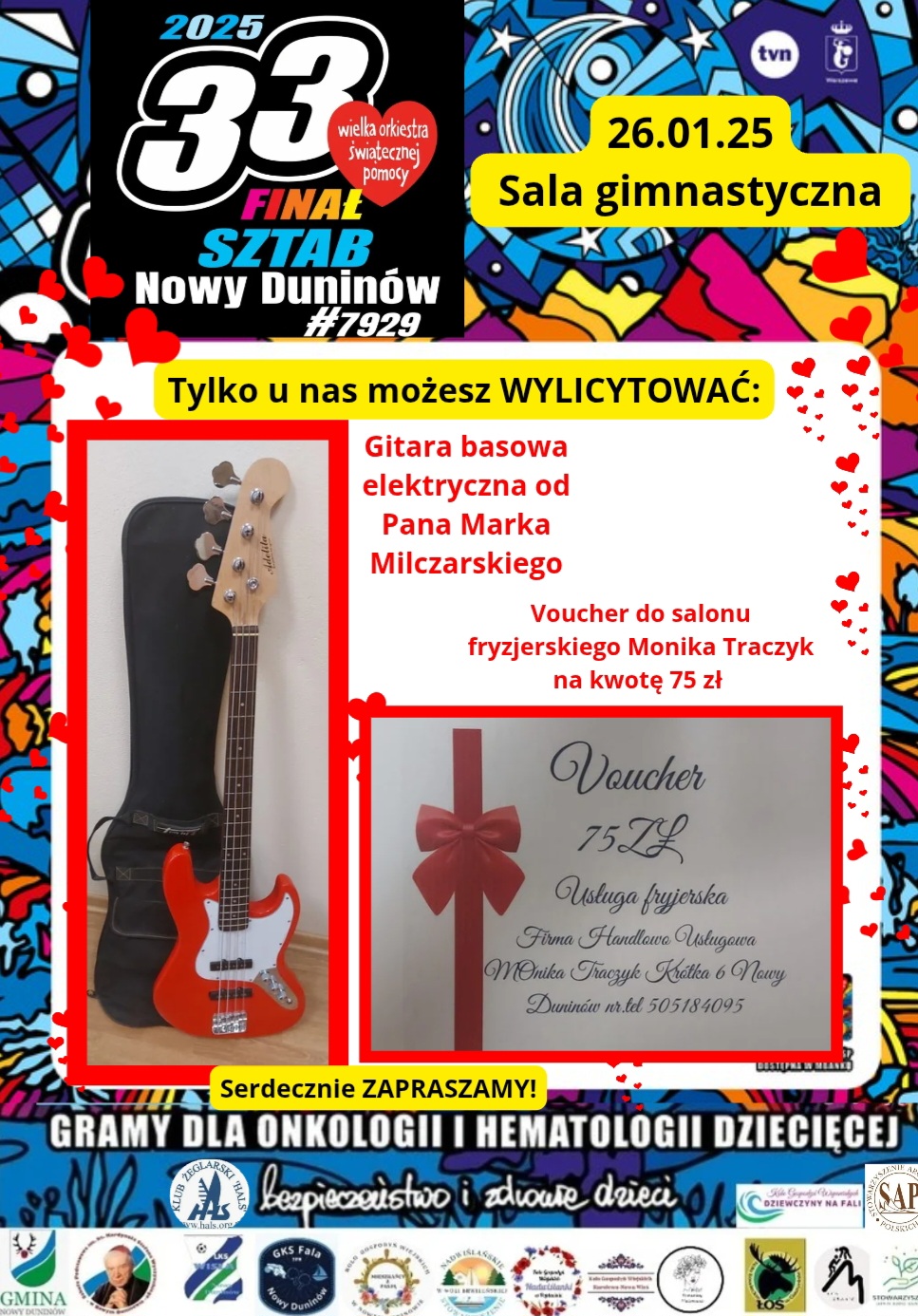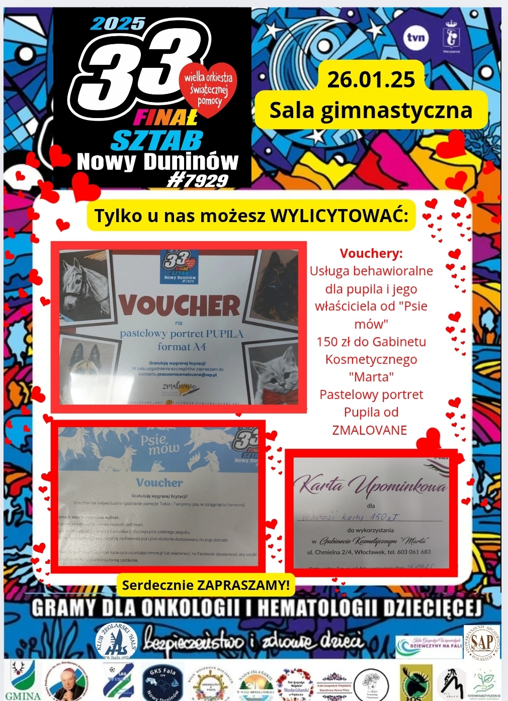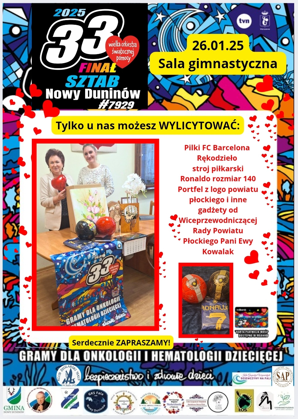 To był już 33. Finał WOŚP na świecie, ale pierwszy u nas, w naszej gminie, w naszej szkole! Szefem sztabu 7929 w Nowym Duninowie była nasza Pani Dyrektor Agnieszka Paradowska. Dzięki wsparciu wielu organizacji gminnych, 26 stycznia 2025 roku razem działaliśmy w słusznej sprawie. Wspólnie zbieraliśmy fundusze, by wspierać rozwój nowoczesnych technologii w służbie zdrowia!