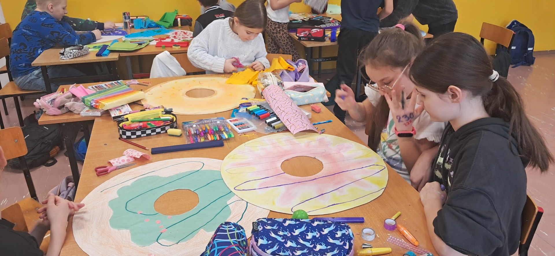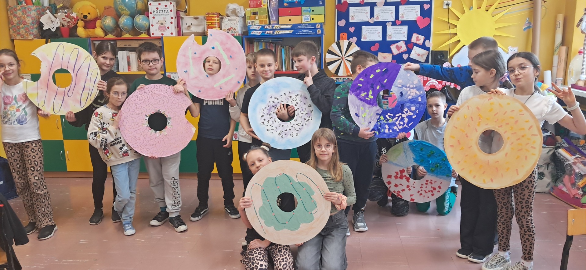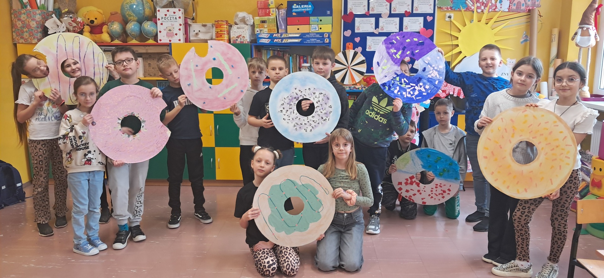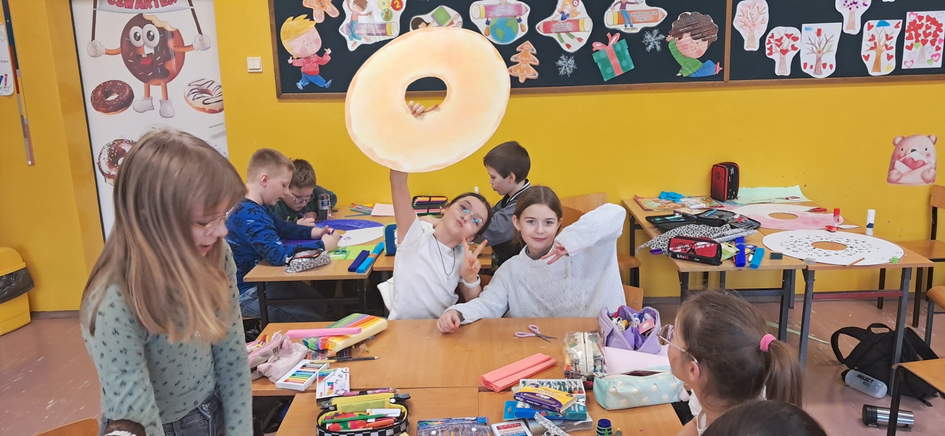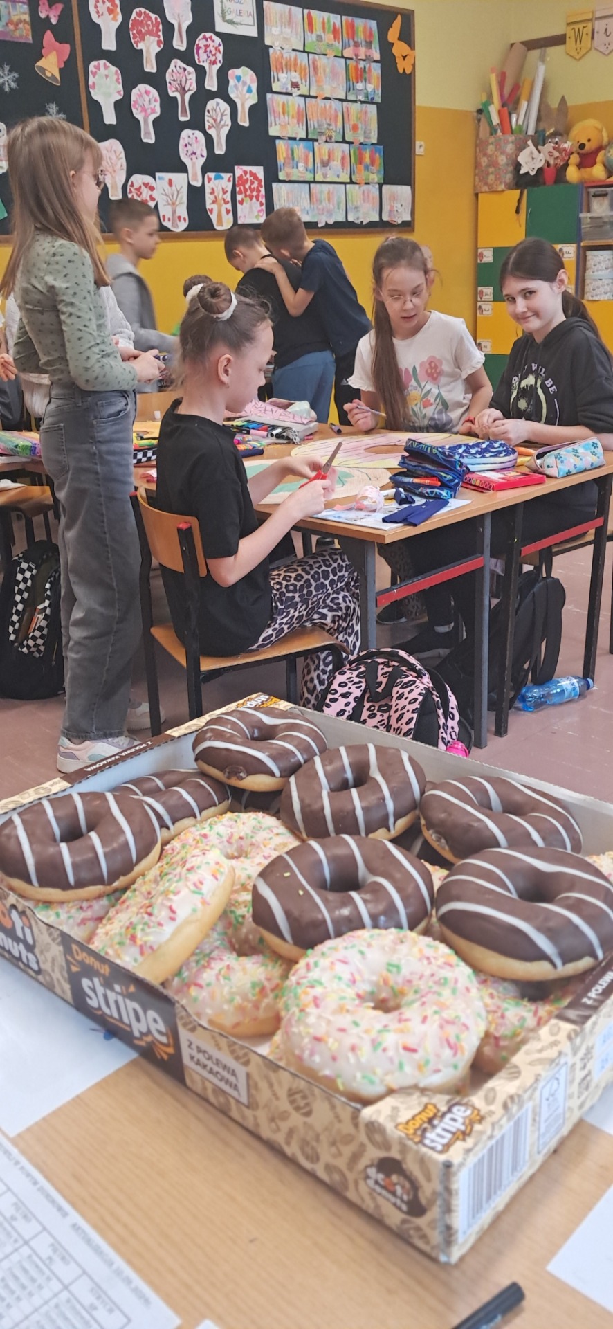 Dzisiejszy dzień wykorzystaliśmy bardzo kreatywnie i pracowicie. Uczniowie III klasy wykonali własne pączki/donuty, z ulubioną polewą czy posypką. Przekąski są piękne.