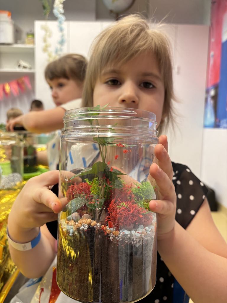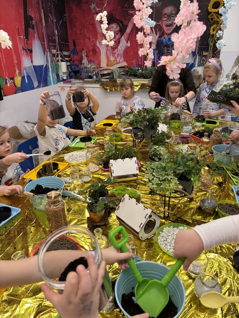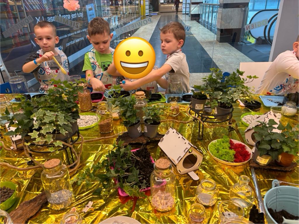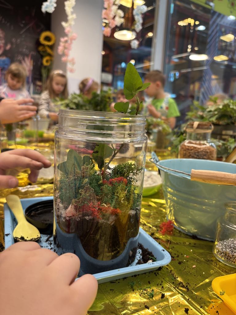 Każde dziecko zamieniło się w małego ogrodnika. Na warsztatach przygotowaliśmy kompozycję roślin, która przypomina miniaturowy ogród hodowany w zamkniętym słoiku.