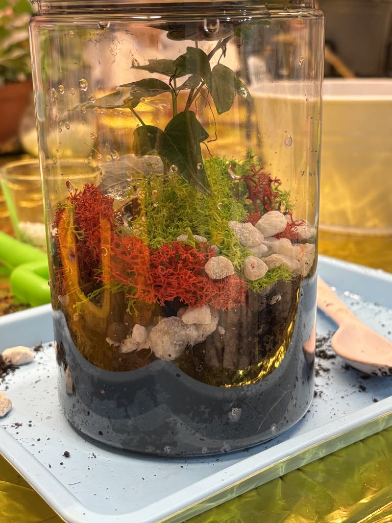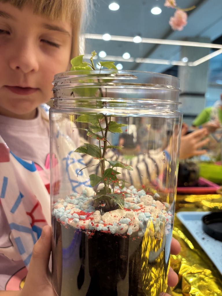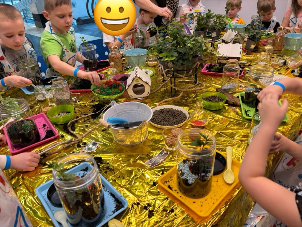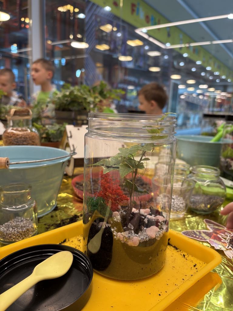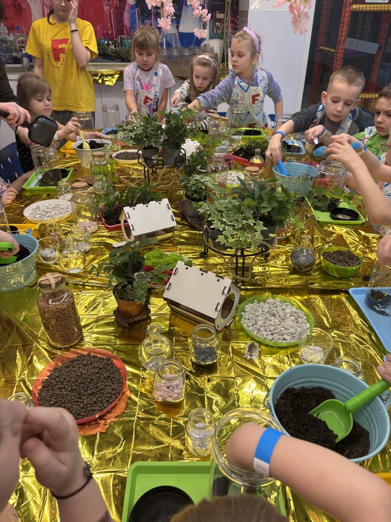 Każde dziecko zamieniło się w małego ogrodnika. Na warsztatach przygotowaliśmy kompozycję roślin, która przypomina miniaturowy ogród hodowany w zamkniętym słoiku.