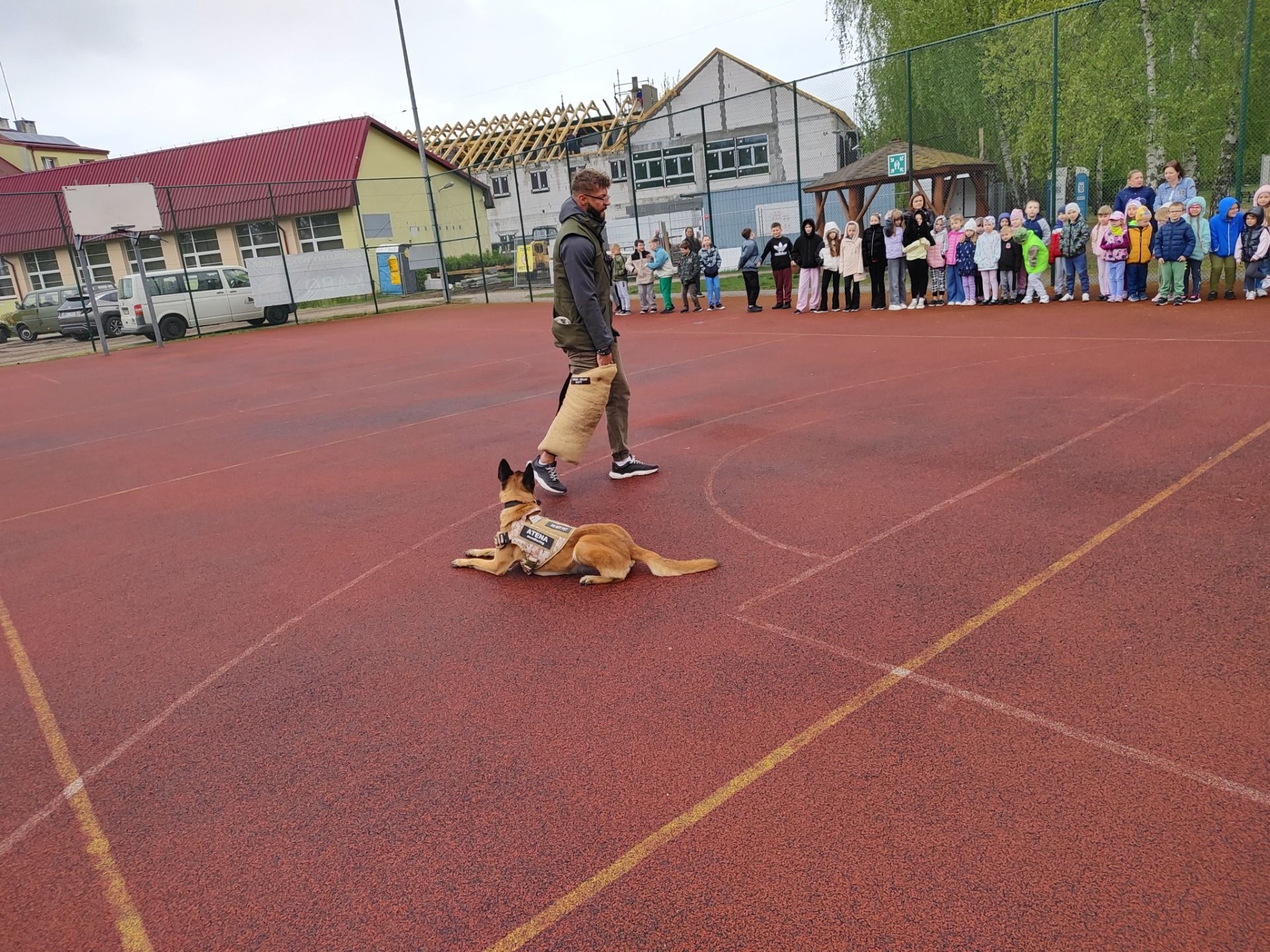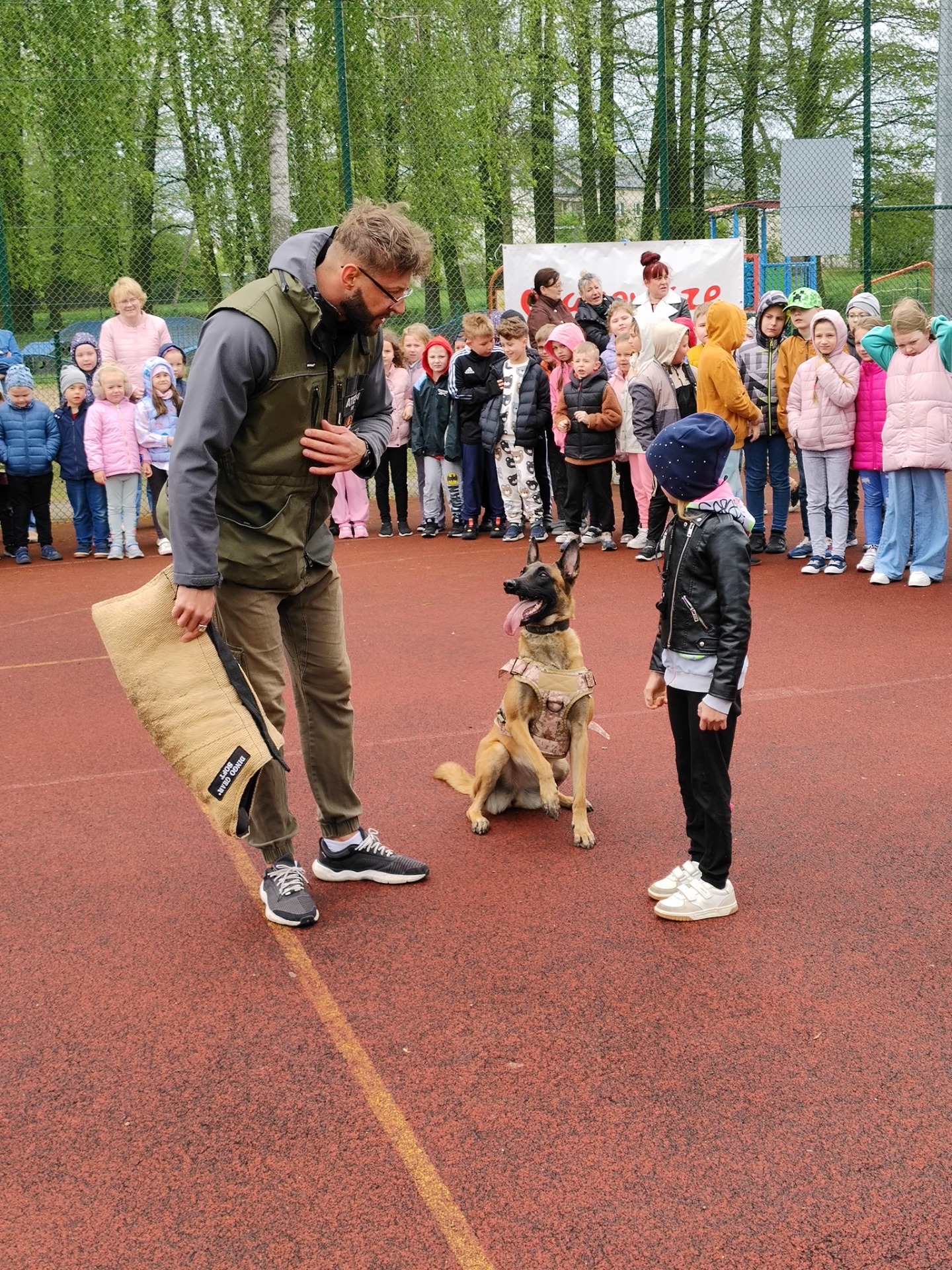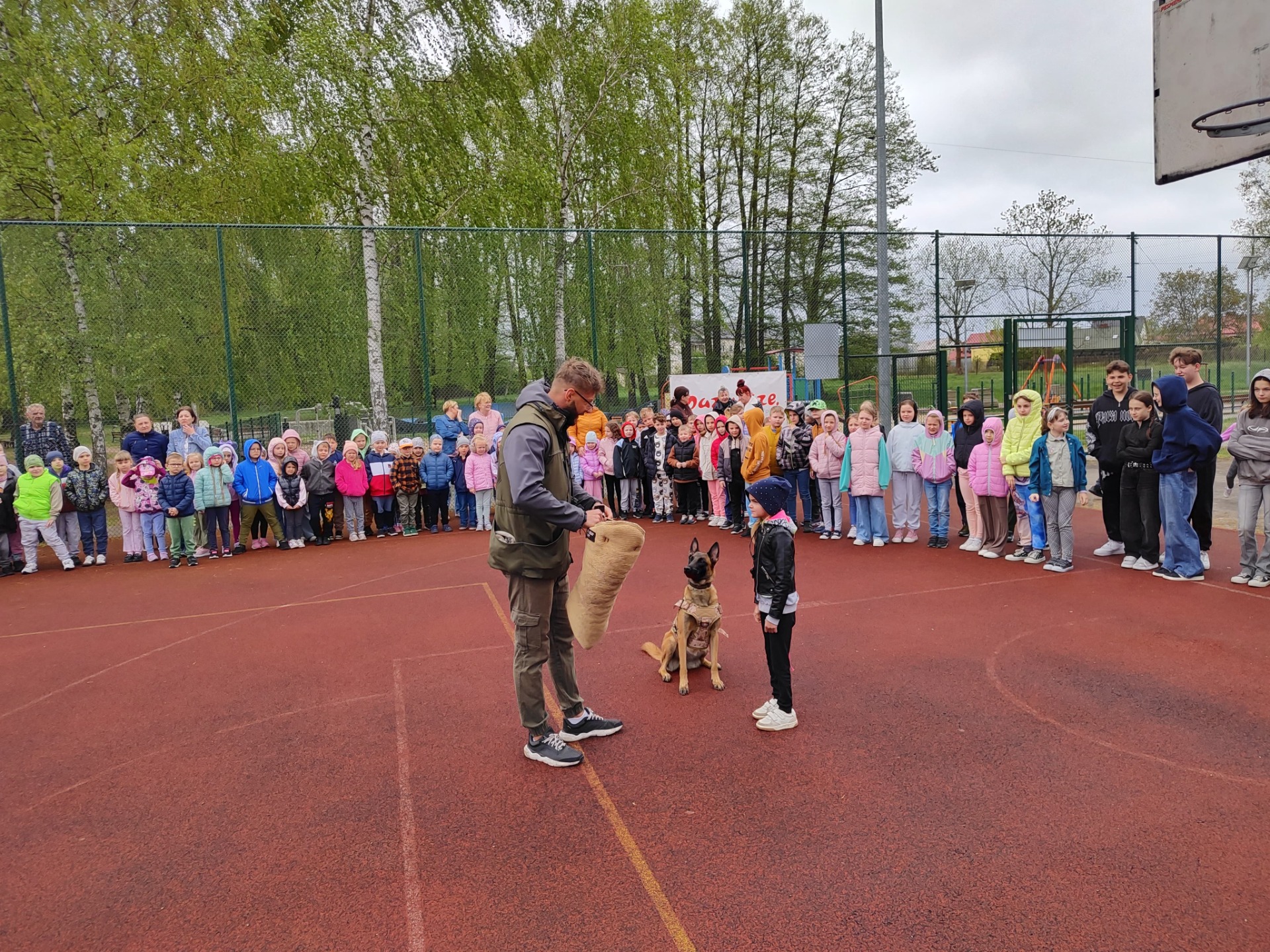 W dniu dzisiejszym wspólnie z Fundacją dla Bezpieczeństwa, Dzielnicowym Panem Marcinem Wolińskim oraz innymi gośćmi uczestniczyliśmy w zajęciach o bezpieczeństwie na drodze. Na wstępie, Pan Hubert, który jest policjantem KMP Płock, a także trenerem psów zaprezentował nam umiejętności swojego psa Ateny. Pan Hubert ze swoim owczarkiem belgijskim i córką Eleną pokazali nam elementy posłuszeństwa, komendy ataku i obrony.
