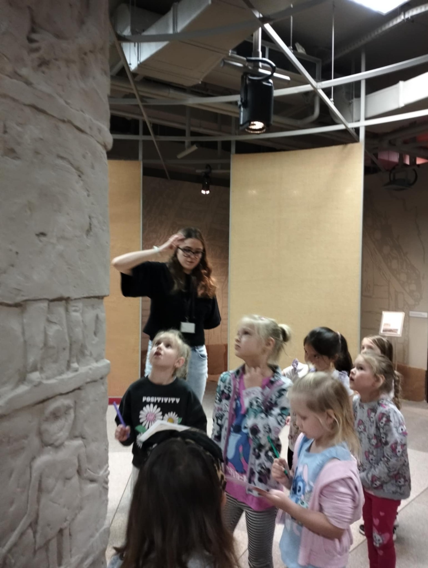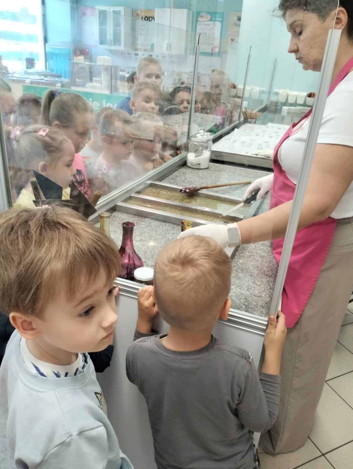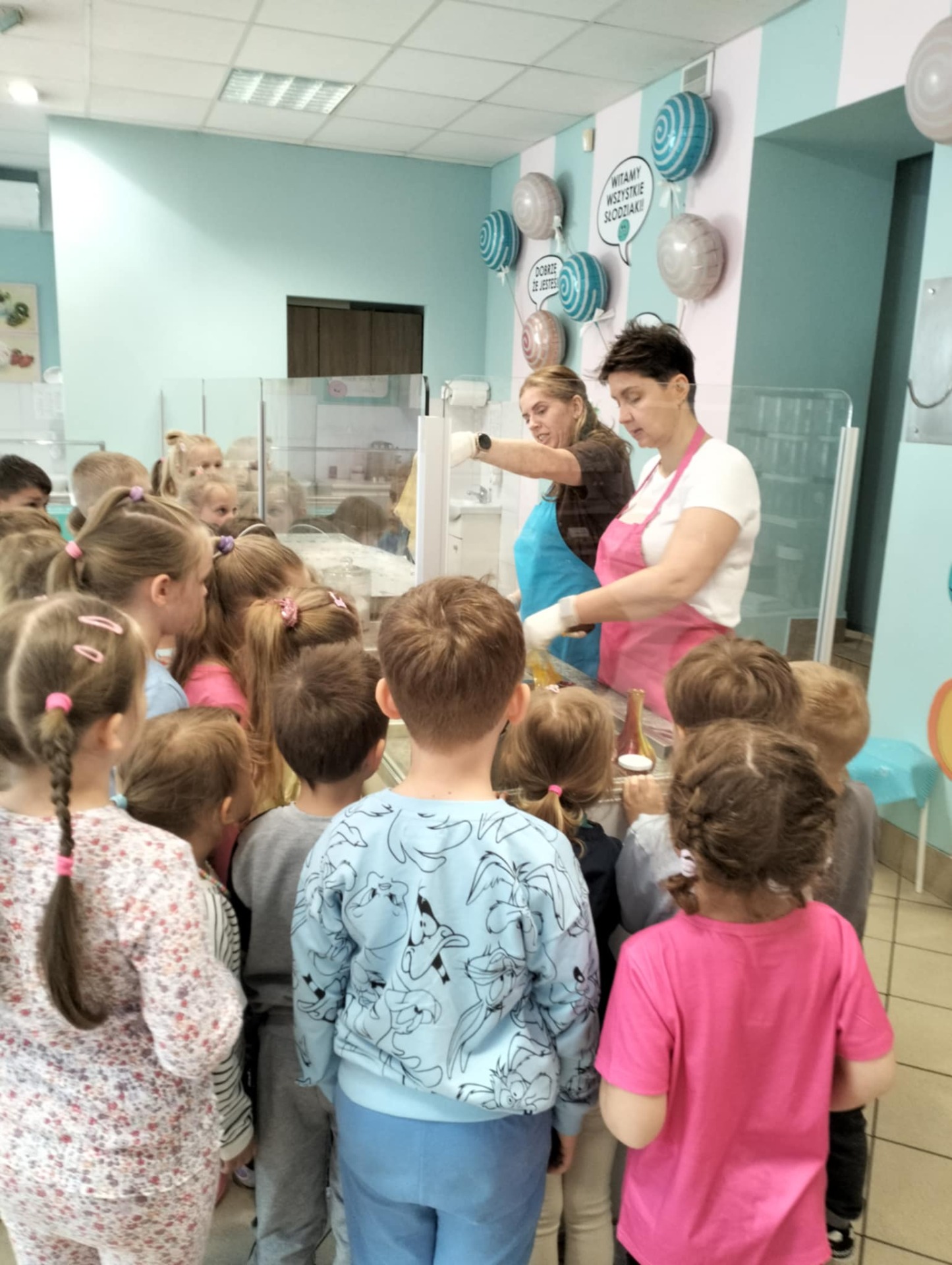 Pierwszym punktem była wizyta w Manufakturze Słodyczy - dzieci dowiedziały się czym różni się manufaktura od fabryki , jak powstaje karmel bezbarwny i kolorowy . Na koniec każdy własnoręcznie zrobił słodziutkiego lizaczka. Następnym punktem programu było Muzeum Mazowieckie. Przedszkolaki wzięły udział w muzealnej lekcji ze zwierzętami. Rozpoznawały, nazywały zwierzęta a potem szukały ukrytych w ekspozycjach muzealnych. Dowiedziały się także że na terenie Płocka można poszukiwać kotów tak jak np.we Wrocławiu krasnali. To była bardzo ciekawa wycieczka.