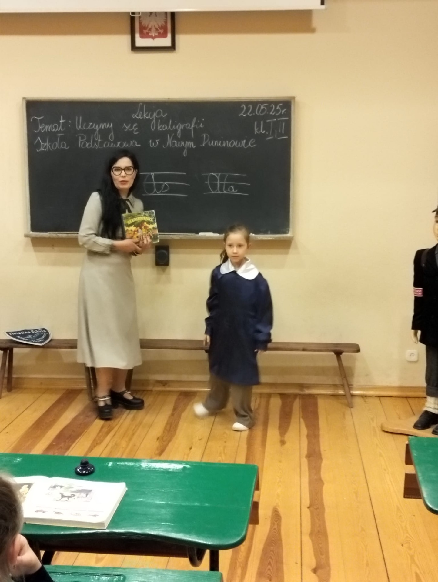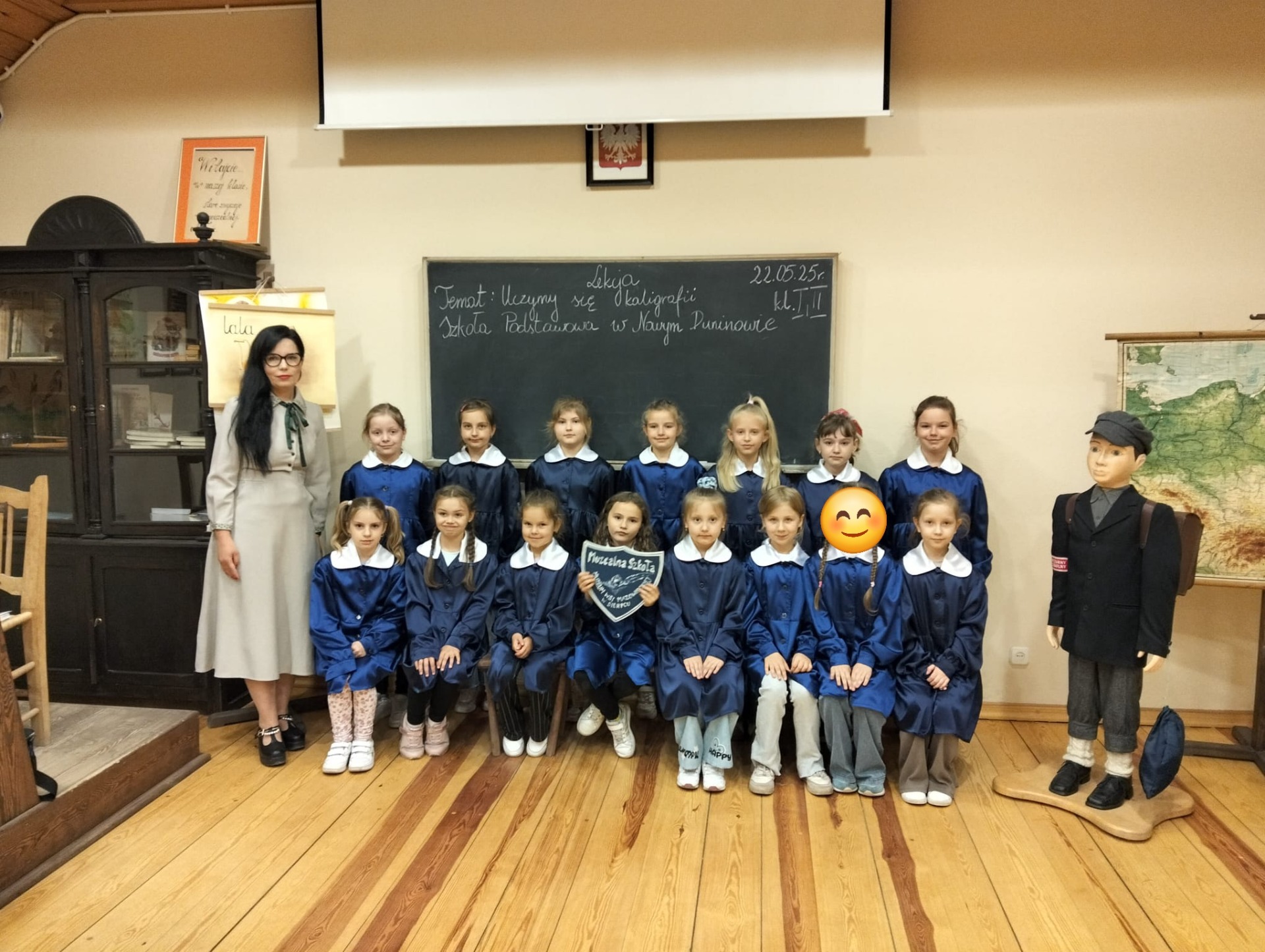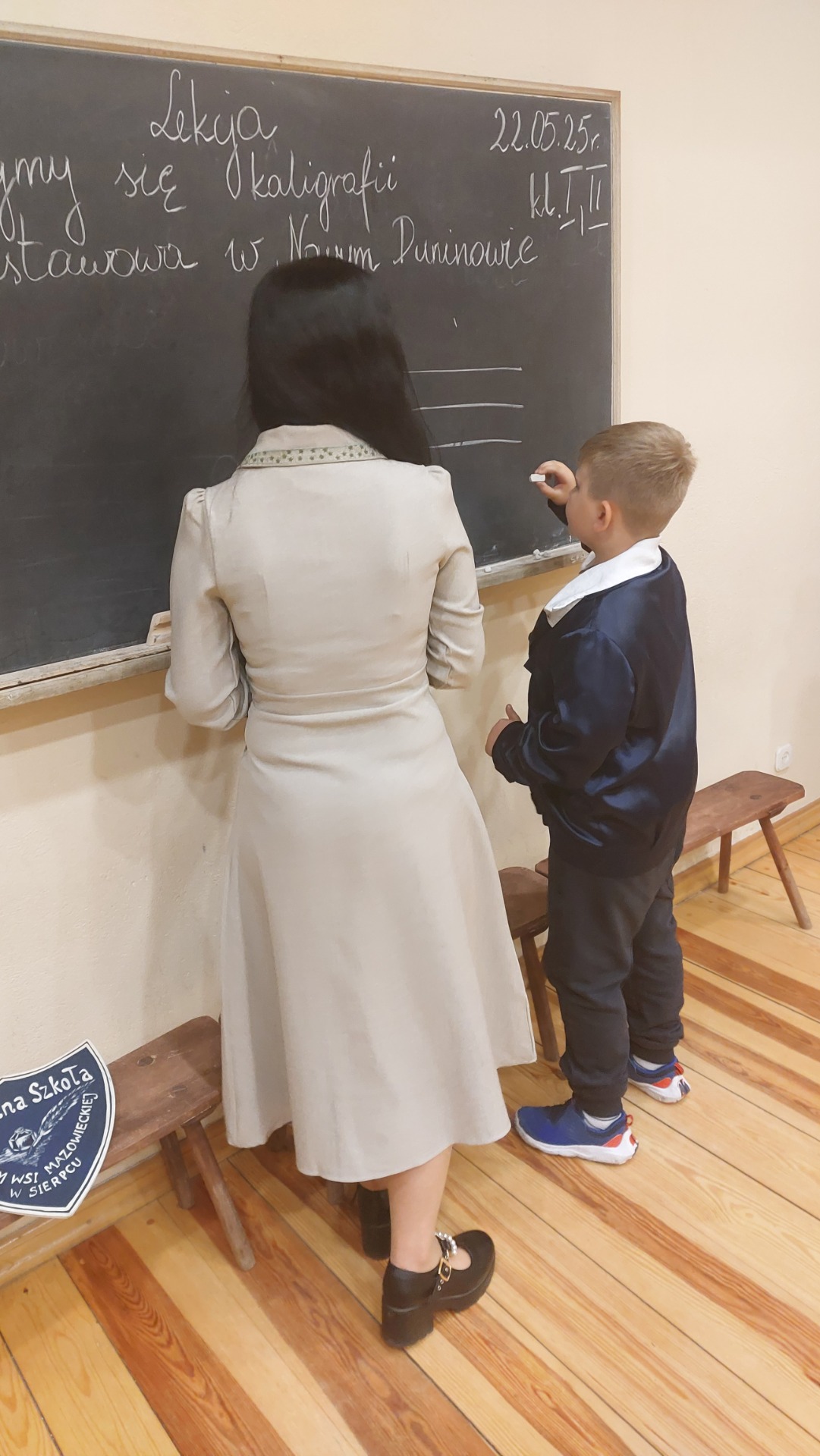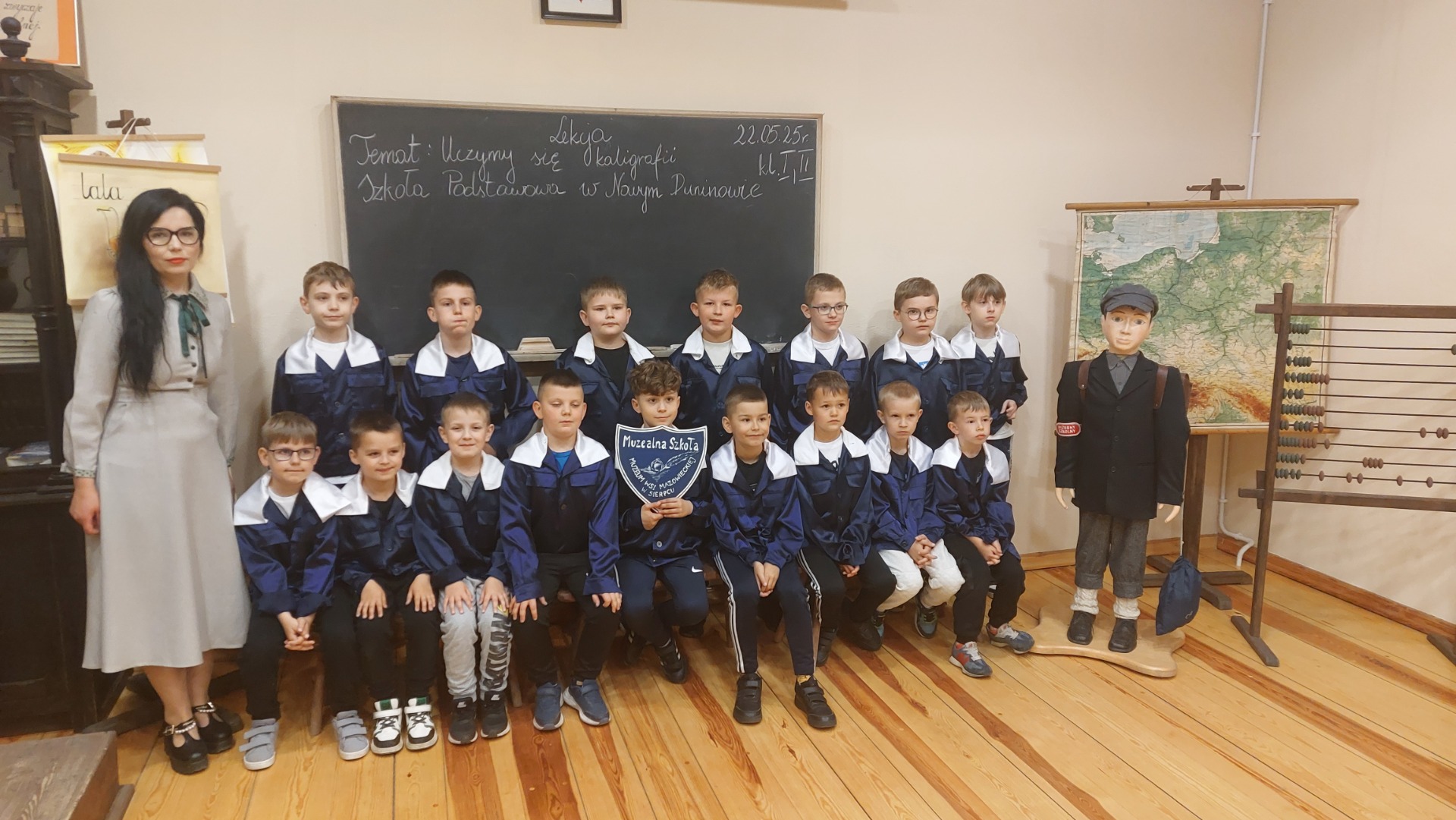 W dniu 22 maja 2025 r. uczniowie klas I i II Szkoły Podstawowej w Nowym Duninowie uczestniczyli w wycieczce do Muzeum Wsi Mazowieckiej w Sierpcu. Dzieci wzięły udział w niezwykle ciekawej lekcji kaligrafii – ubrane w szkolne mundurki sprzed lat, pisały piórem i atramentem, poznając dawne szkolne zwyczaje. W ramach zwiedzania muzeum uczestniczyły również w grze terenowej, która pozwoliła im w sposób aktywny odkrywać tajemnice mazowieckiej wsi. Wielką atrakcją była przejażdżka wozem konnym oraz możliwość zakupu pamiątek. Na zakończenie wycieczki dzieci odwiedziły restaurację McDonald’s, a drogę powrotną umilały sobie wspólnym, radosnym śpiewem w autobusie. Wycieczka dostarczyła wszystkim wielu niezapomnianych wrażeń i była okazją do nauki poprzez zabawę.